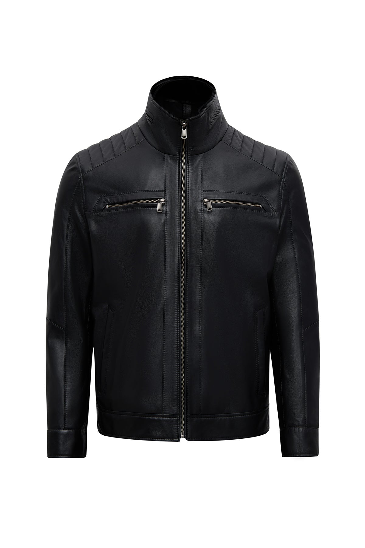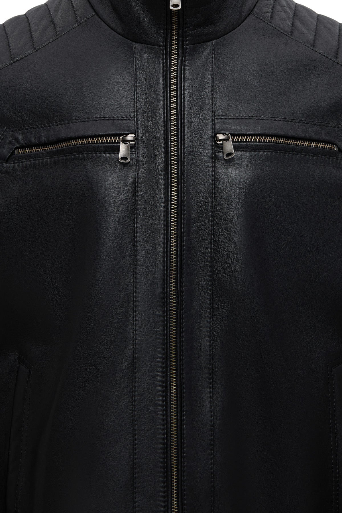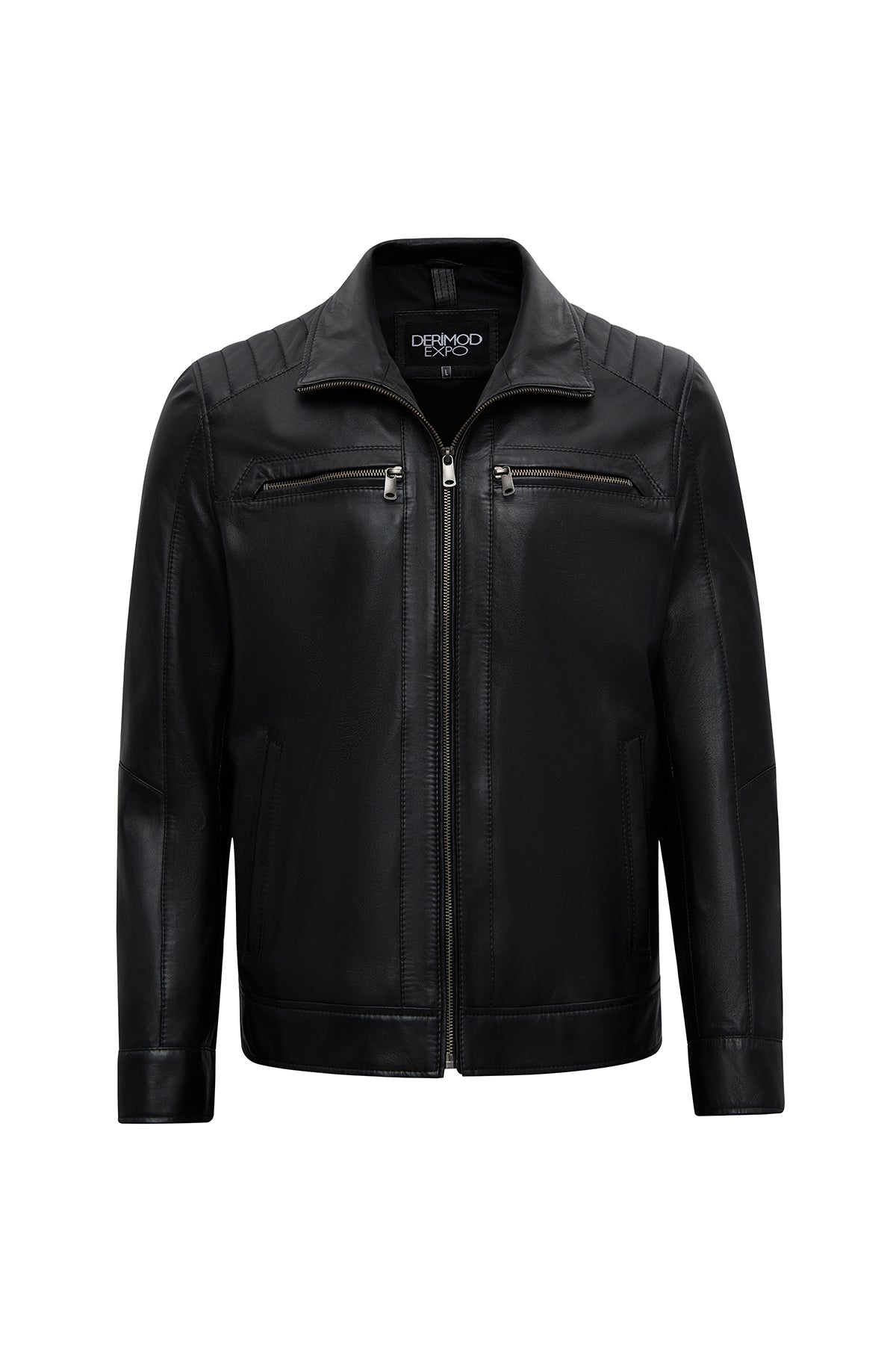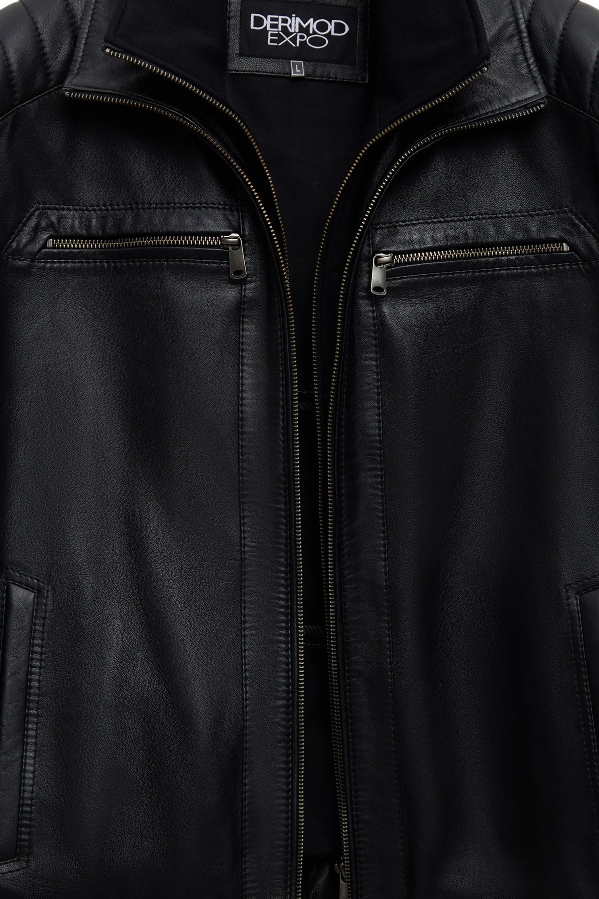 This men's jacket, featuring a classic motorcycle jacket aesthetic with a black leather surface, stands out with its turn-down collar detail and multi-zipper design. The asymmetrical zipper placement is the main character of this men's leather jacket, while the diagonal zipper line extending from the left shoulder to the lower right edge creates a dynamic look. This zippered men's jacket features a functional design with four external pockets: two zippered pockets on the chest and two side pockets at the bottom. The regular fit silhouette provides an anatomical fit at the shoulder line and offers a proportionate cut that conforms to the body shape. The turn-down collar characteristic is complemented by a structural form that holds the collar upright, and prominent stitching is noticeable along the collar edges. The short men's jacket length ends at waist level with a straight cut. The black leather surface has a matte texture and a fine-grained structure. The inner lining is made of textile material and is designed in a lighter color than the outer leather tone. Metal zippers and snap details create a harmonious contrast with the black color. Suitable for layering in cool weather conditions. Product code: 25WGE65951M