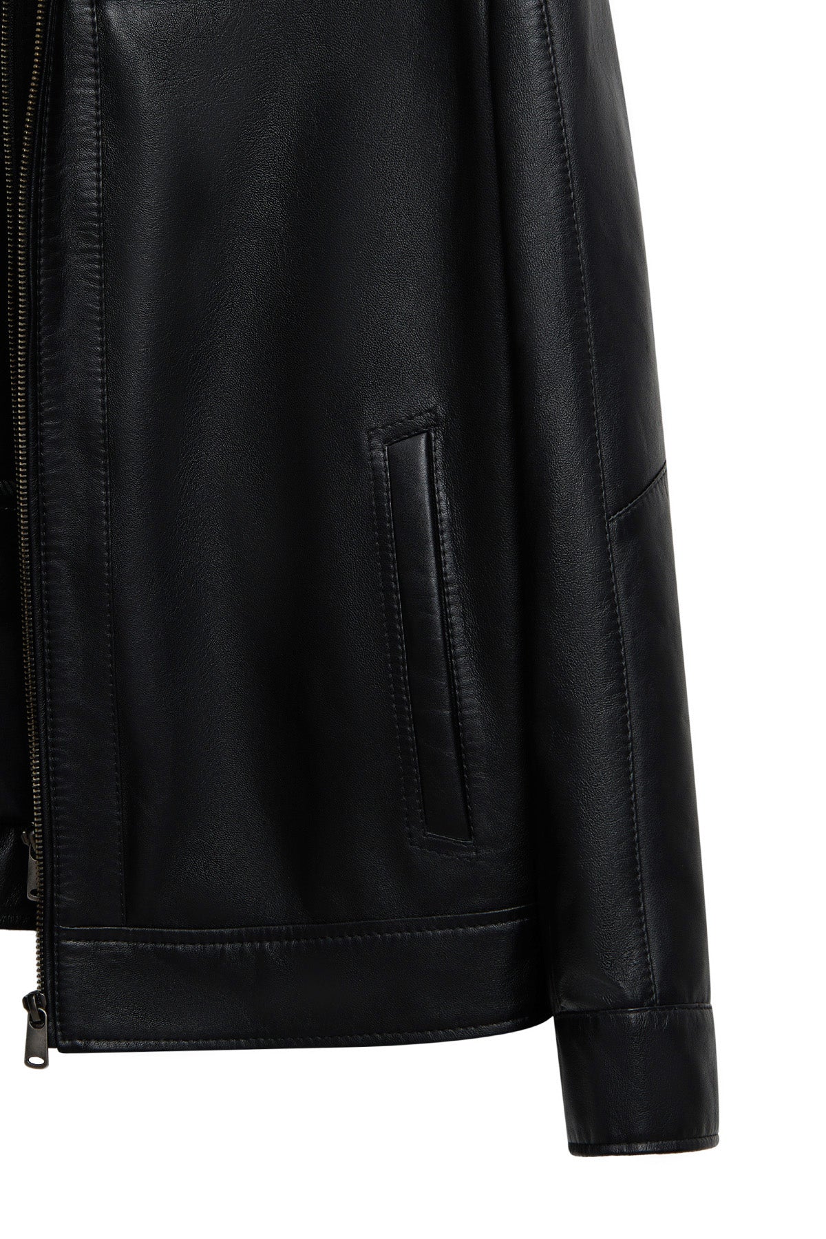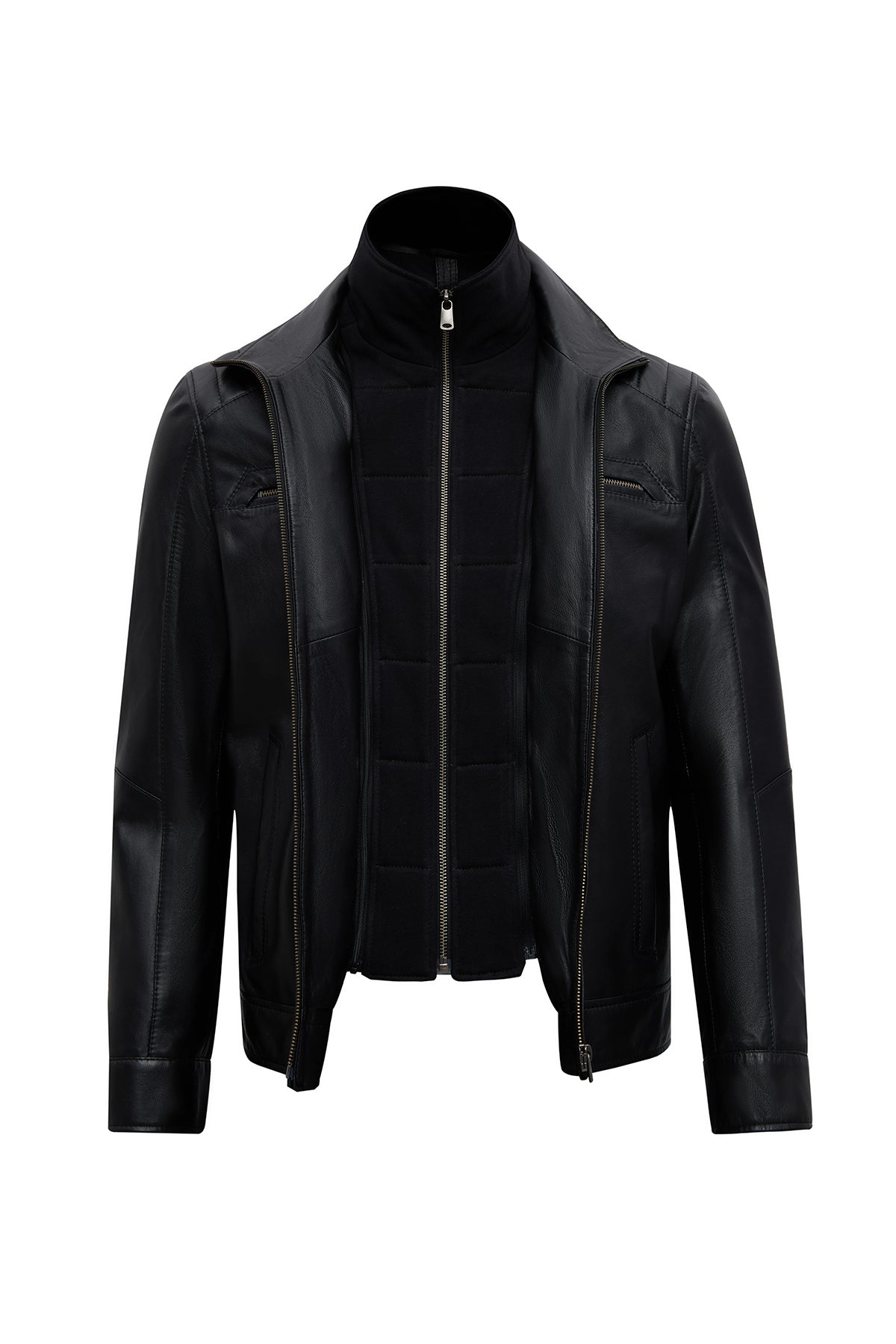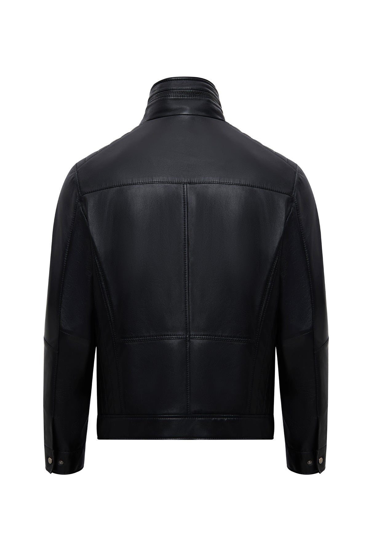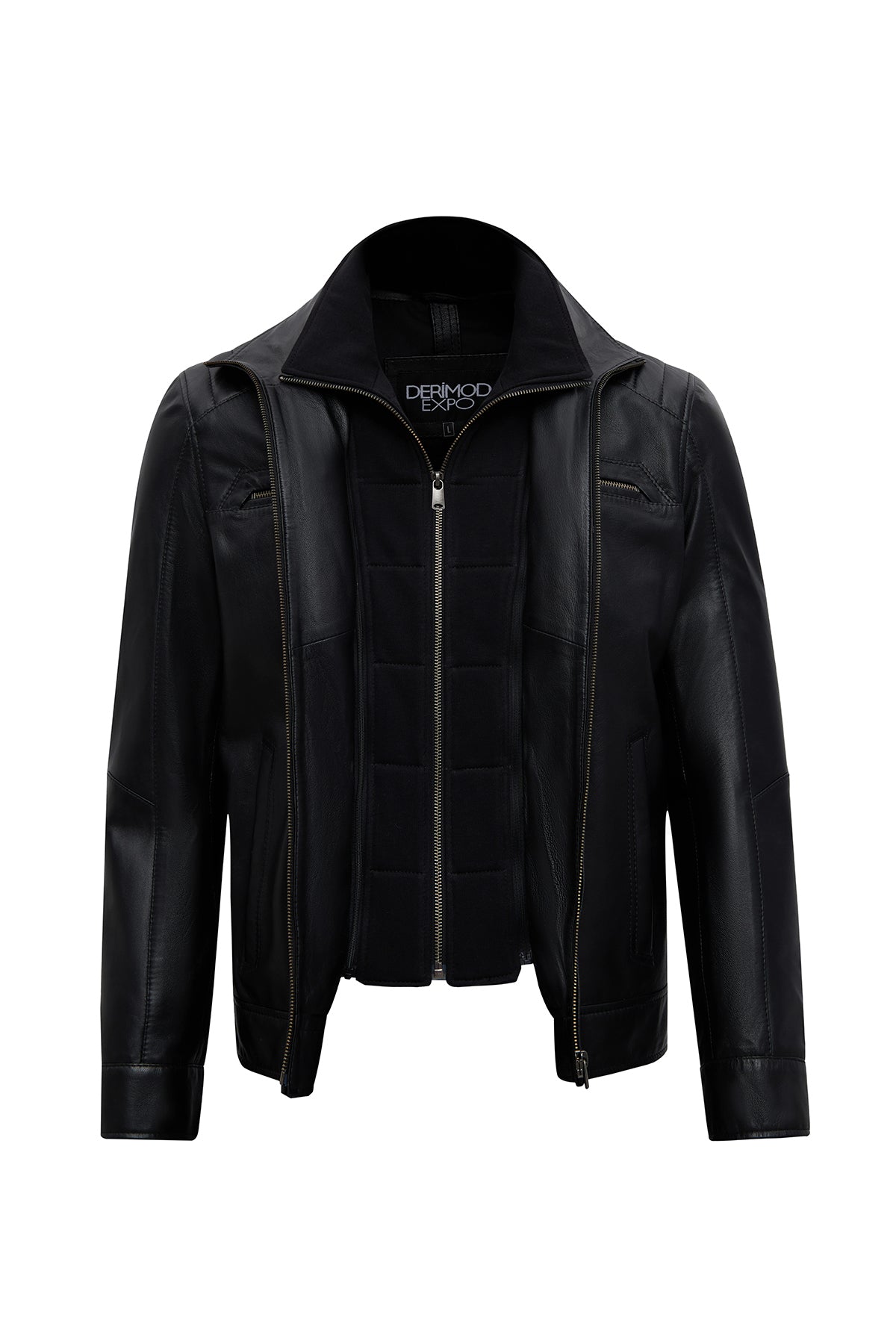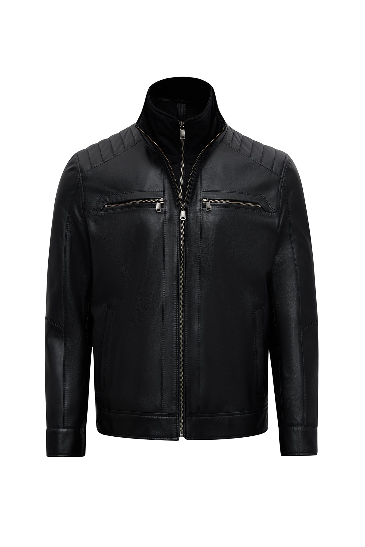 This men's jacket, featuring a classic motorcycle jacket aesthetic with a black leather surface, stands out with its turn-down collar detail and multi-zipper design. The asymmetrical zipper placement is the main character of this men's leather jacket, while the diagonal zipper line extending from the left shoulder to the lower right edge creates a dynamic look. This zippered men's jacket features a functional design with four external pockets: two zippered pockets on the chest and two side pockets at the bottom. The regular fit silhouette provides an anatomical fit at the shoulder line and offers a proportionate cut that conforms to the body shape. The turn-down collar characteristic is complemented by a structural form that holds the collar upright, and prominent stitching is noticeable along the collar edges. The short men's jacket length ends at waist level with a straight cut. The black leather surface has a matte texture and a fine-grained structure. The inner lining is made of textile material and is designed in a lighter color than the outer leather tone. Metal zippers and snap details create a harmonious contrast with the black color. Suitable for layering in cool weather conditions. Product code: 25WGE65951M