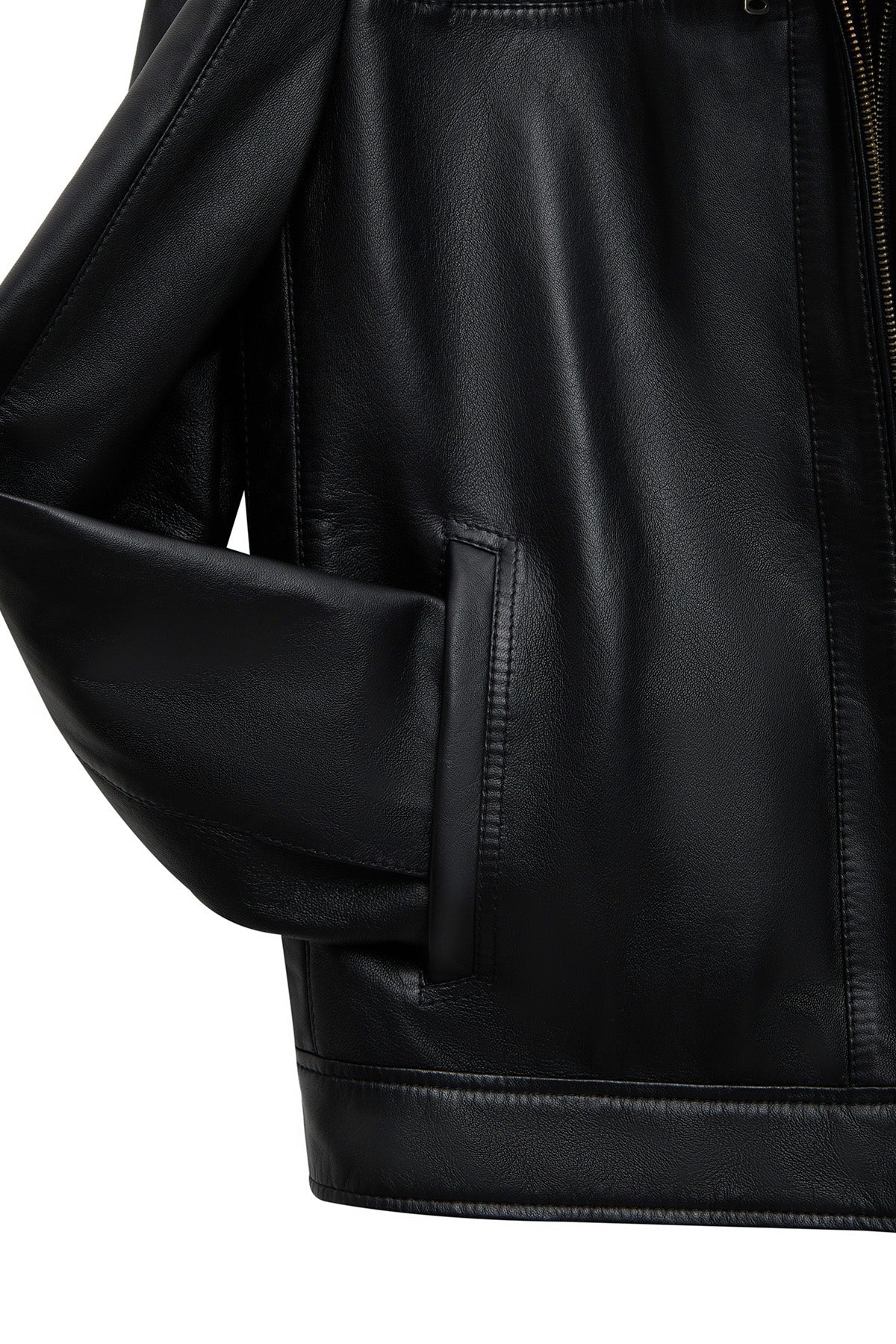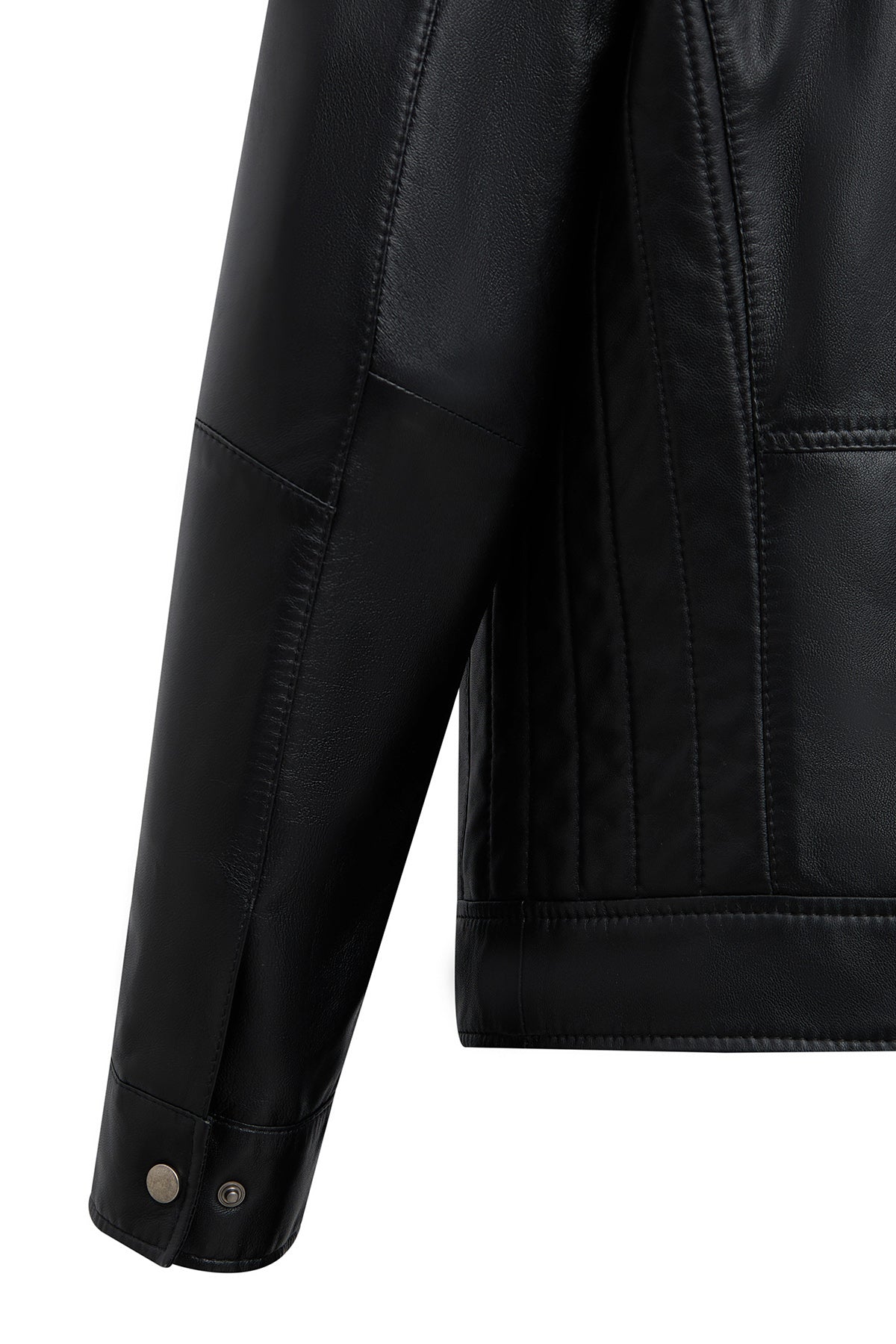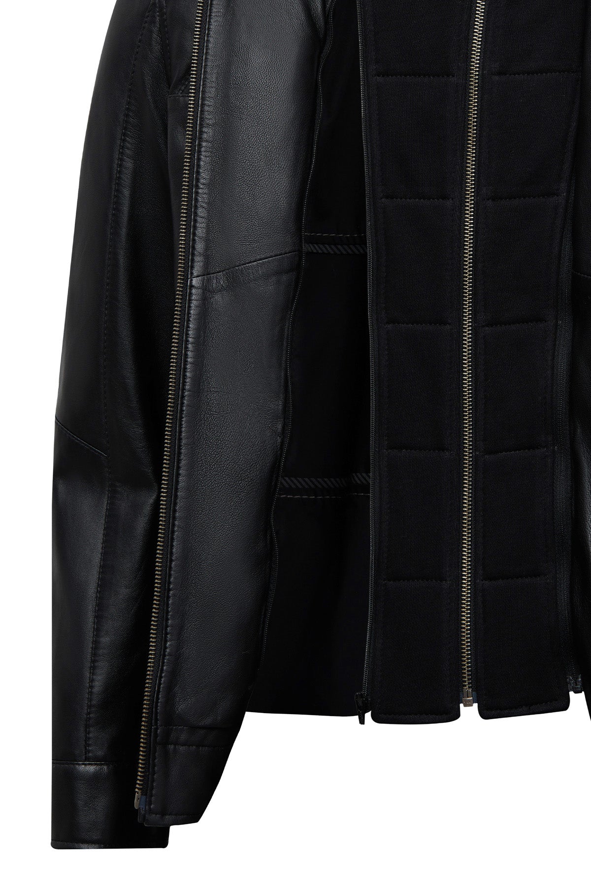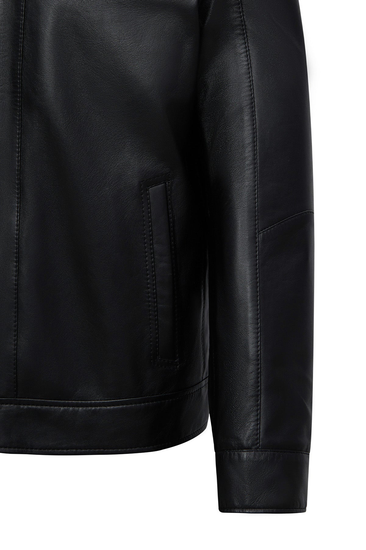 This men's jacket, featuring a classic motorcycle jacket aesthetic with a black leather surface, stands out with its turn-down collar detail and multi-zipper design. The asymmetrical zipper placement is the main character of this men's leather jacket, while the diagonal zipper line extending from the left shoulder to the lower right edge creates a dynamic look. This zippered men's jacket features a functional design with four external pockets: two zippered pockets on the chest and two side pockets at the bottom. The regular fit silhouette provides an anatomical fit at the shoulder line and offers a proportionate cut that conforms to the body shape. The turn-down collar characteristic is complemented by a structural form that holds the collar upright, and prominent stitching is noticeable along the collar edges. The short men's jacket length ends at waist level with a straight cut. The black leather surface has a matte texture and a fine-grained structure. The inner lining is made of textile material and is designed in a lighter color than the outer leather tone. Metal zippers and snap details create a harmonious contrast with the black color. Suitable for layering in cool weather conditions. Product code: 25WGE65951M