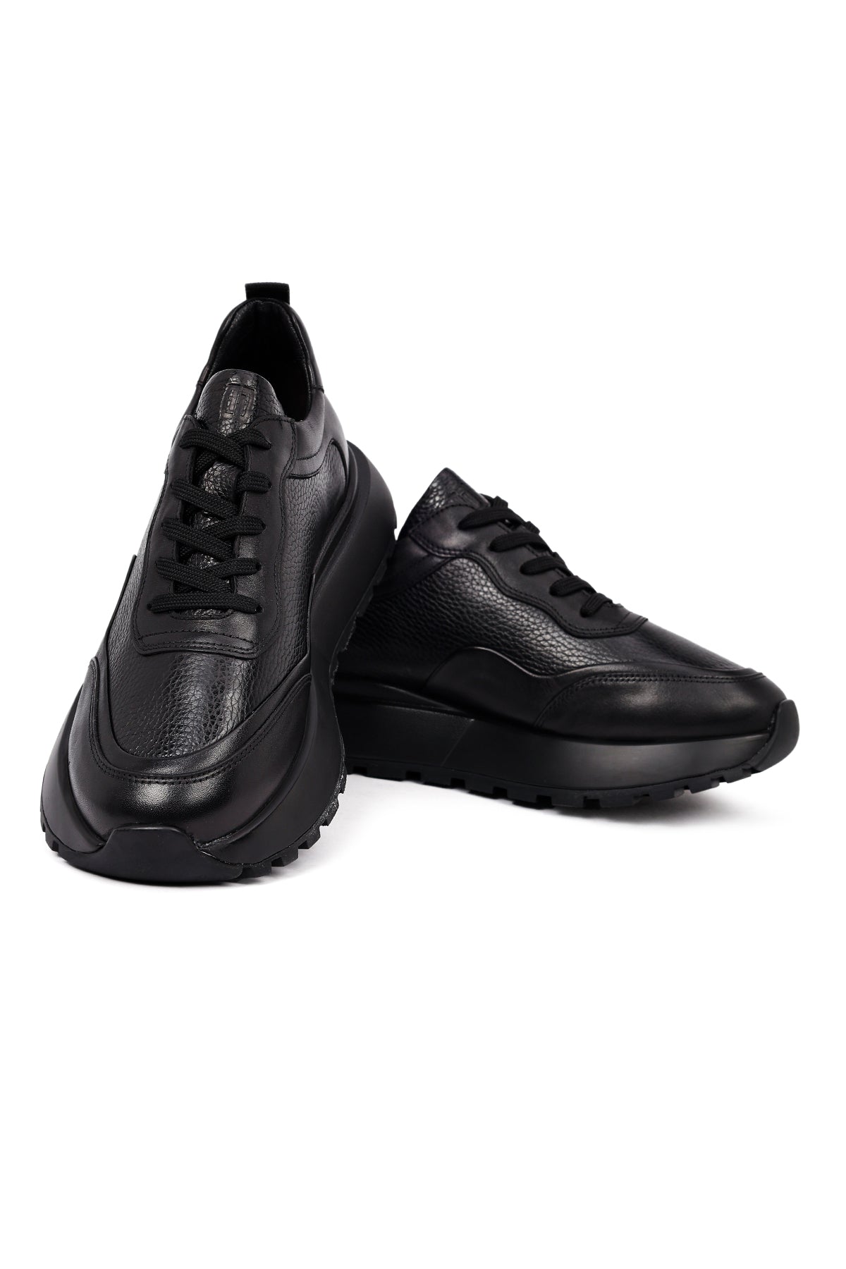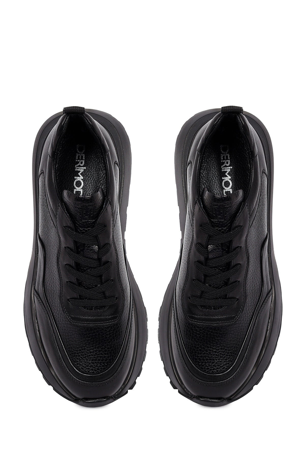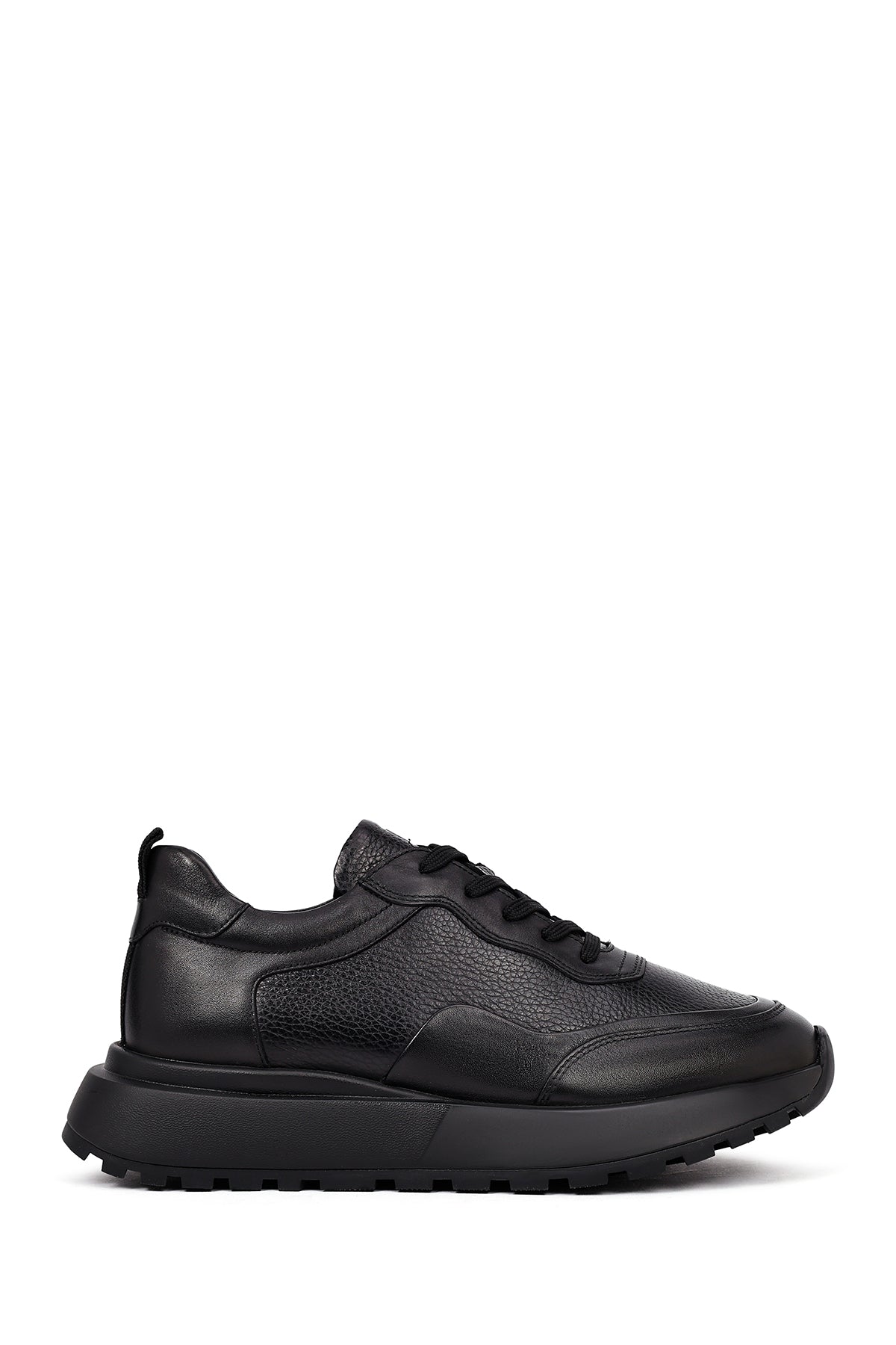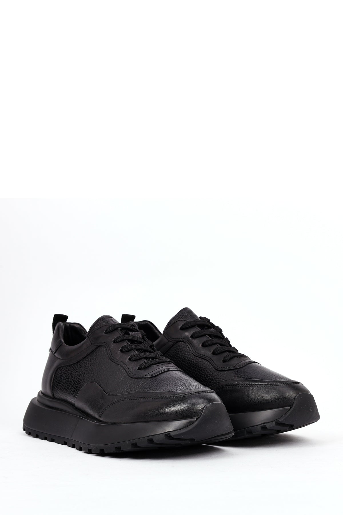 **Turkish Description:** The men's black lace-up thick-soled leather sneaker from Derimod's winter collection is one of the indispensable pieces of modern men's fashion. Produced with mixed leather features, the model offers both durability and elegance. The black color perfectly matches every style of clothing, and the 2.5 cm heel height provides an ideal walking experience for daily use. Thanks to its lace-up design, it fits perfectly on the foot, while the thick sole structure is an important representative of modern streetwear style. The model, with leather inner lining, offers breathability and long-term comfort of use, providing protection against cold weather conditions in winter months. The shoe in the casual sneaker category can be comfortably preferred at the office, daily activities, shopping, and social events. With its quality craftsmanship and timeless design, it is an investment piece that will remain in the wardrobe for many years. While keeping feet warm on cold winter days, it can also be easily combined in spring and autumn months.