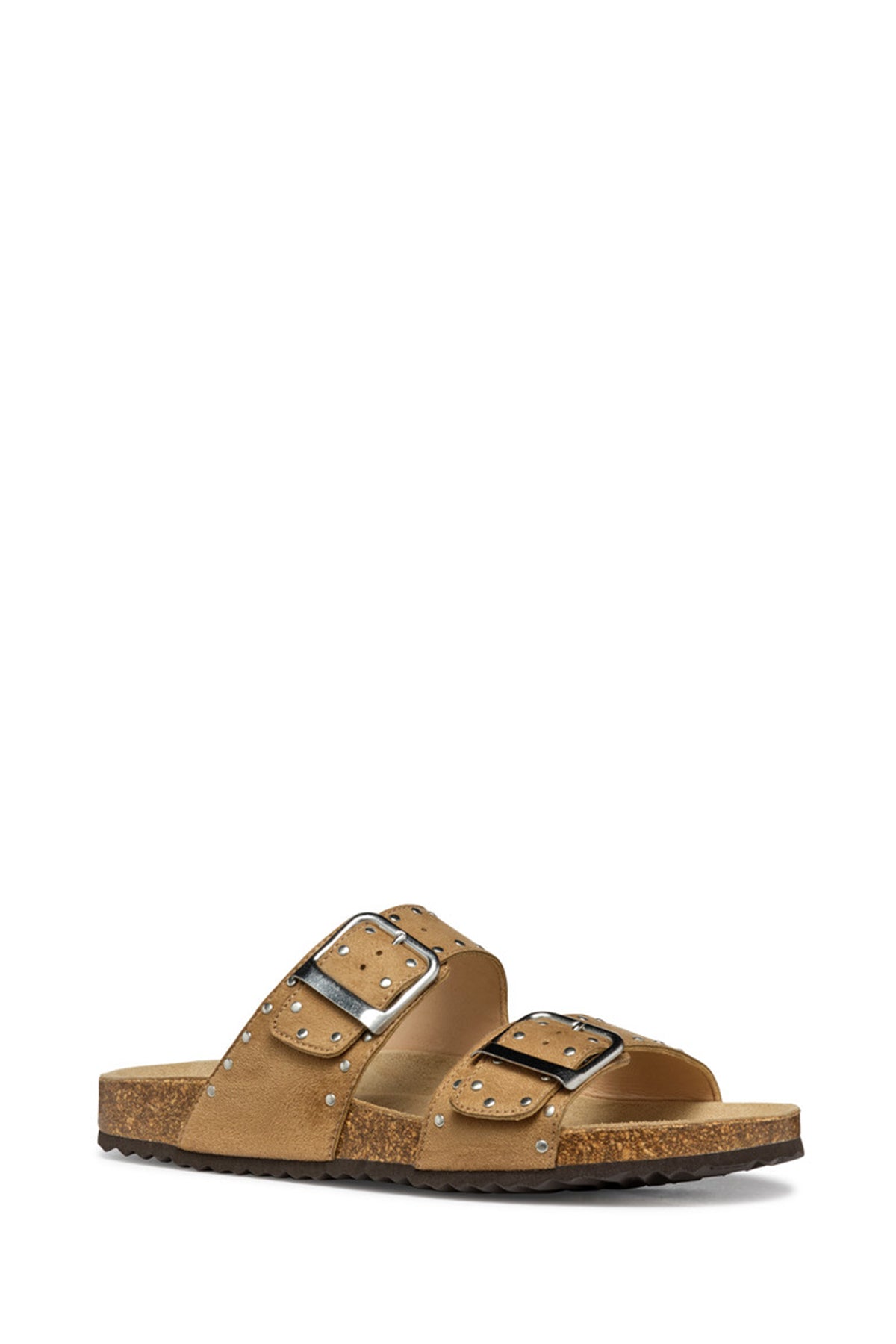 Geox Women Beige Brionia R Double Buckle Suede Leather Slippers
