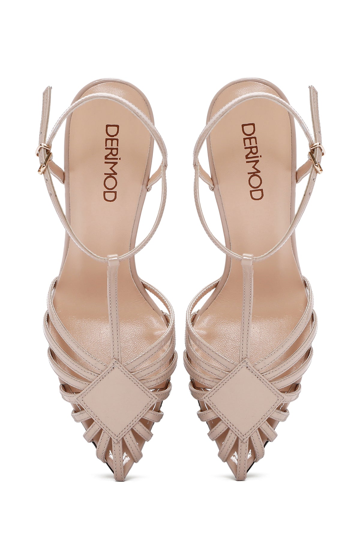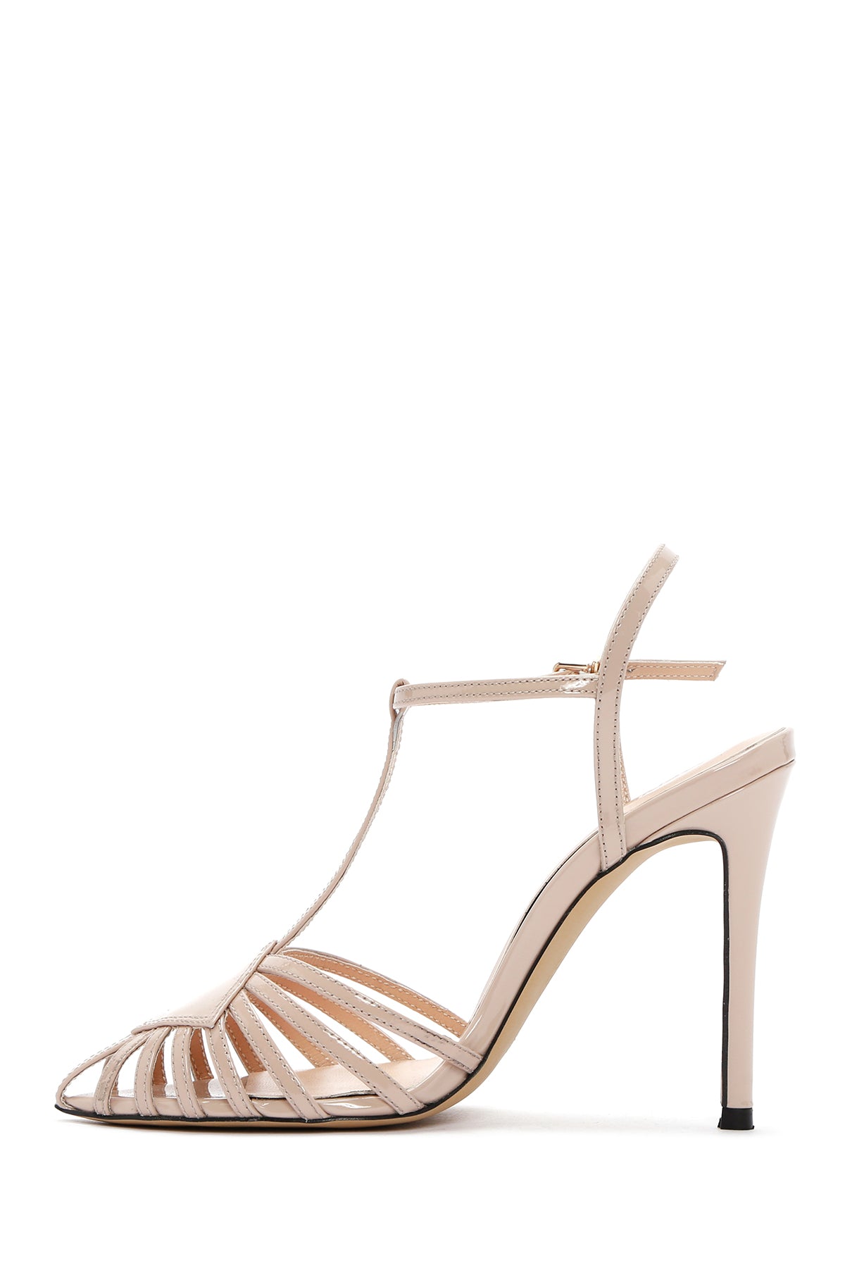 Women's Beige Ankle Strap Thin Heeled Patent Leather Sandals