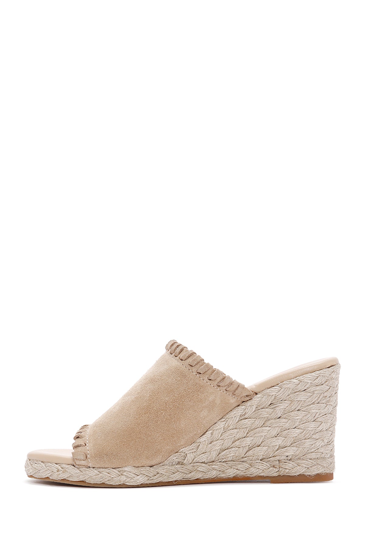 Women's Beige Wedge Heeled Suede Leather Espadrille Slippers