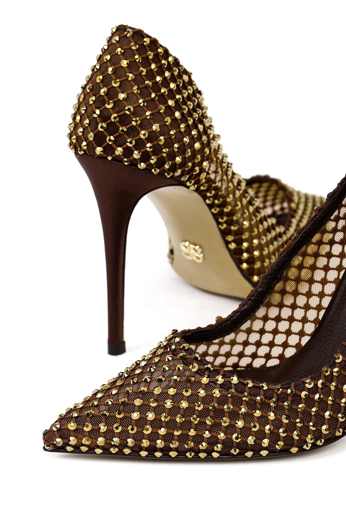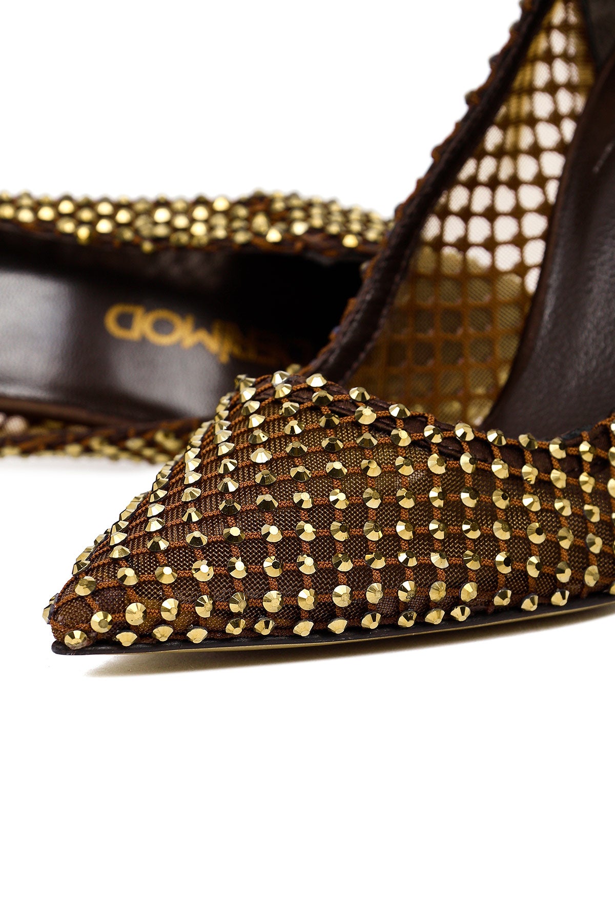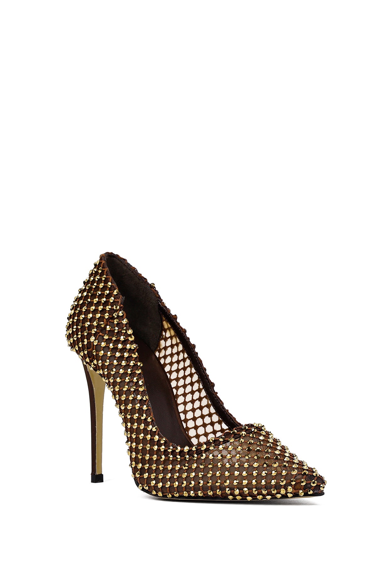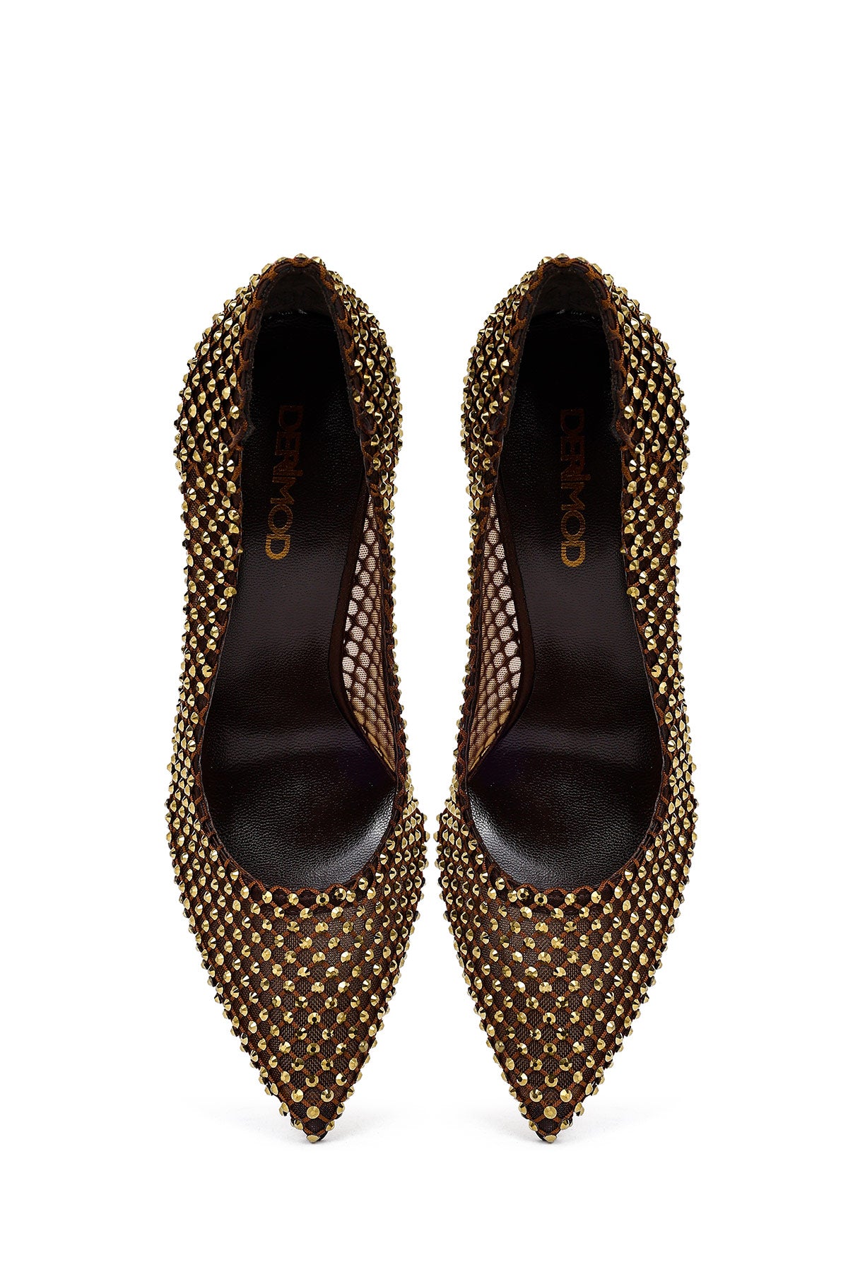 From Derimod's autumn collection, the stiletto model offers a dazzling look with stone details processed on bronze-colored leather, presenting an elegant stance with its 10 cm high slim heel. The model, which achieves a luxurious appearance with gold-colored stone embellishments covering the entire surface, offers a stylish design with leather inner lining. The pointed toe form makes the foot look elegant, and the stiletto provides a wide range of use from dresses to suits, skirts to trousers. It can be preferred for special occasions such as private invitations, weddings, and dinner parties. Product code: 25AFD1206TS