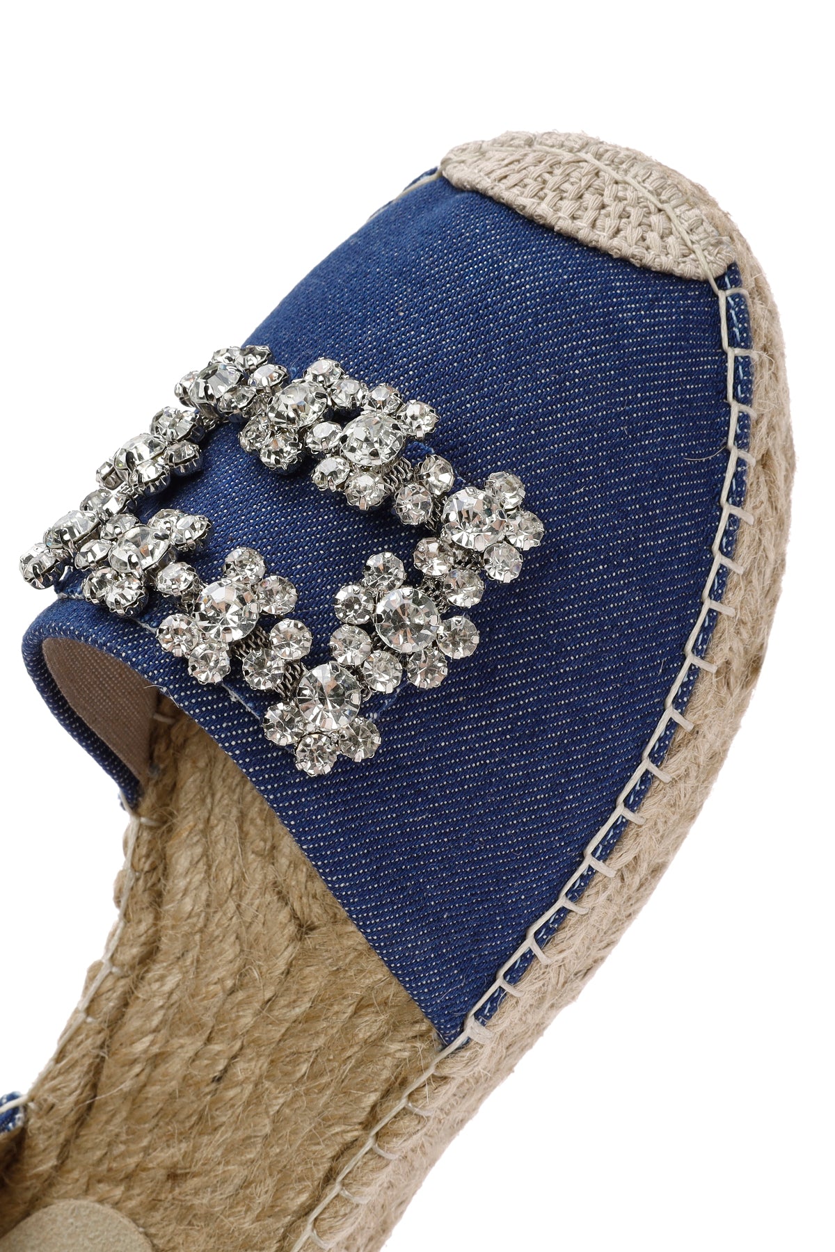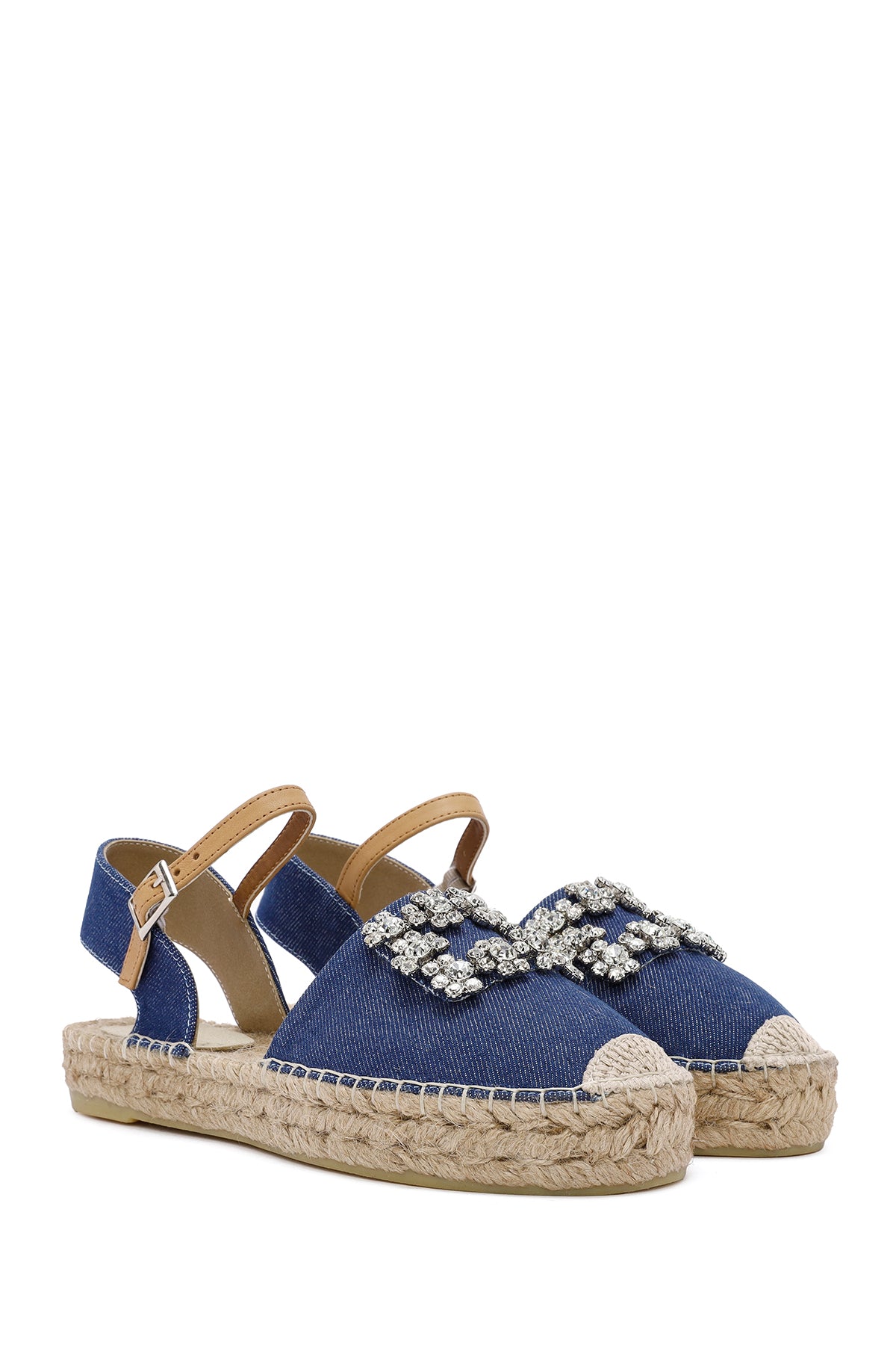 Women's Blue Ankle Buckle Jean Fabric Stoned Espadrille Sandals
