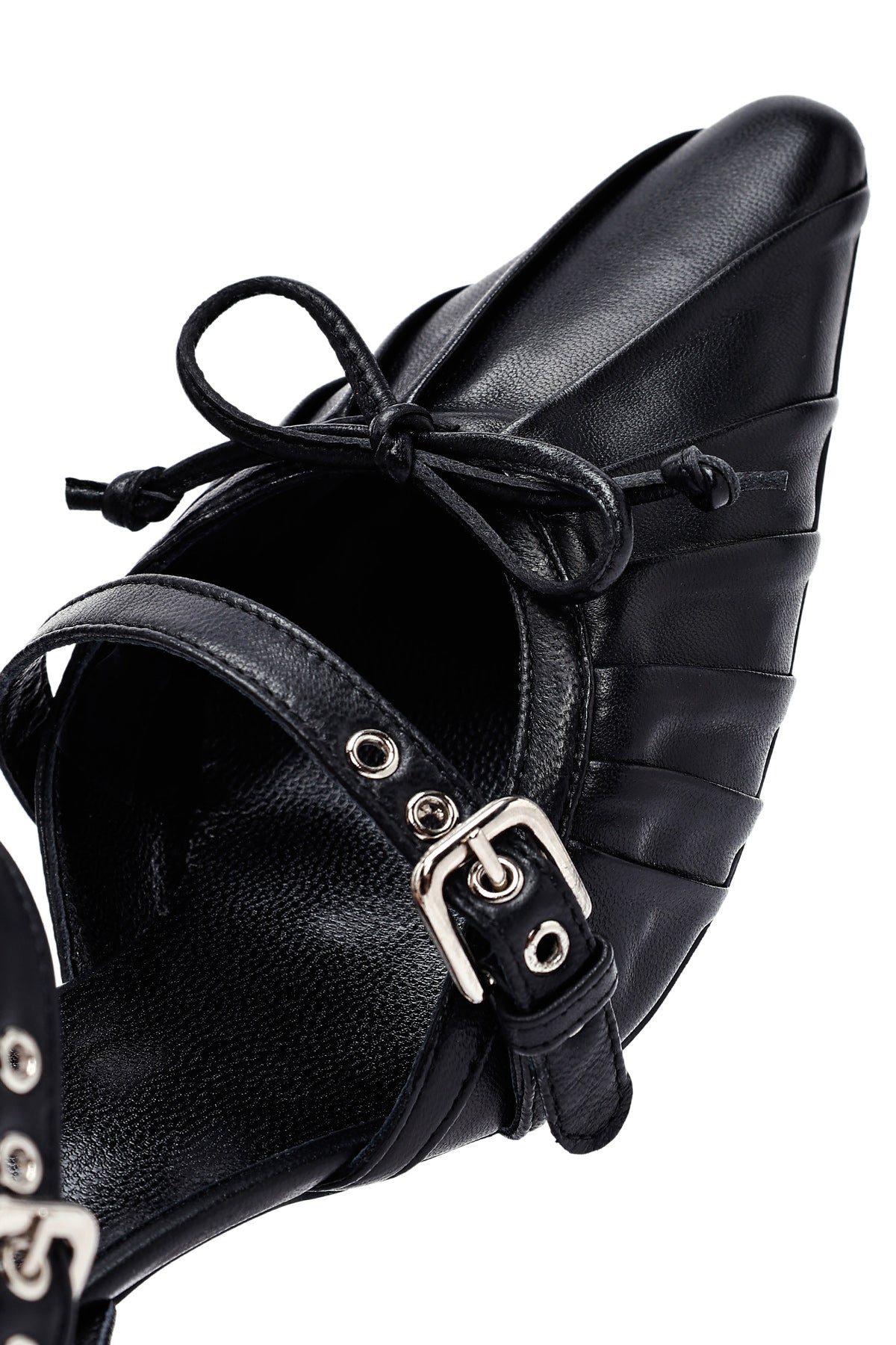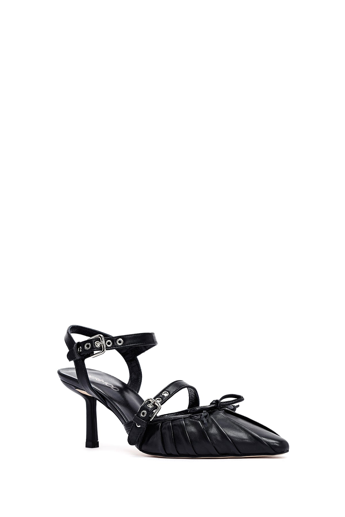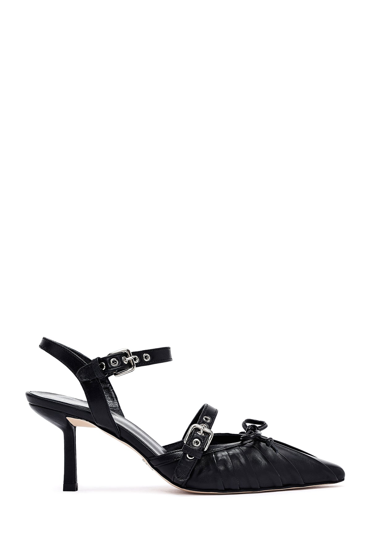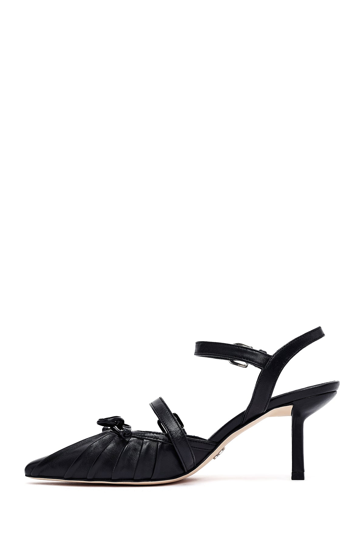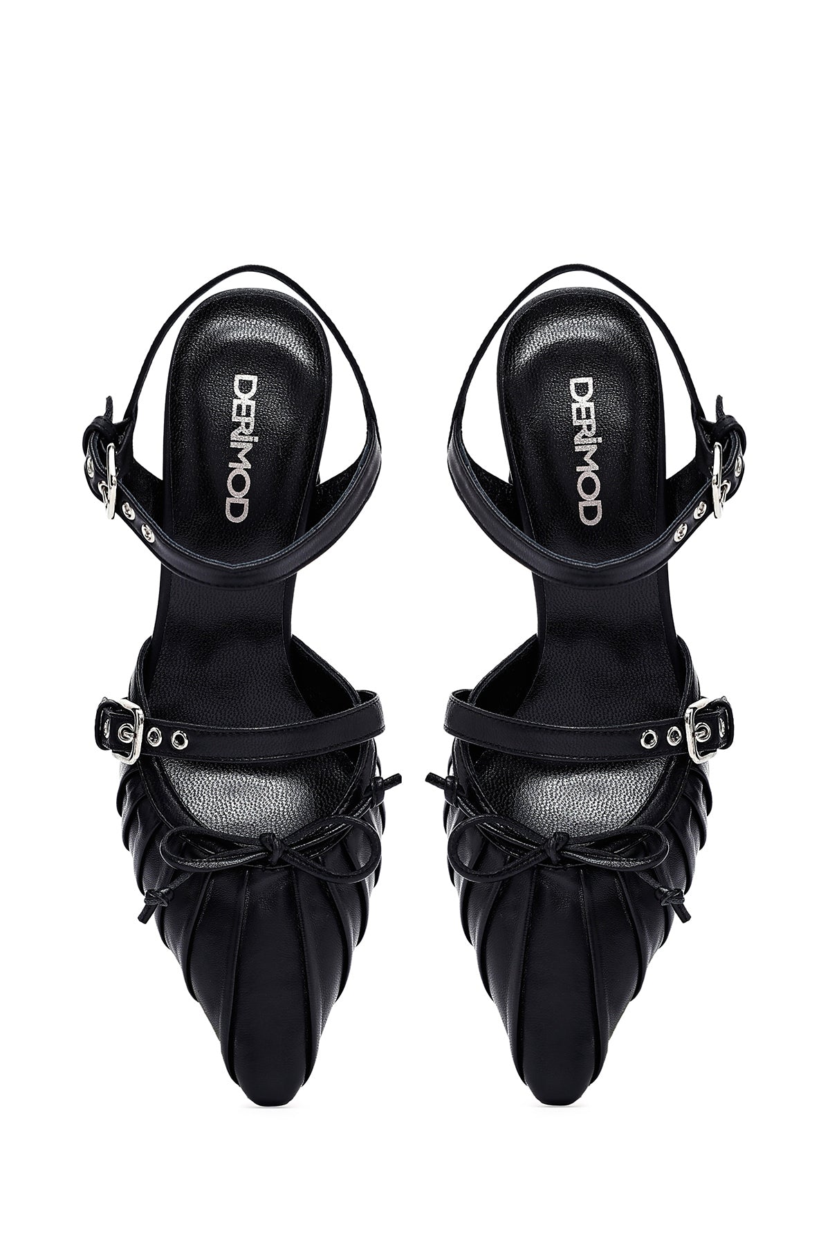 From Derimod's summer collection, the black open-back shoe model designed using screwed leather offers a design suitable for elegant invitations with its 7 cm high slim heel. Featuring an adjustable buckle detail at the ankle for a modern look, the model provides quality use with its leather inner lining. With its classic lines, the shoe offers a wide range of use from office to special invitations, business meetings to dinners, perfectly matching dresses and skirts. It can be preferred in spring and summer seasons. Product code: 25SFD121118