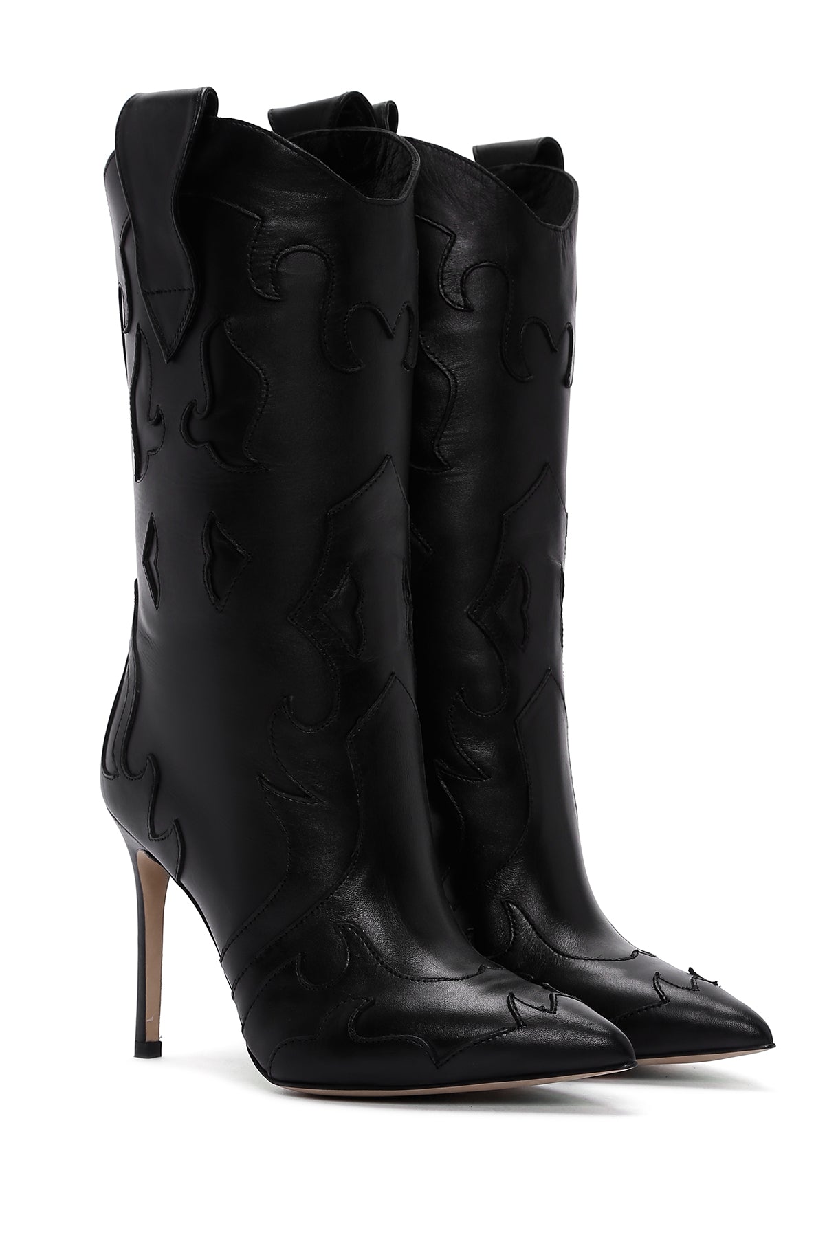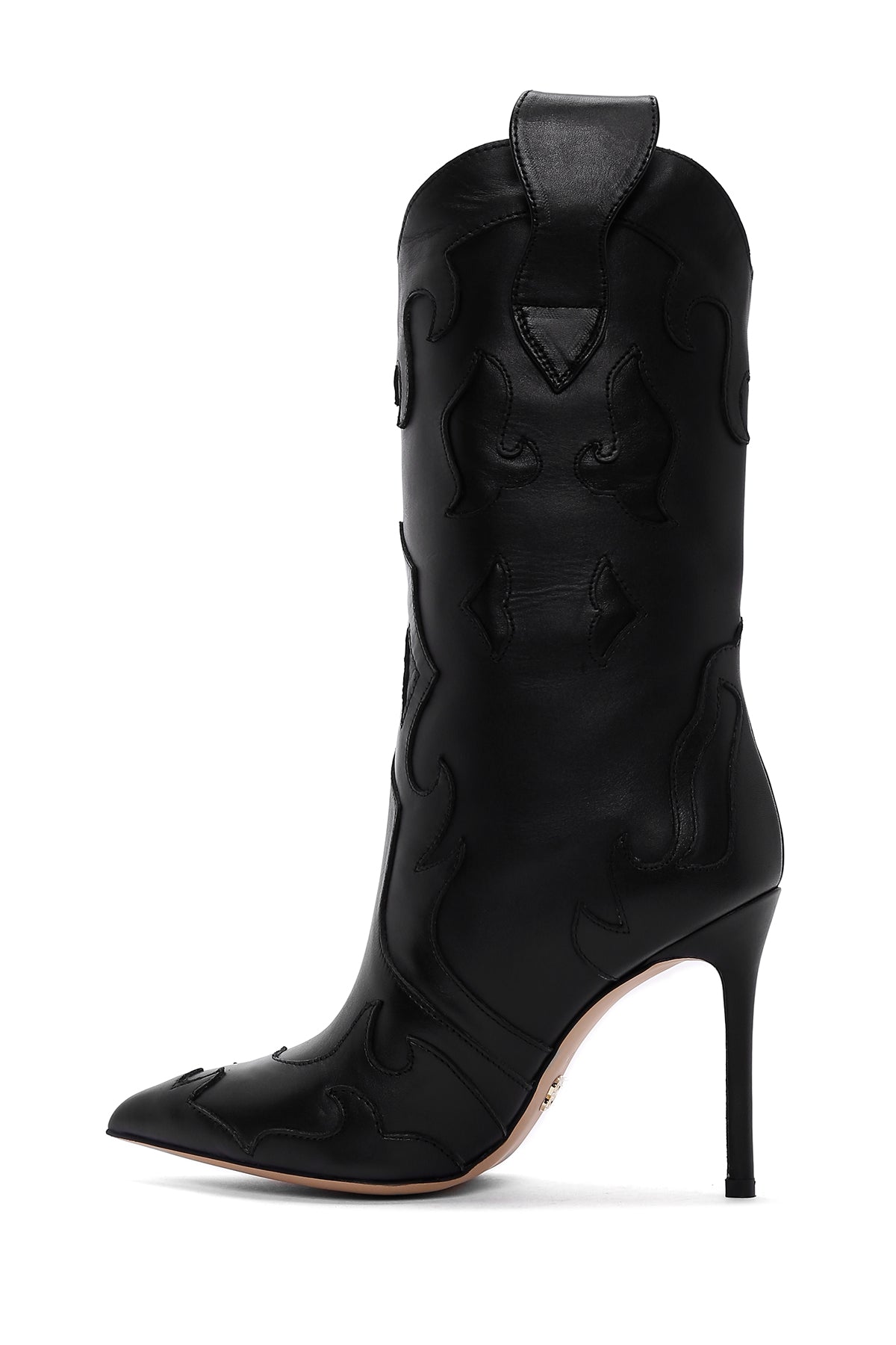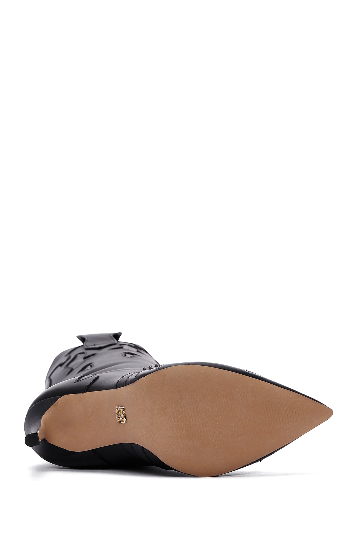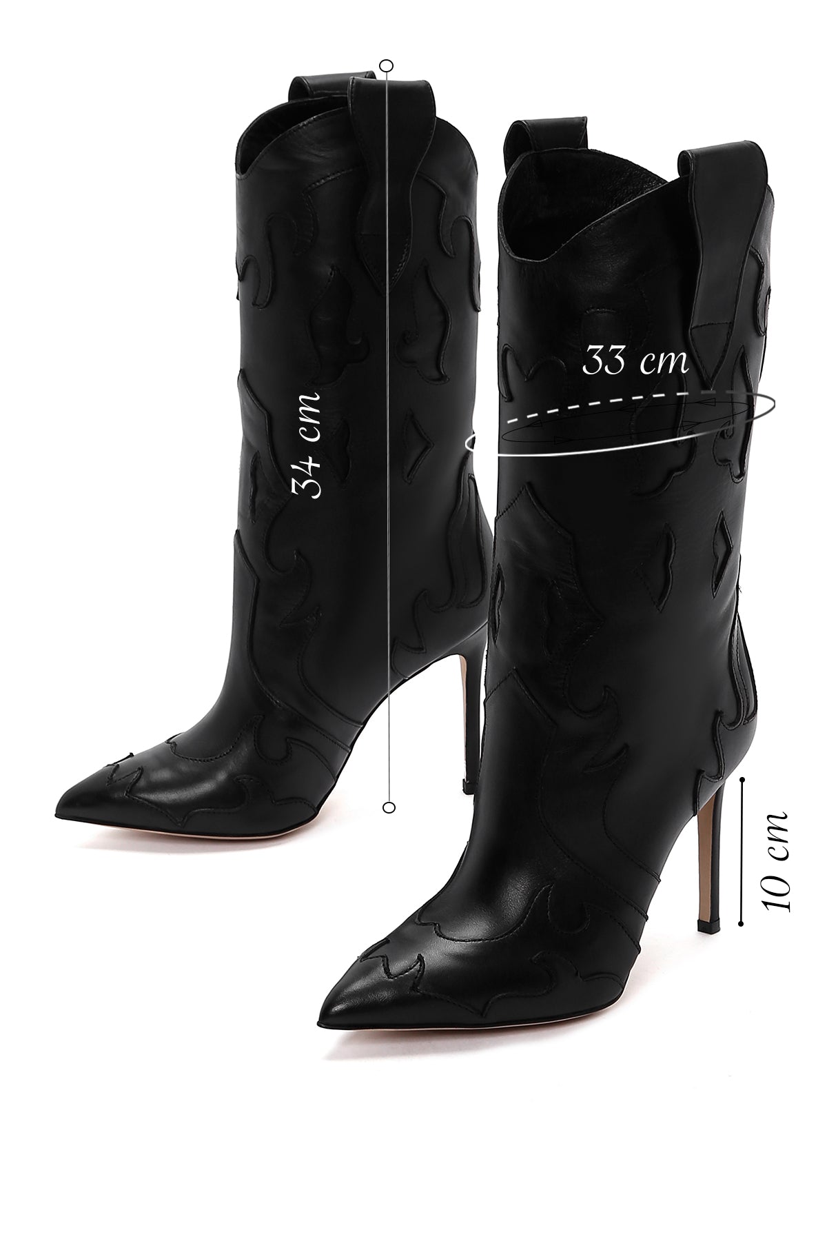 From Derimod's winter collection, the black boot model designed using screwed leather offers a dazzling look with its 10 cm high slim heel. The model, which attracts attention with its Western style cut details and modern silhouette, provides a stylish use with its textile inner lining. The boot, which displays an elegant appearance with its pointed toe structure and slim heel, offers a wide range of use from dresses to skirts, skinny pants to mini shorts. It can be preferred for special invitations to daily use in autumn and winter seasons. Product code: 25WFD120418