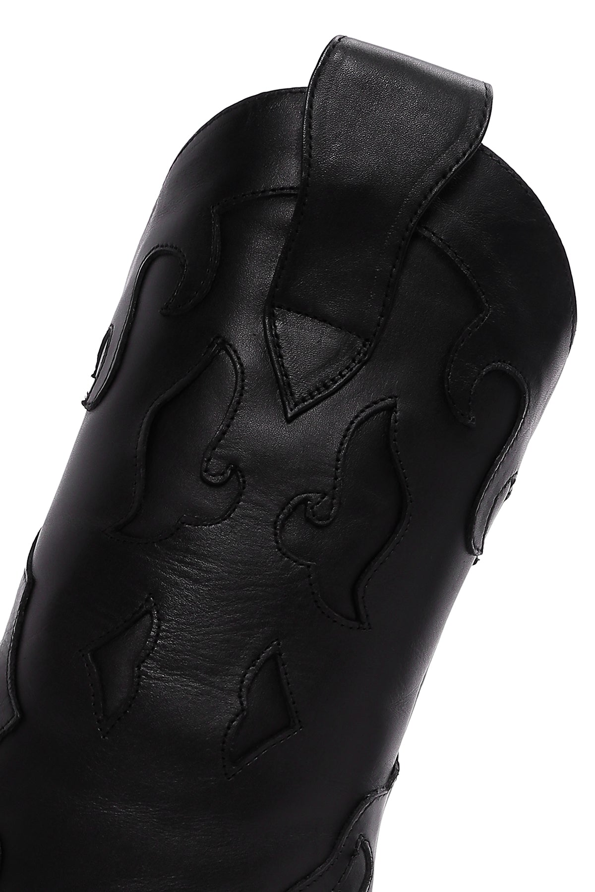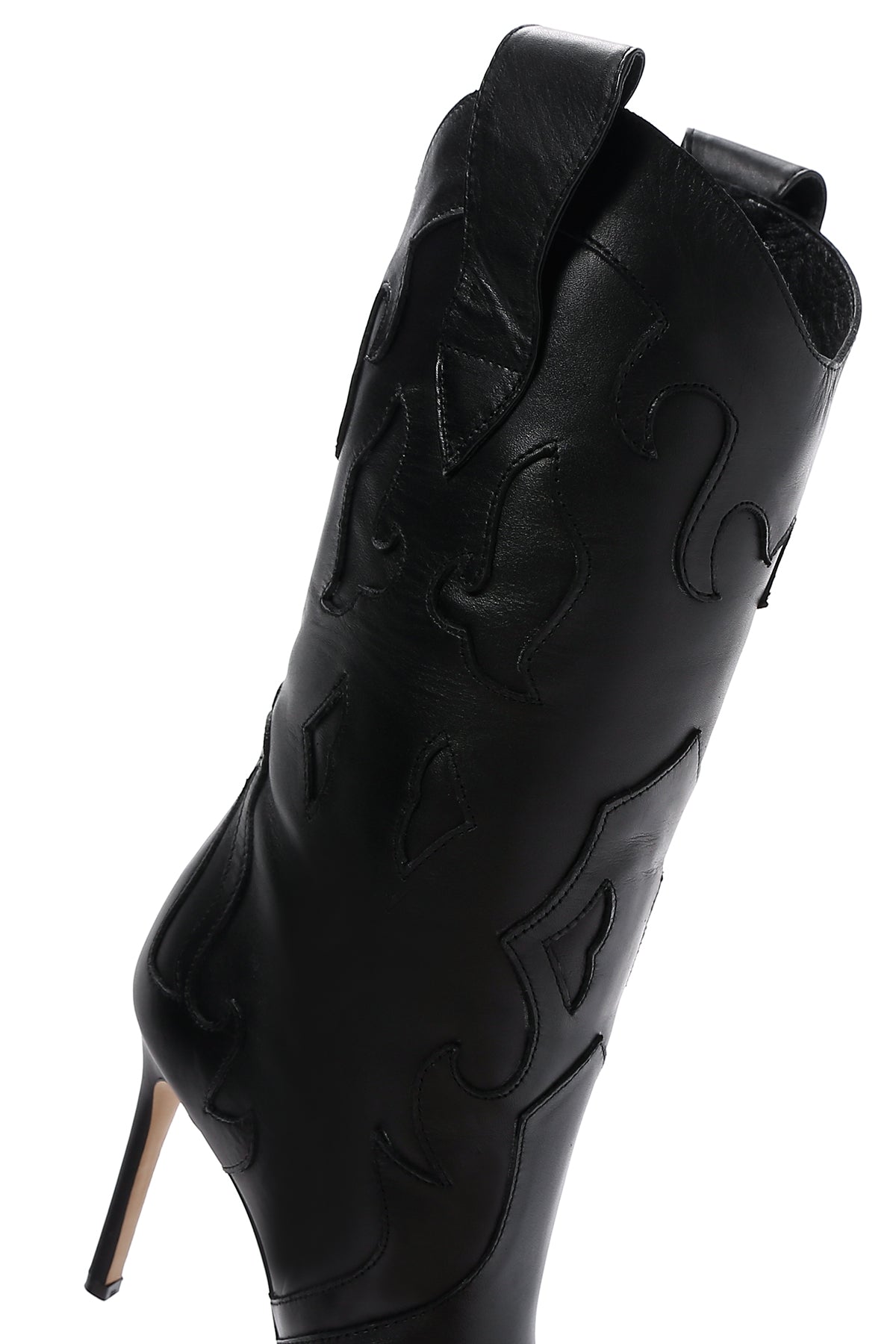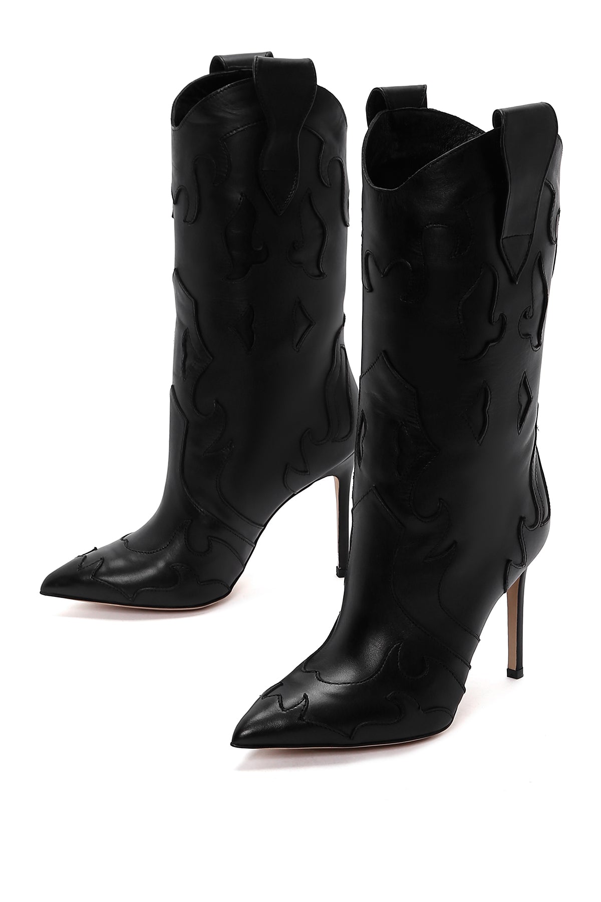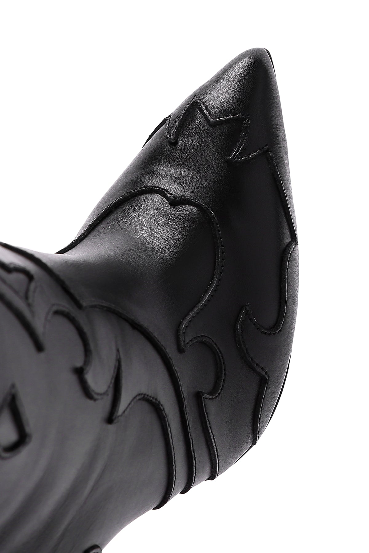 From Derimod's winter collection, the black boot model designed using screwed leather offers a dazzling look with its 10 cm high slim heel. The model, which attracts attention with its Western style cut details and modern silhouette, provides a stylish use with its textile inner lining. The boot, which displays an elegant appearance with its pointed toe structure and slim heel, offers a wide range of use from dresses to skirts, skinny pants to mini shorts. It can be preferred for special invitations to daily use in autumn and winter seasons. Product code: 25WFD120418