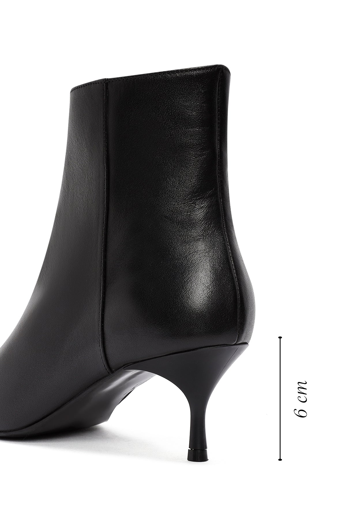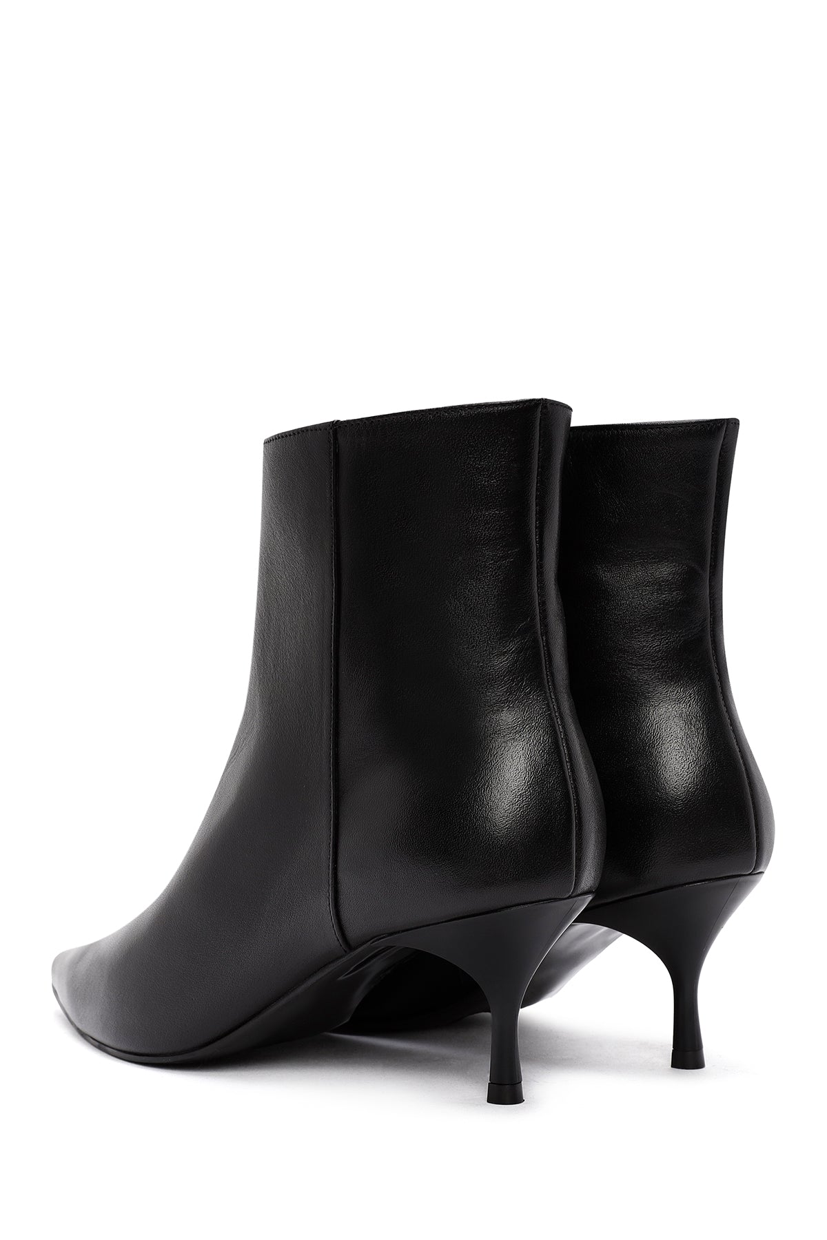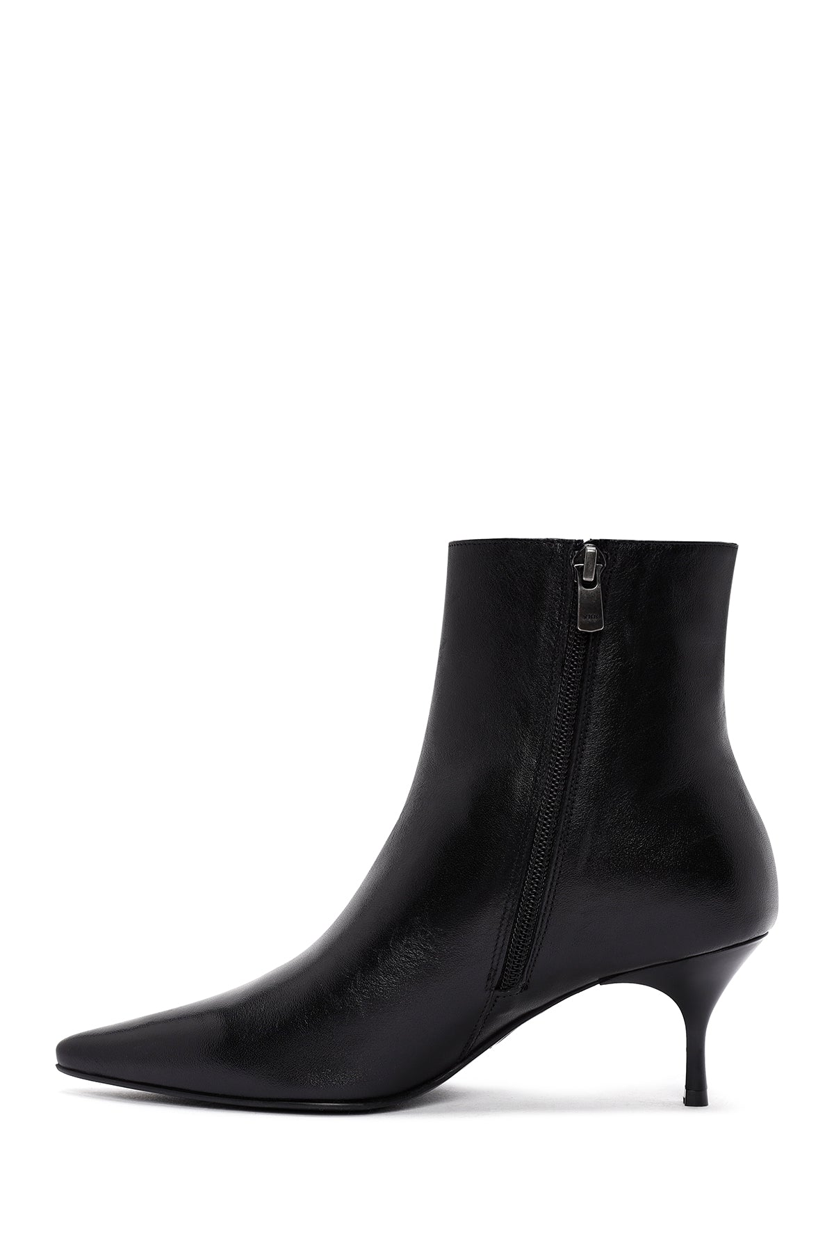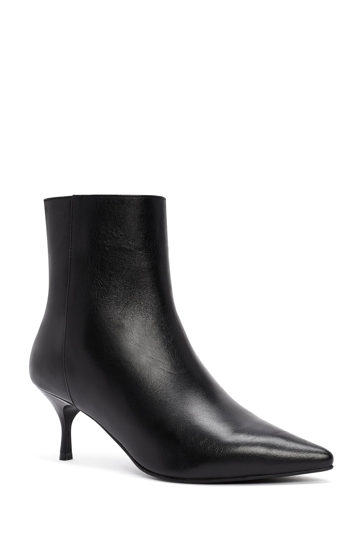 From Derimod's winter collection, the black boot model designed using screwed leather offers a stylish look with its 6 cm high slim heel. The model, which provides easy wear with its side zipper design, promises quality use with its leather inner lining. The boot, which attracts attention with its pointed toe shape and minimalist design, offers a wide range of use from office outfits to invitation dresses, from daily styles to elegant night combinations. It can be preferred in autumn and winter seasons. Product code: 25WFD131318