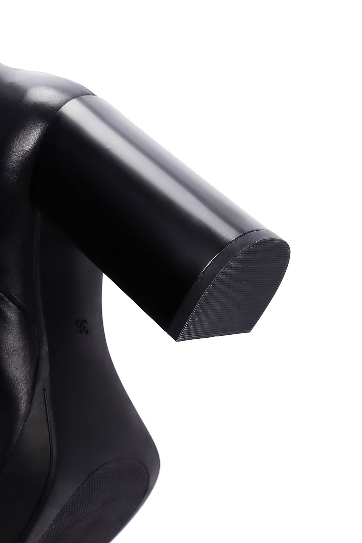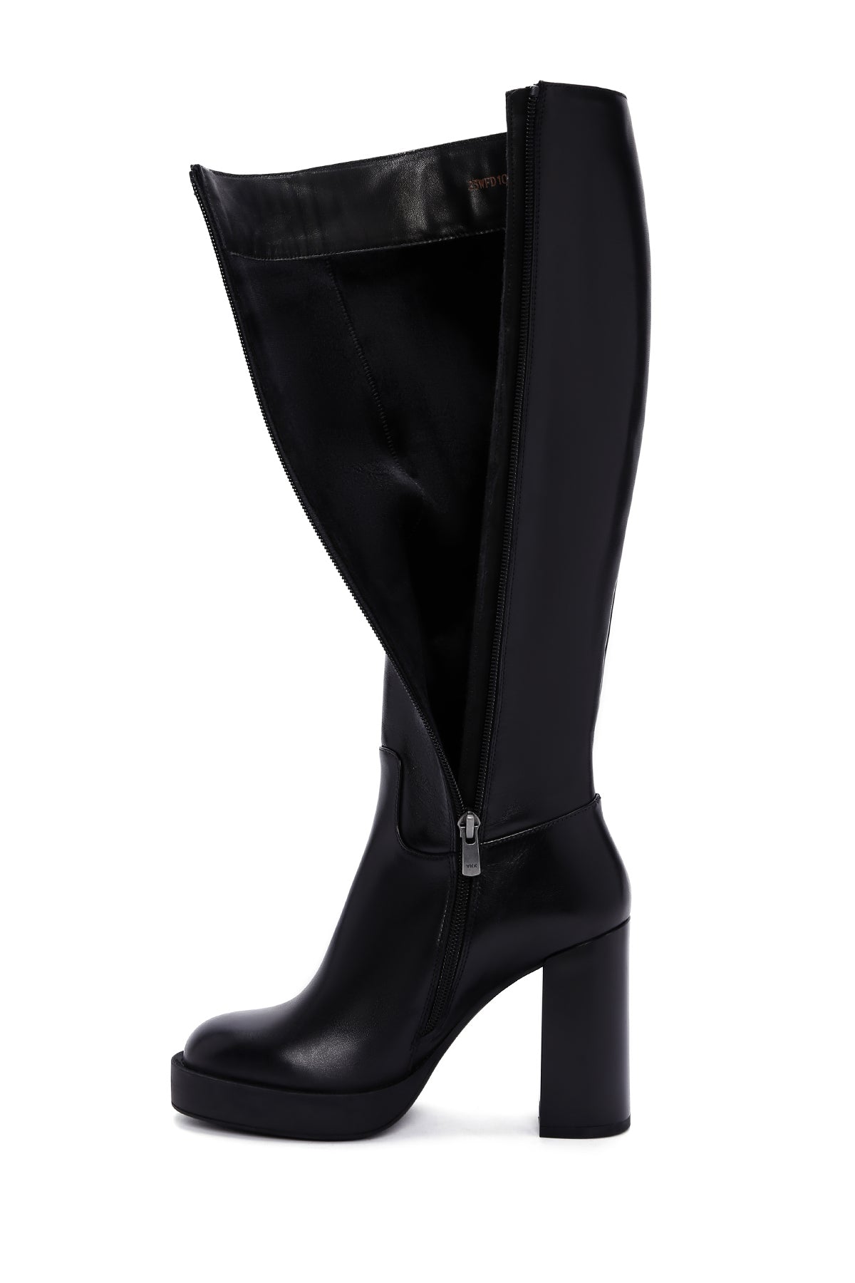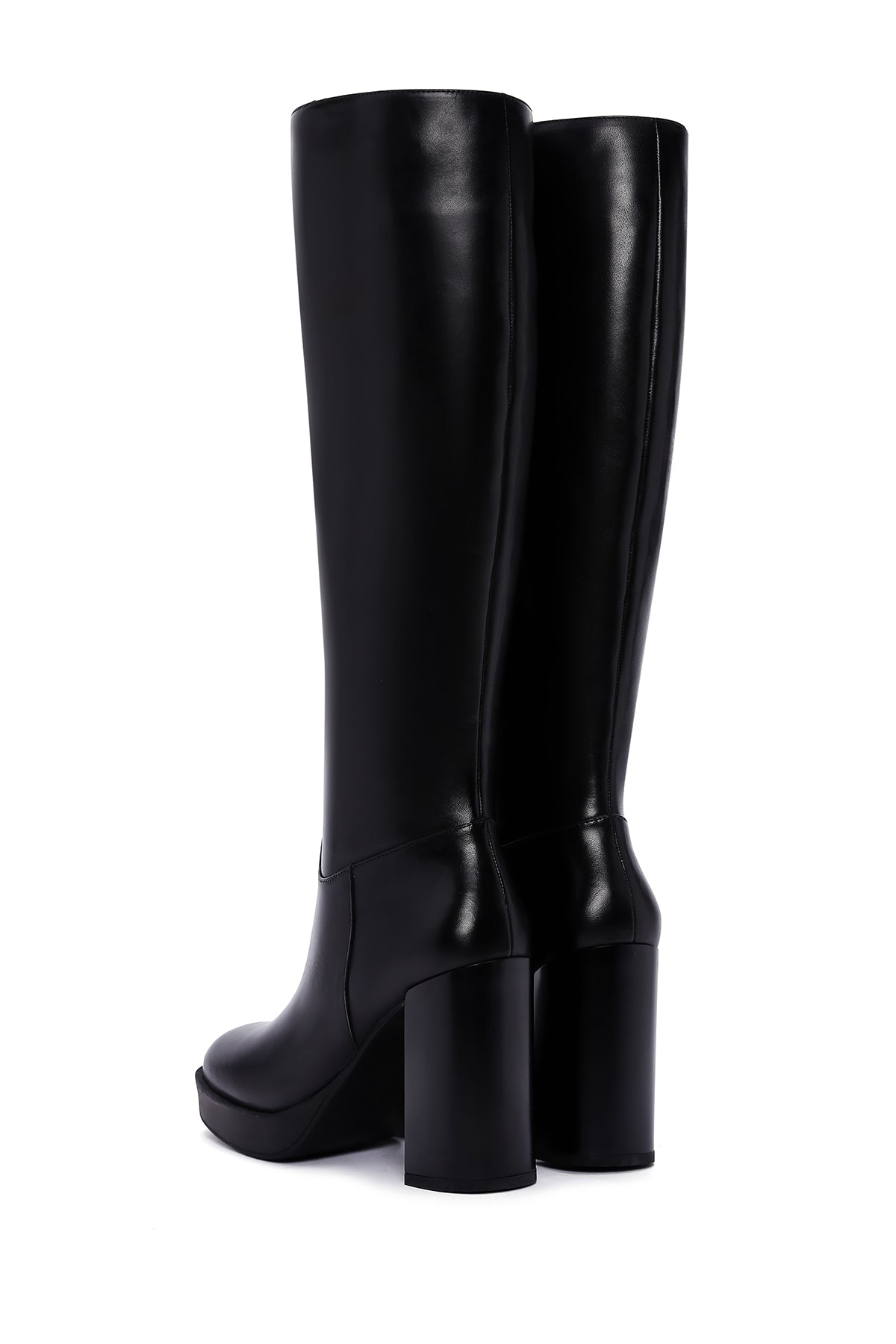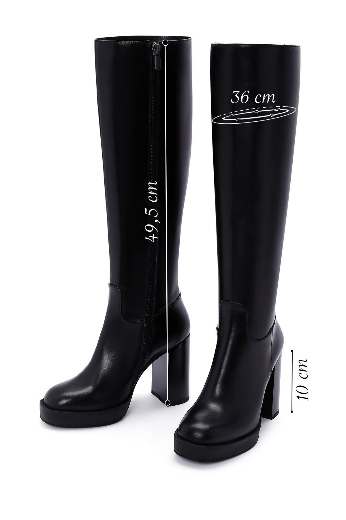 Black vidala leather boots, which stand out with their elegant design, stand out as one of the indispensable pieces of the winter season. While creating a feminine silhouette with their 10 cm high heel and length that extends to below the knee, the side zipper provides easy dressing. Offering a use suitable for seasonal conditions with its textile inner lining, the model is especially in perfect harmony with skirts and dresses. This stylish piece of the winter collection promises a wide range of use from the office to special invitations. Product code: 24WFD100818