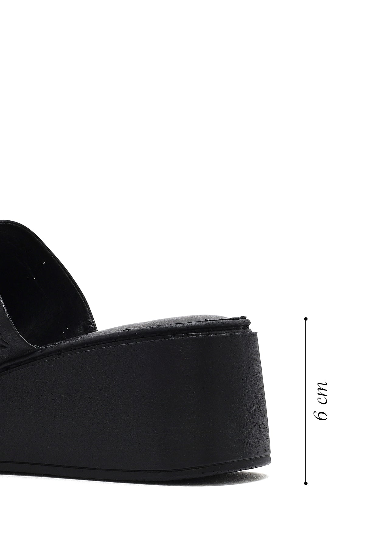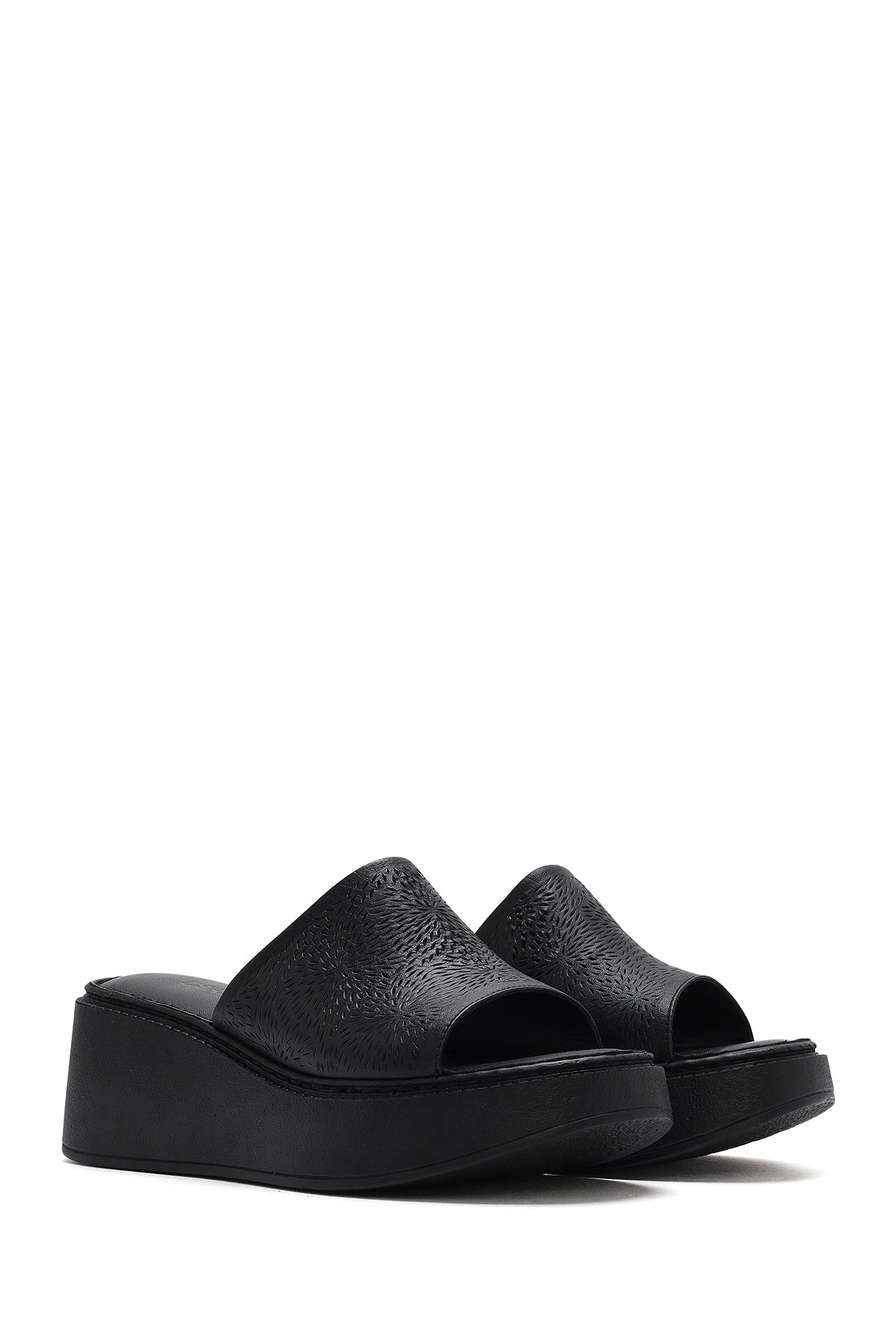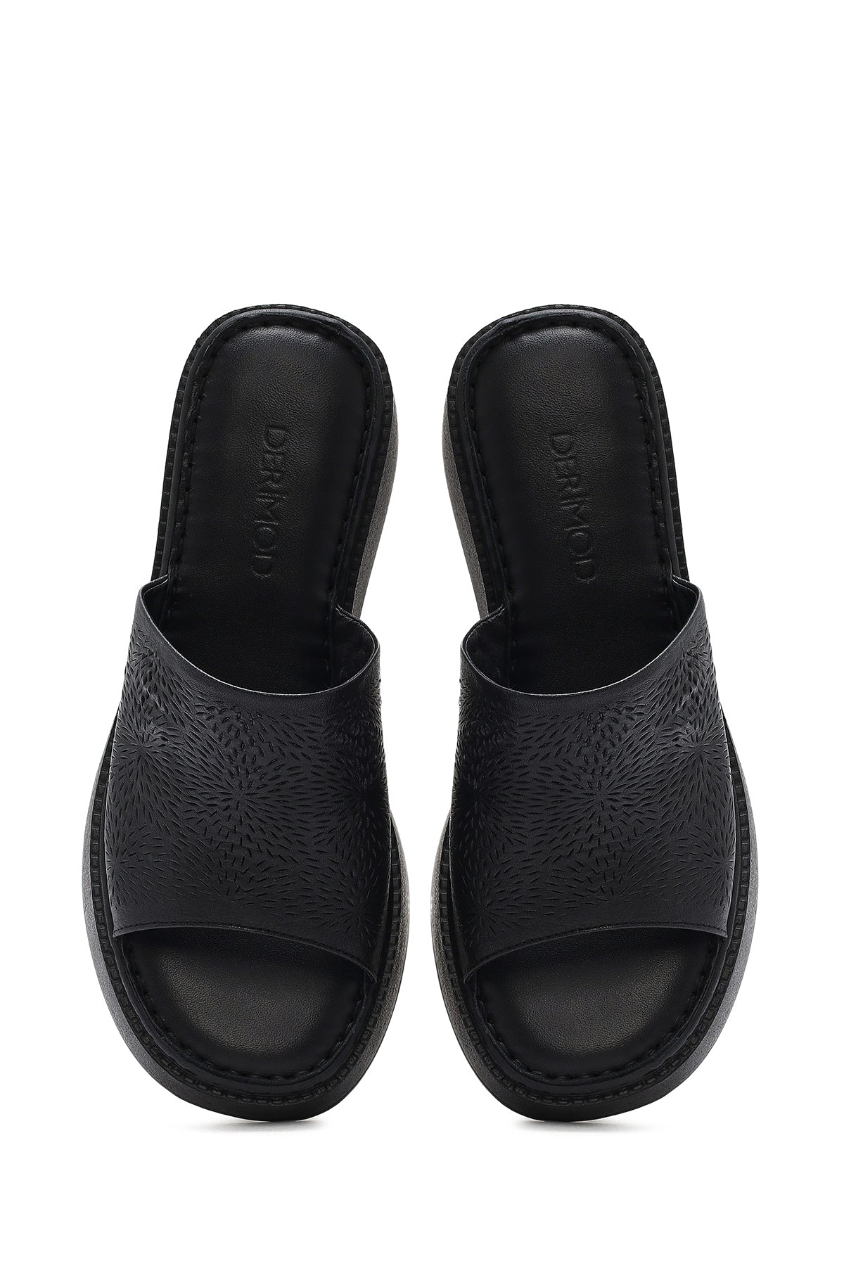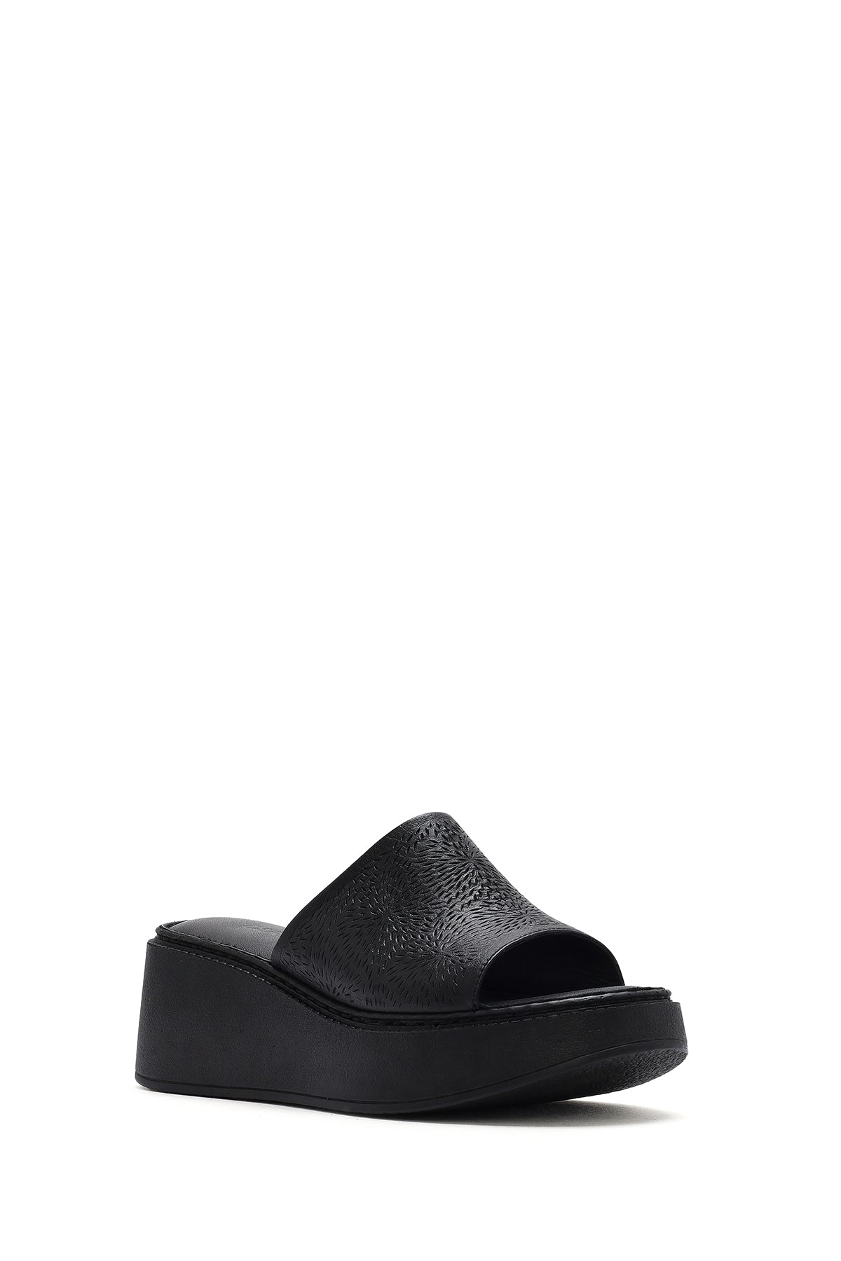 Kadın Siyah Kalın Tabanlı Baskılı Deri Konfor Terlik