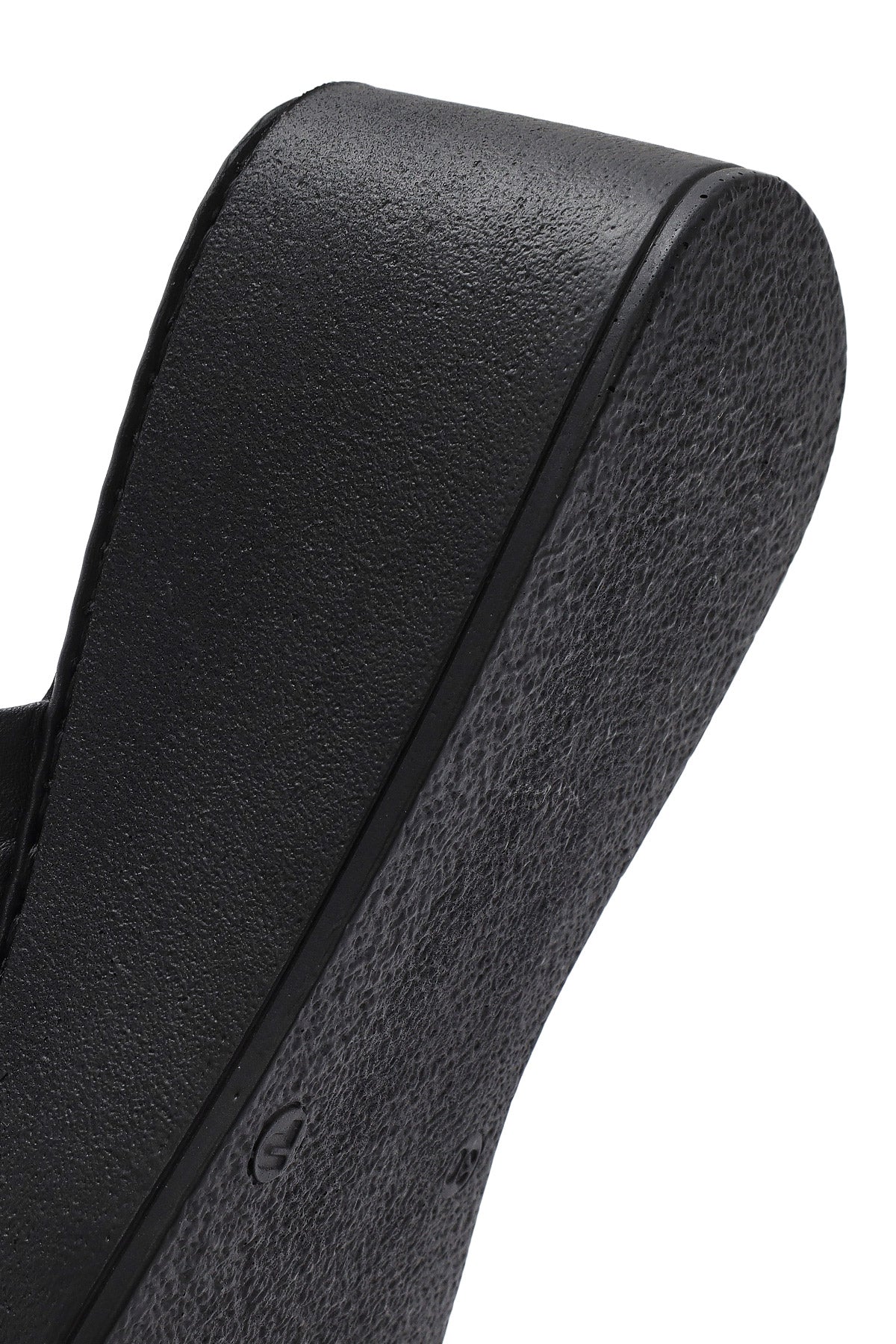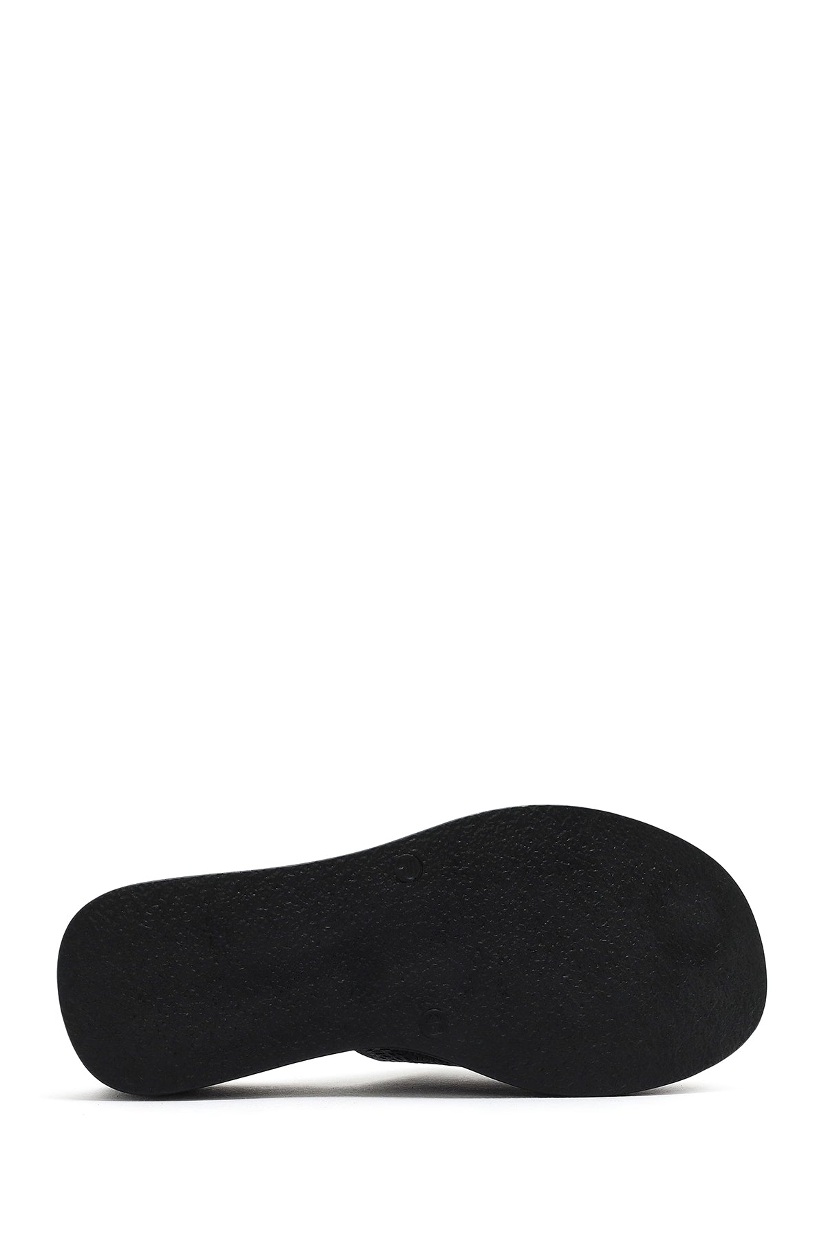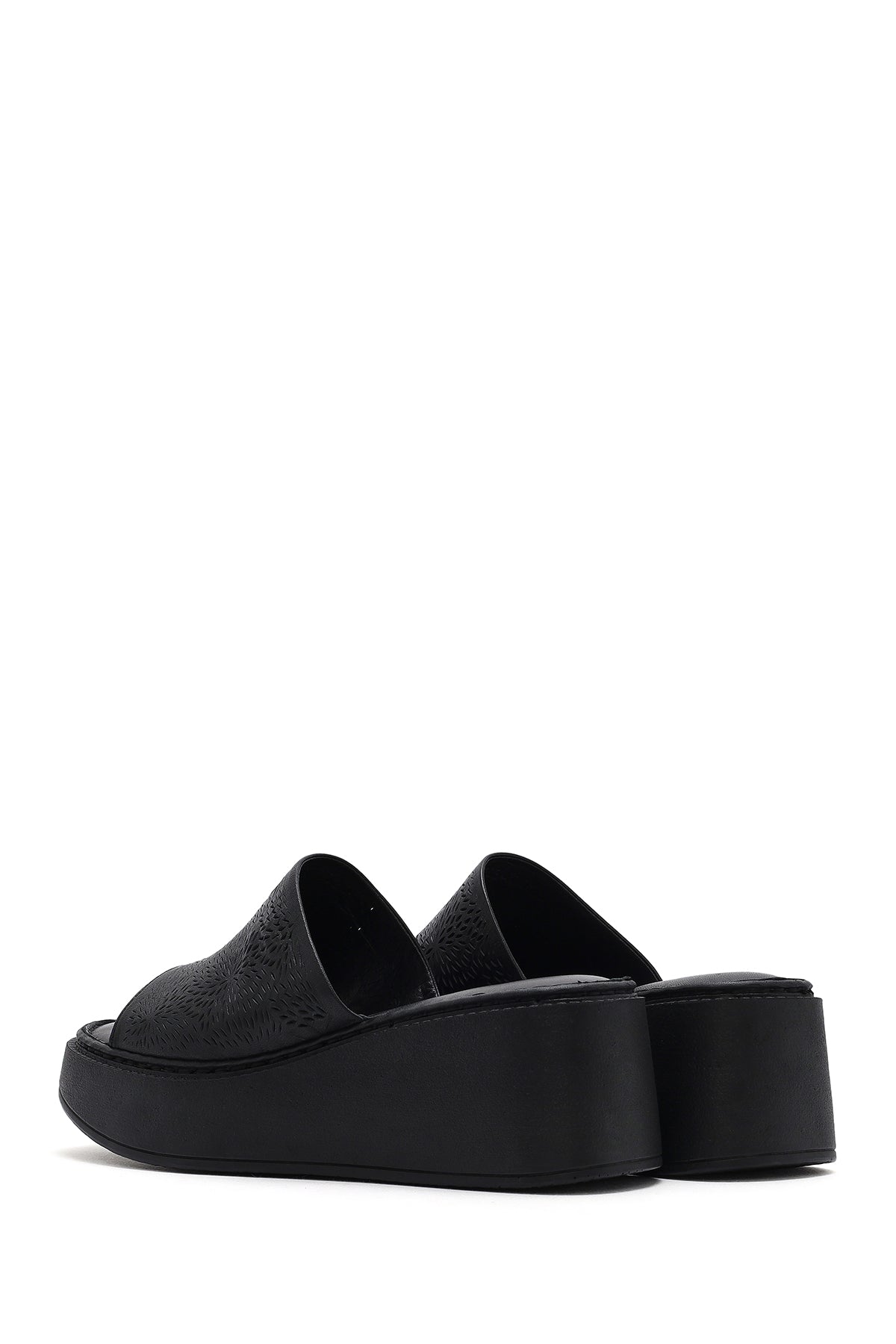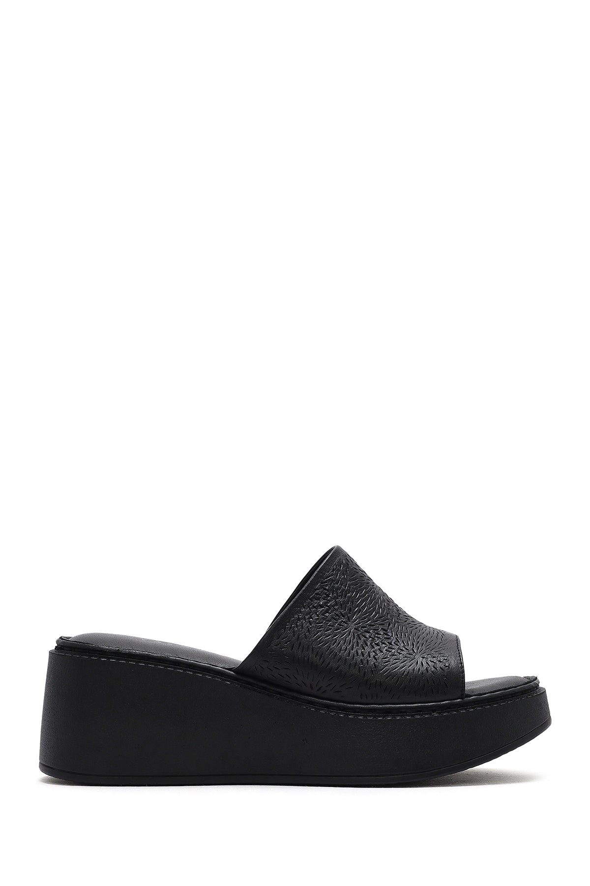 Kadın Siyah Kalın Tabanlı Baskılı Deri Konfor Terlik