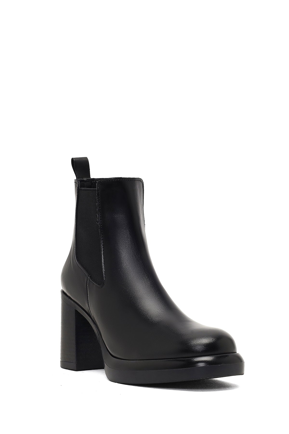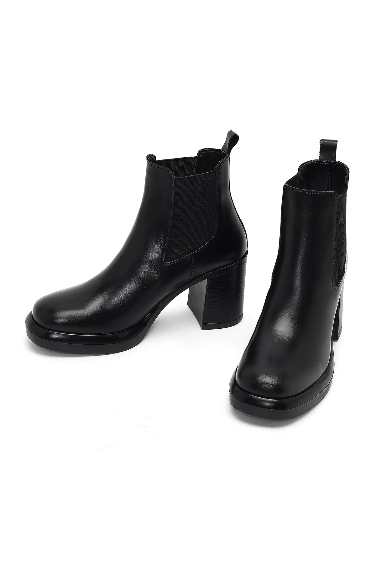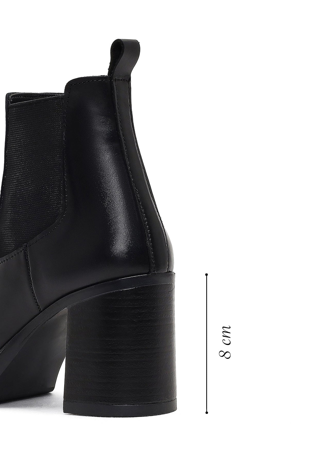 **Turkish Description:** Women's Black Thick Heel Leather Chelsea Boot is a timeless design that combines the style and functionality needed by the modern woman in city life. Made with Vidala leather feature, the boot offers superior quality and durability, while its black color perfectly matches every wardrobe. The 8 cm thick heel design adds elegance while providing stability and balance for daily use. The Chelsea boot silhouette offers easy wear with classic elastic side panels and pull tabs at the back. The leather inner lining allows the foot to breathe and creates comfort during long-term use. The thick sole structure protects foot health and increases walking comfort at all hours of the day. A standout piece of the winter collection, the boot performs excellently in cold weather conditions. It has a wide range of uses from office environments to dinners, daily shopping to meeting friends. It can also be comfortably preferred in spring and autumn months. Thanks to Vidala leather craftsmanship, it maintains its shape for many years and shows no signs of aging. Designed for the active lifestyle of the modern woman, the boot becomes an indispensable part of the wardrobe with both aesthetic and functional features. Product code: 25WFD188318
