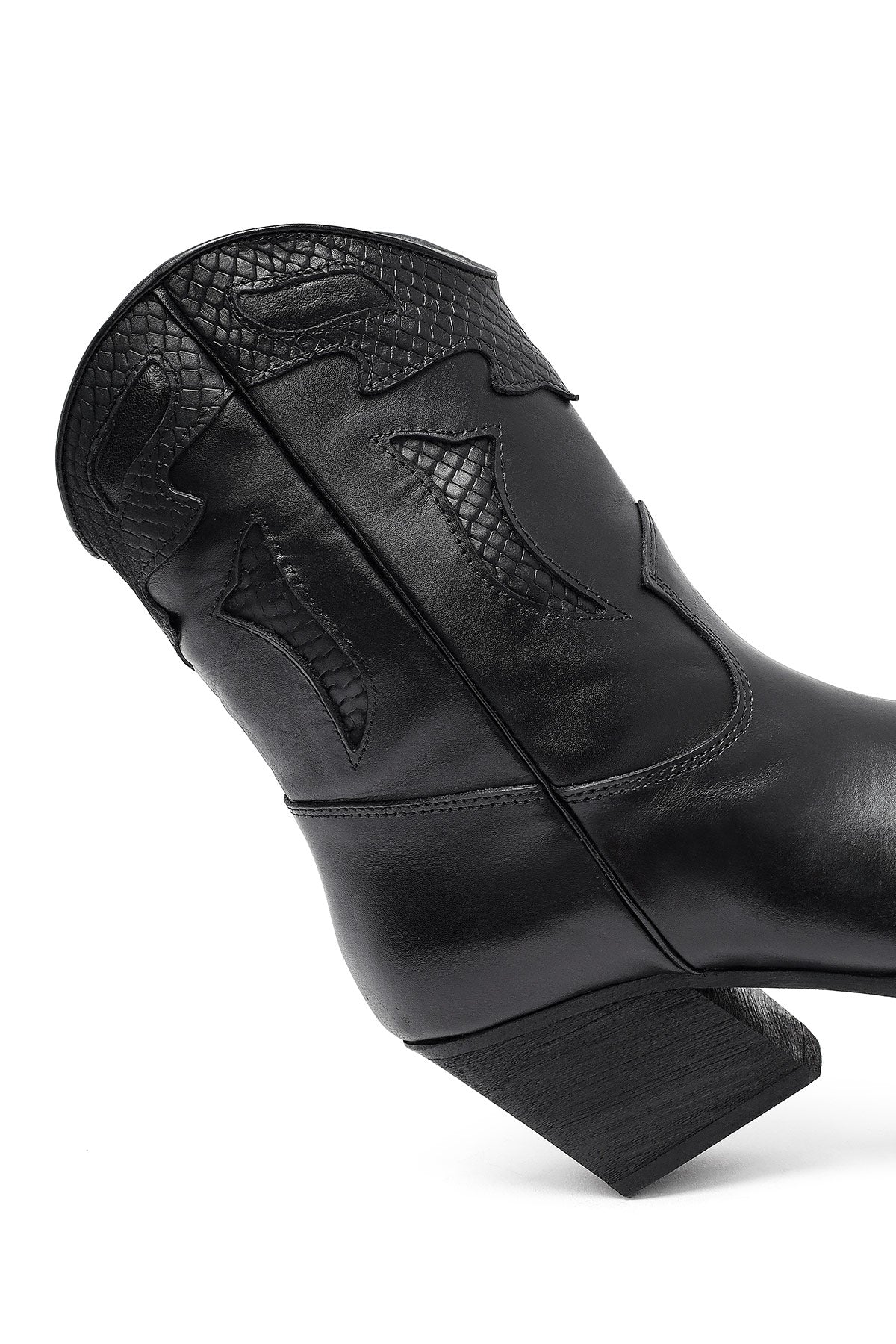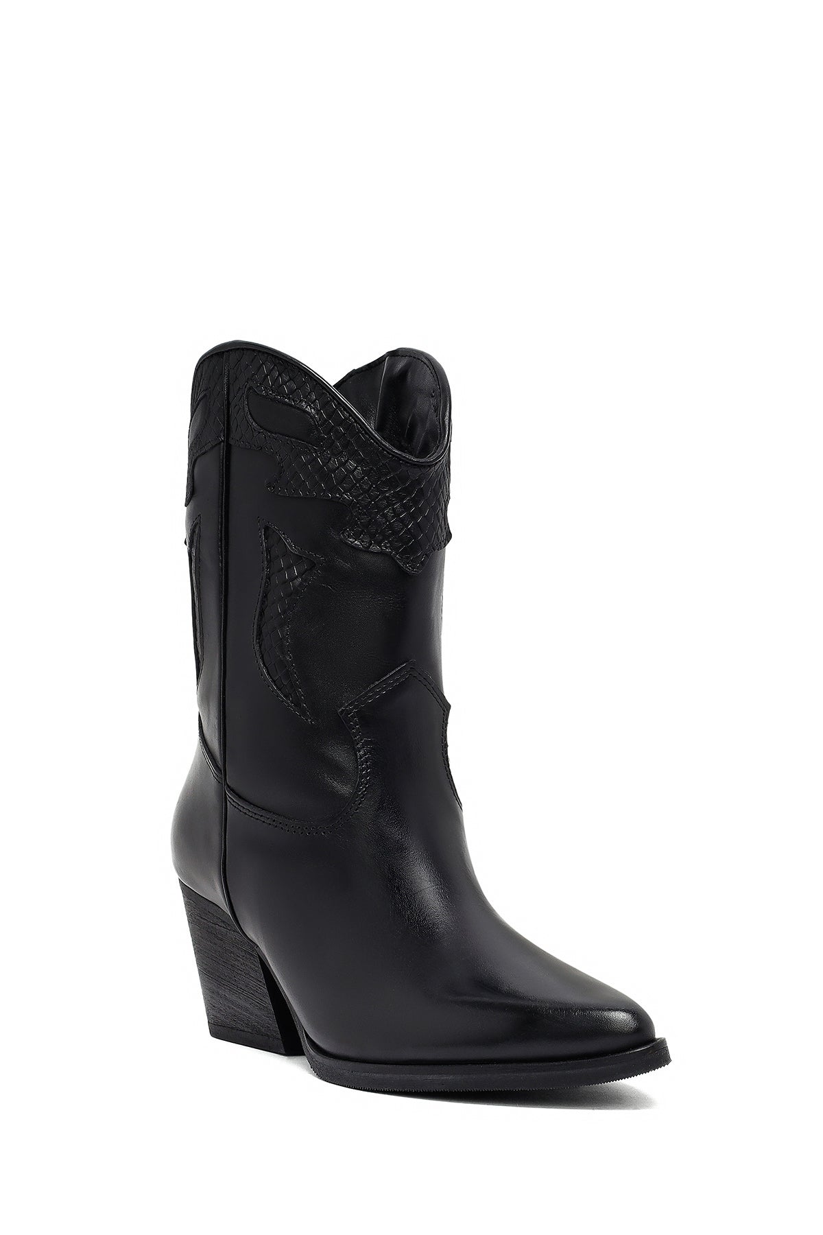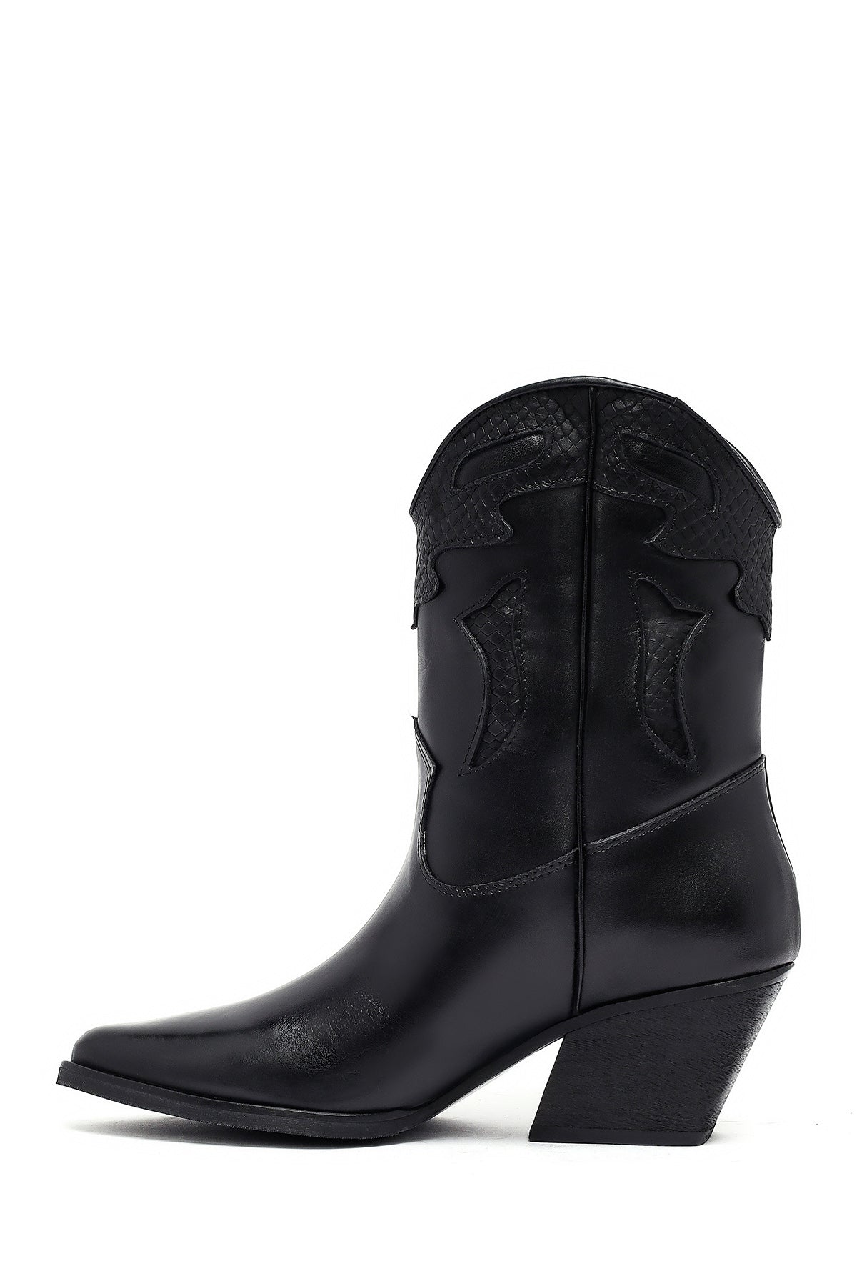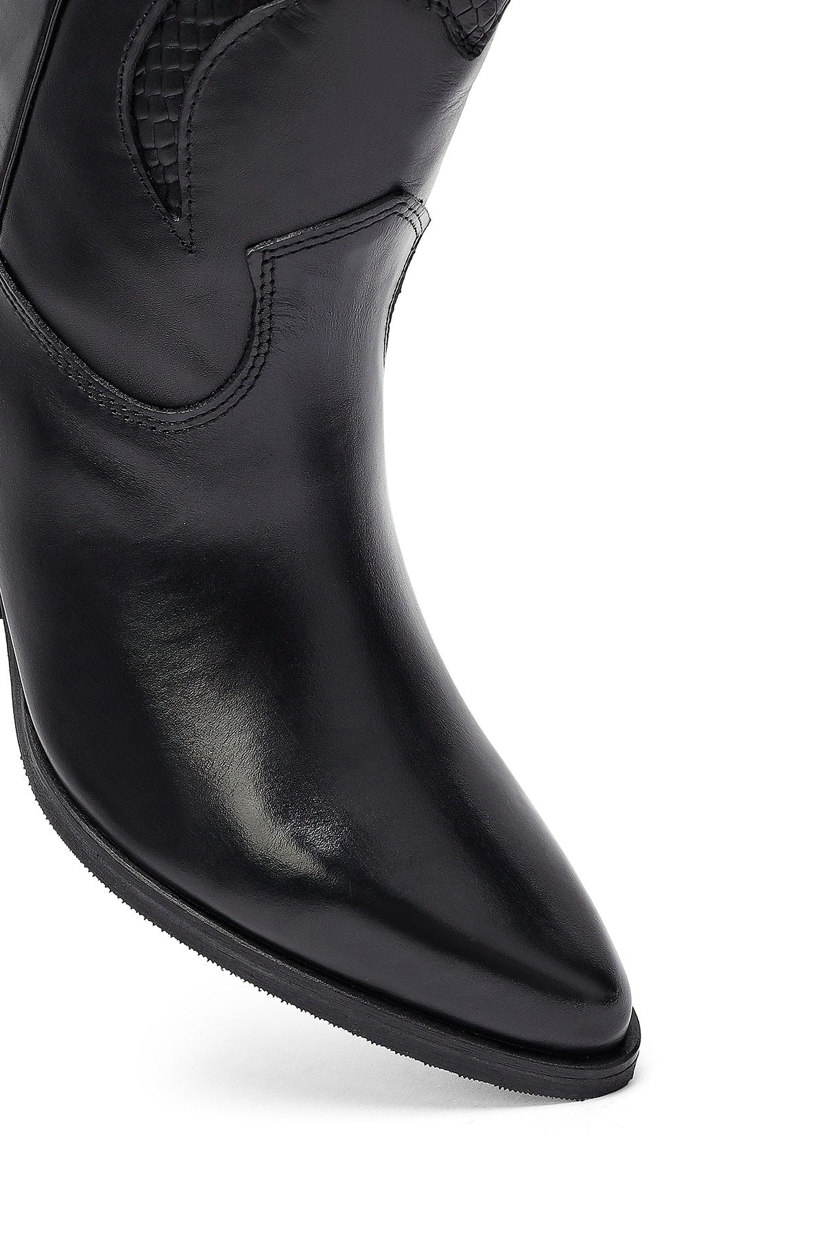 The modern cowboy boot of the winter collection stands out with its black screwed leather upper surface and characteristic western design. The use of fabric lining and the 6.5 cm high heel offer a stylish look. Adapted to today's fashion with classic western stitching and contemporary lines. Especially in autumn and winter months, it perfectly matches both casual and elegant clothing combinations. Usage areas: Ideal for daily activities, city tours, and special invitations. Product code: 25WFD182518