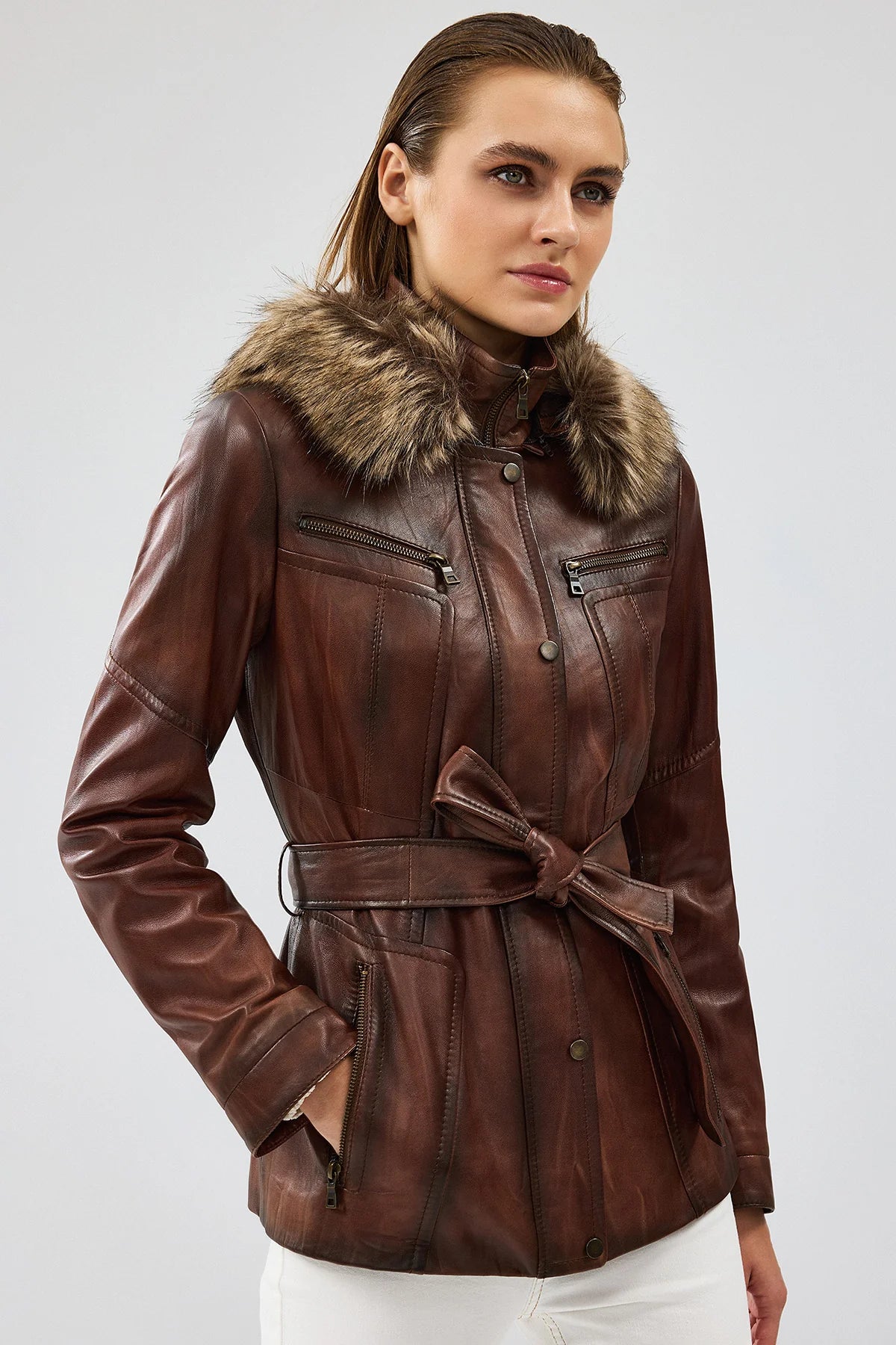 Show off your style with Derimod's Rebecca Women's Brown Hooded Furry Leather Jacket, which combines elegance and style. Product code: 24WGE5209NC 25