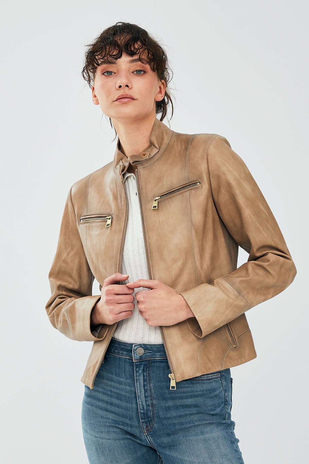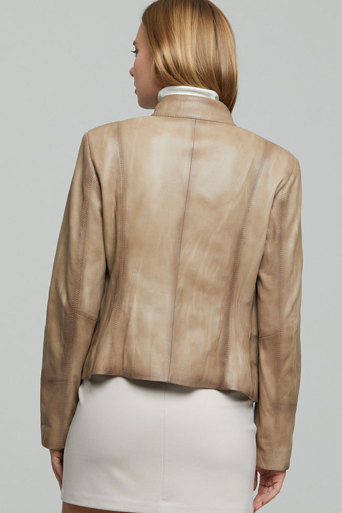 Sahara rengindeki kadın deri ceket, mat deri yüzeyi ve hakim yaka tasarımıyla günlük şıklığın temsilcisidir. Standart kalıp yapısı vücuda uyumlu oturumu sağlarken, kısa boy kesimi modern bir siluet oluşturur. Ön tarafta yer alan fermuarlı kapama sistemi kolay kullanım sunar, dört adet dış cep ise işlevselliği artırır. Göğüs bölgesindeki fermuarlı ceplerle alt kısımdaki yan cepler hem dekoratif hem pratik bir görünüm sergiler. Deri yüzeydeki natural doku ve bej tonunun sıcaklığı, sonbahar ve ilkbahar dönemlerinde katmanlı kombinlerde rahatlıkla kullanılabilir. Hakim yaka yapısı boyun hattını çevrelerken zarif bir duruş kazandırır, tekstil astar ise iç konfor sağlar. Omuz hattındaki düz kesim ve kol ağzındaki düzenli bitiş detayları, ceketın klasik deri ceket estetiğini destekler.This beige women's leather jacket showcases a matte leather surface with a band collar design that represents everyday elegance. The regular fit structure provides a body-conforming fit while the short length creates a modern silhouette. The front zipper closure system offers easy use, and four external pockets enhance functionality. The zippered chest pockets combined with side pockets at the bottom present both decorative and practical appearance. The natural texture of the leather surface and the warmth of the beige tone make it suitable for layered combinations during autumn and spring seasons. The band collar structure encircles the neckline while providing an elegant posture, and the textile lining ensures interior comfort. The straight cut at the shoulder line and the regular finish details at the cuff support the classic leather jacket aesthetic.Diese beige Damenleder jacke zeigt eine matte Lederoberfläche mit Stehkragen-Design, das die alltägliche Eleganz repräsentiert. Die reguläre Passform bietet eine körpernahe Anpassung, während die kurze Länge eine moderne Silhouette schafft. Das vordere Reißverschluss-Verschlusssystem ermöglicht eine einfache Handhabung, und vier Außentaschen erhöhen die Funktionalität. Die Reißverschluss-Brusttaschen in Kombination mit den Seitentaschen am unteren Bereich bieten sowohl dekorative als auch praktische Erscheinung. Die natürliche Textur der Lederoberfläche und die Wärme des beigen Tons machen sie für Schicht-Kombinationen in Herbst- und Frühjahrszeiten geeignet. Die Stehkragen-Struktur umschließt die Halslinie und verleiht eine elegante Haltung, während das Textilfutter für inneren Komfort sorgt. Der gerade Schnitt an der Schulterlinie und die regelmäßigen Abschluss-Details am Ärmelabschluss unterstützen die klassische Lederjacken-Ästhetik. Ürün kodu: 21SGE5908NC