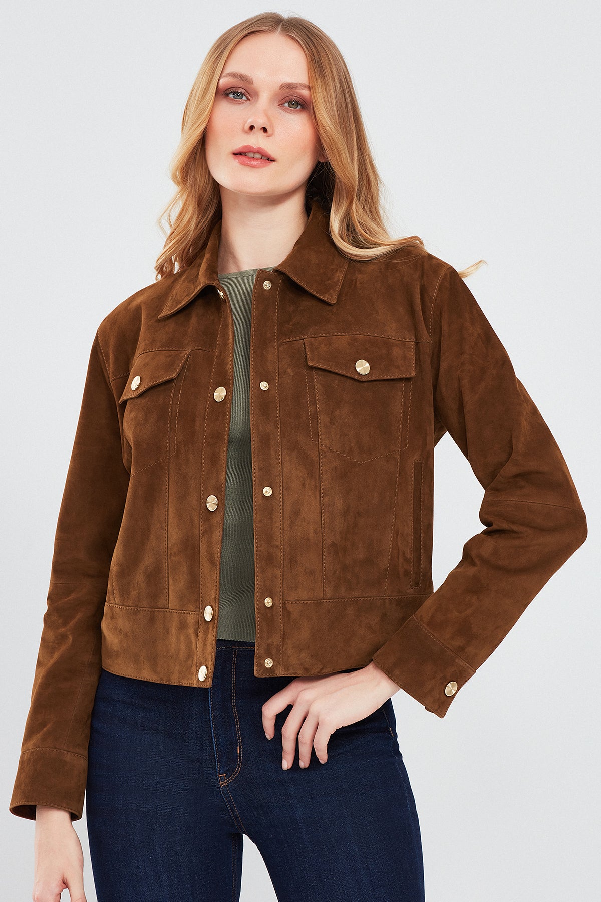 Amber Kadın Kahverengi Gömlek Yaka Kısa Süet Deri Ceket