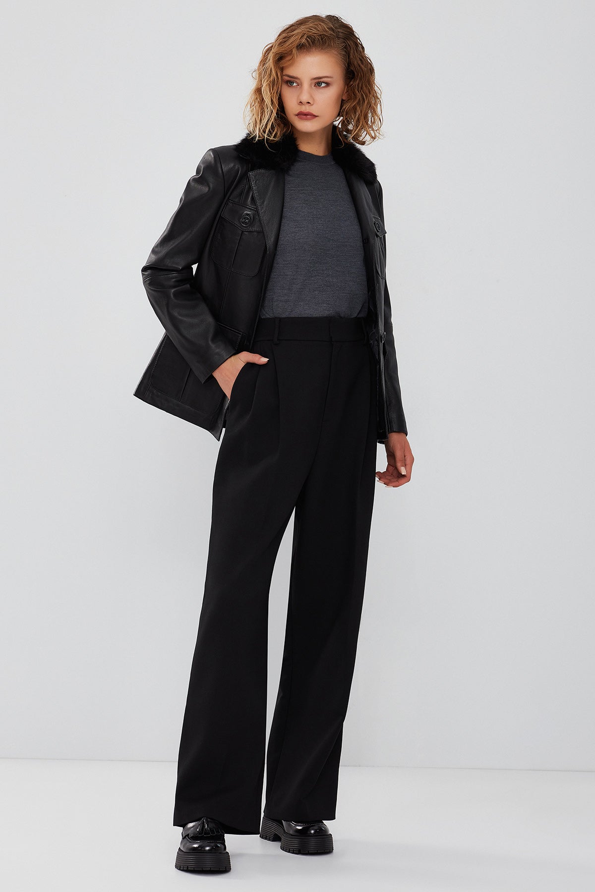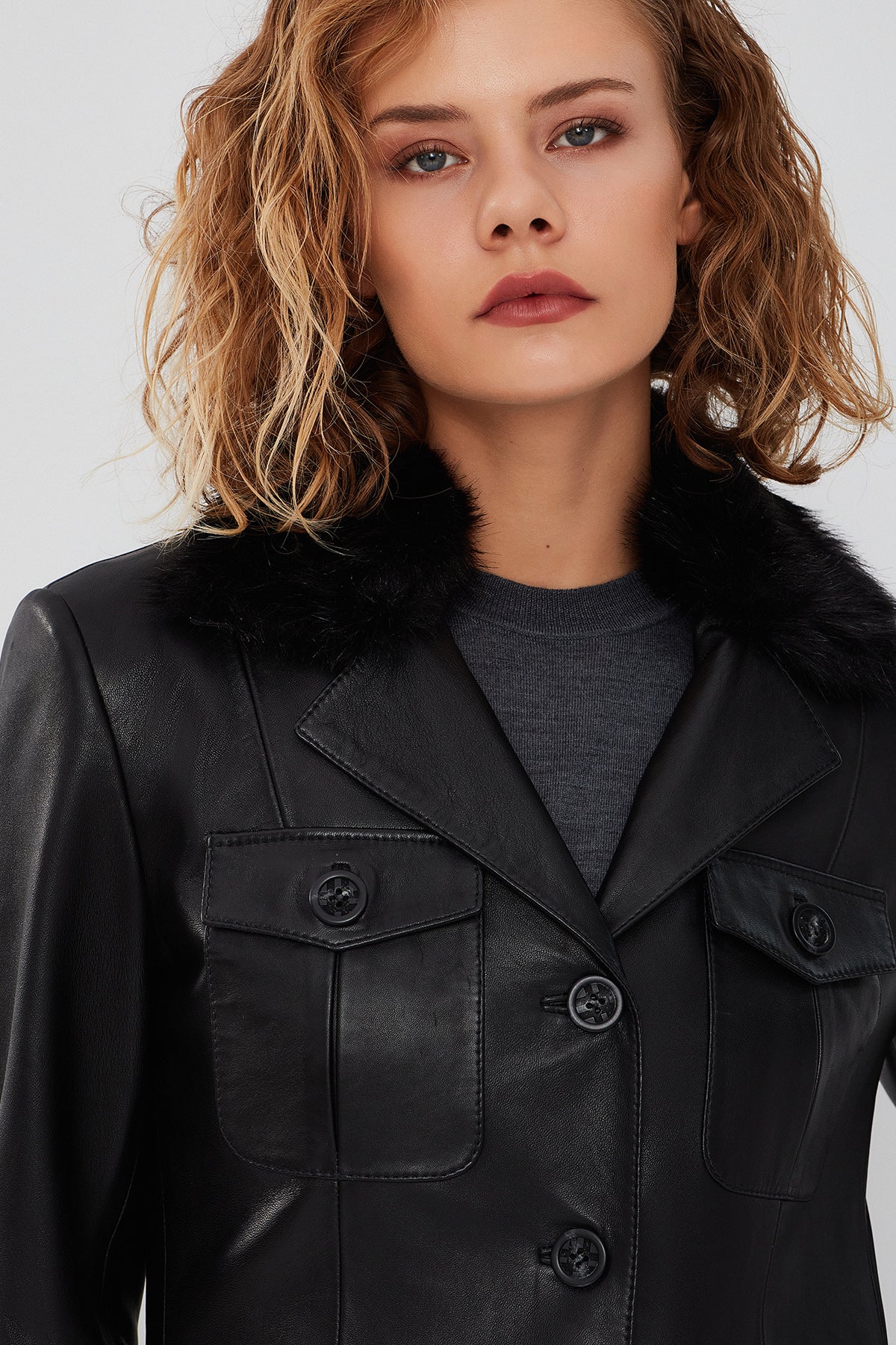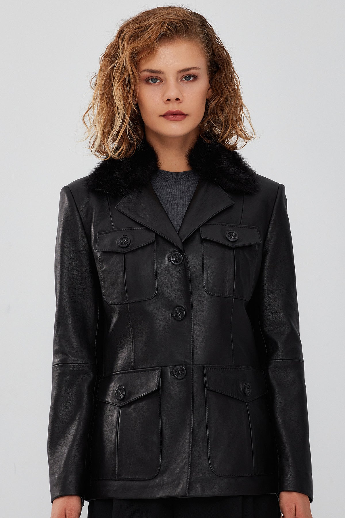 Anais Kadın Siyah Yakası Kürklü Blazer Deri Ceket