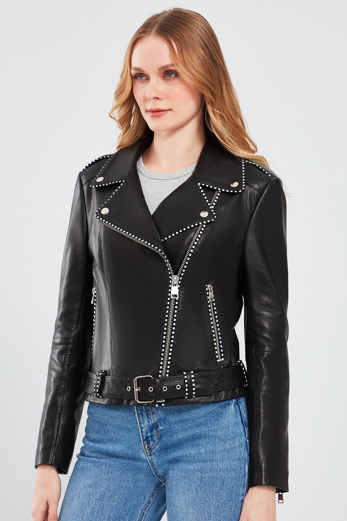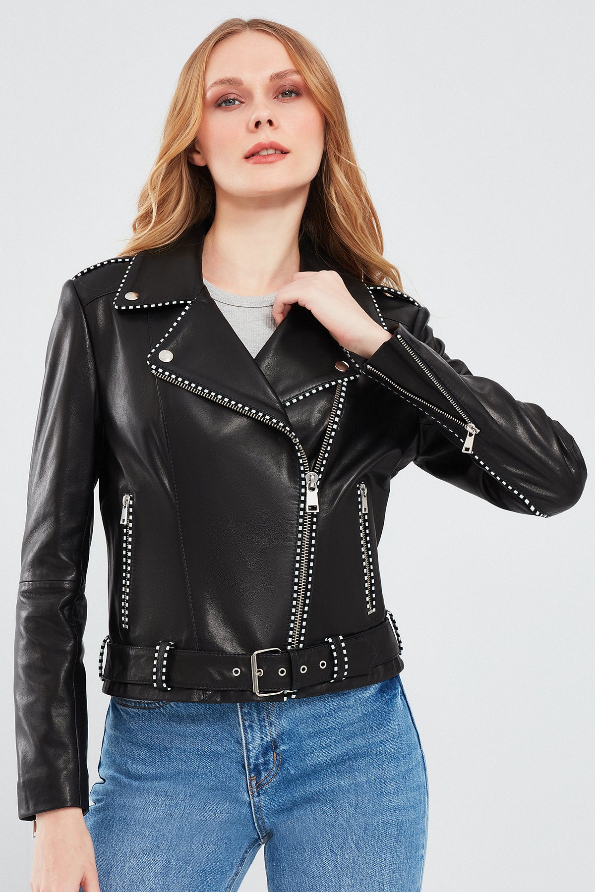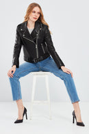 Derimod'un Angel Kadın Siyah Biker Deri Ceketi, tarzınıza ve görünümünüze modern bir dokunuş katıyor. Yüksek kaliteli deri malzemesiyle üretilen bu ceket, dayanıklılığı ve şıklığı bir arada sunuyor. Kruvaze yaka tasarımı ve özgün fermuar detaylarıyla dikkat çeken bu ceket, modern ve şık bir görünüm sağlar. Ceketin bel kısmında bulunan kemer detayı, vücuda hoş bir şekil verirken biker tarzını da vurgular. Angel Kadın Siyah Biker Deri Ceket, günlük kullanımdan özel günlerdeki kombinlerinize kadar geniş bir kullanım alanı sunar. Tarzınızı ve şıklığınızı vurgulamak için mükemmel bir seçimdir.