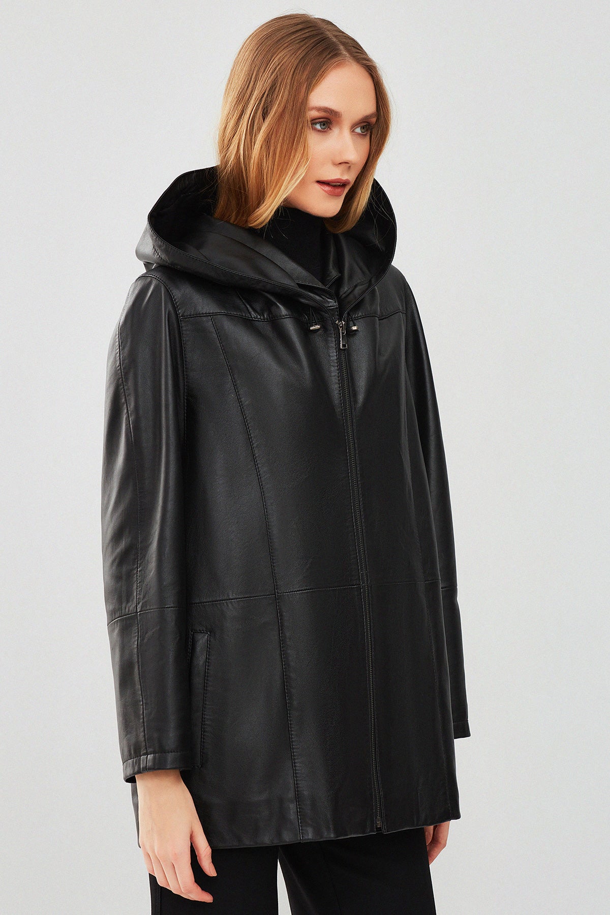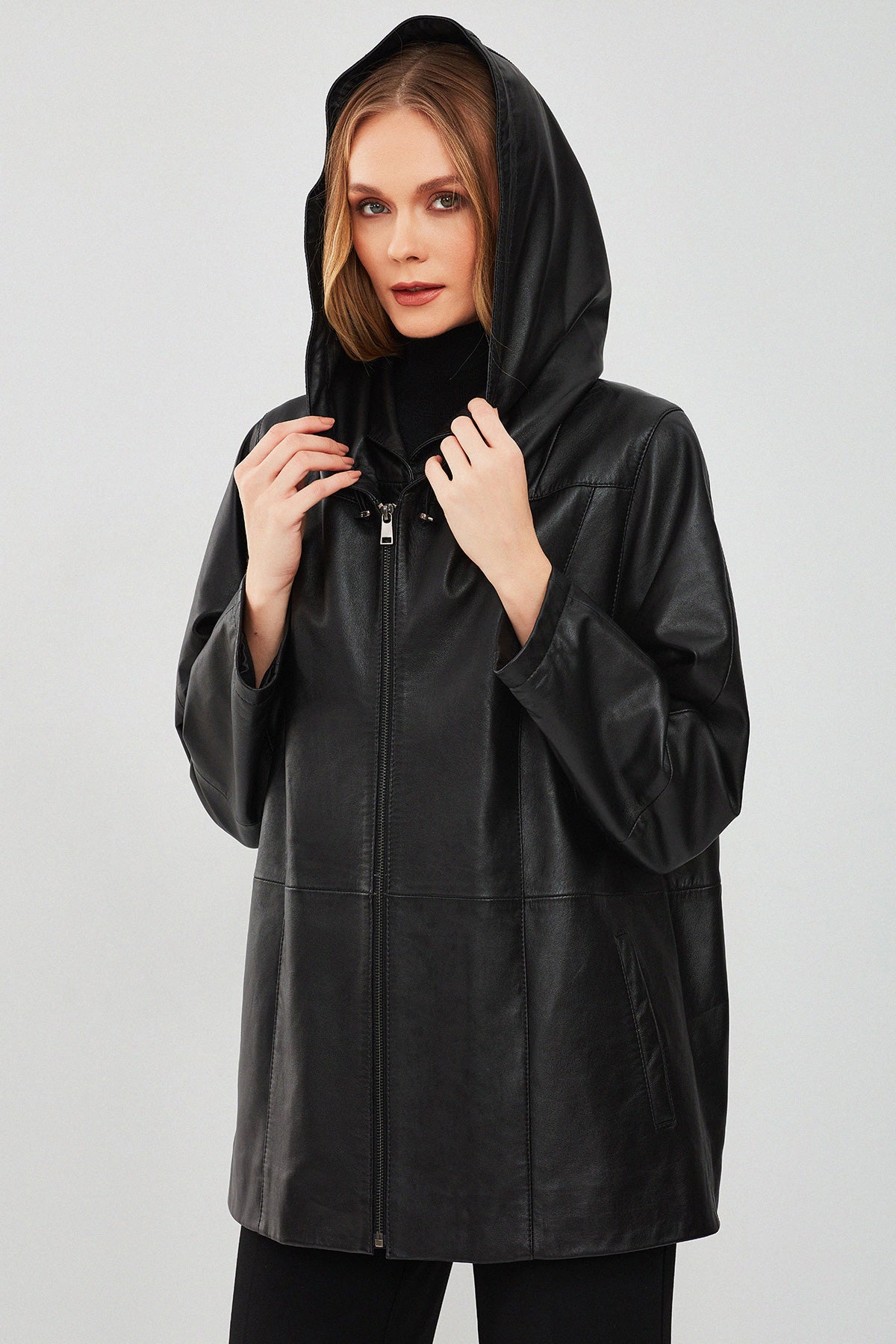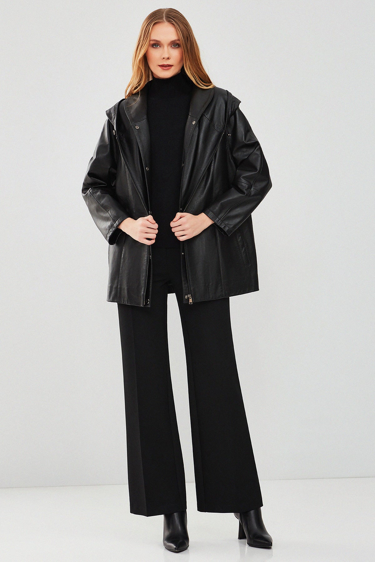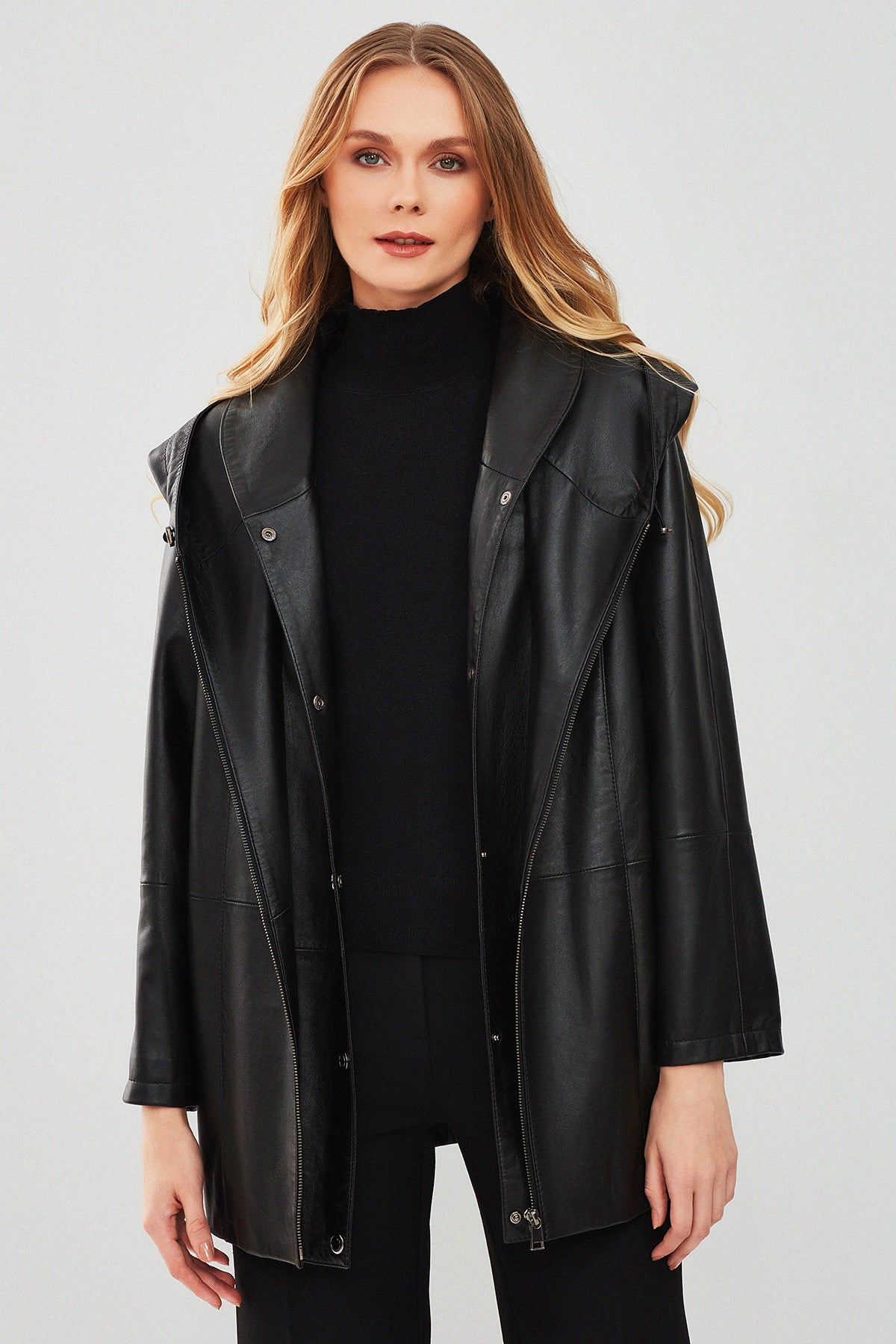 Anya Kadın Siyah Kapüşonlu Deri Mont