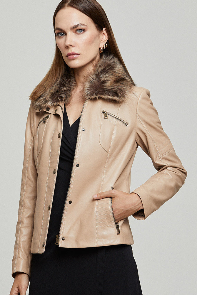 Belinda Kadın Bej Yakası Kürklü Deri Ceket