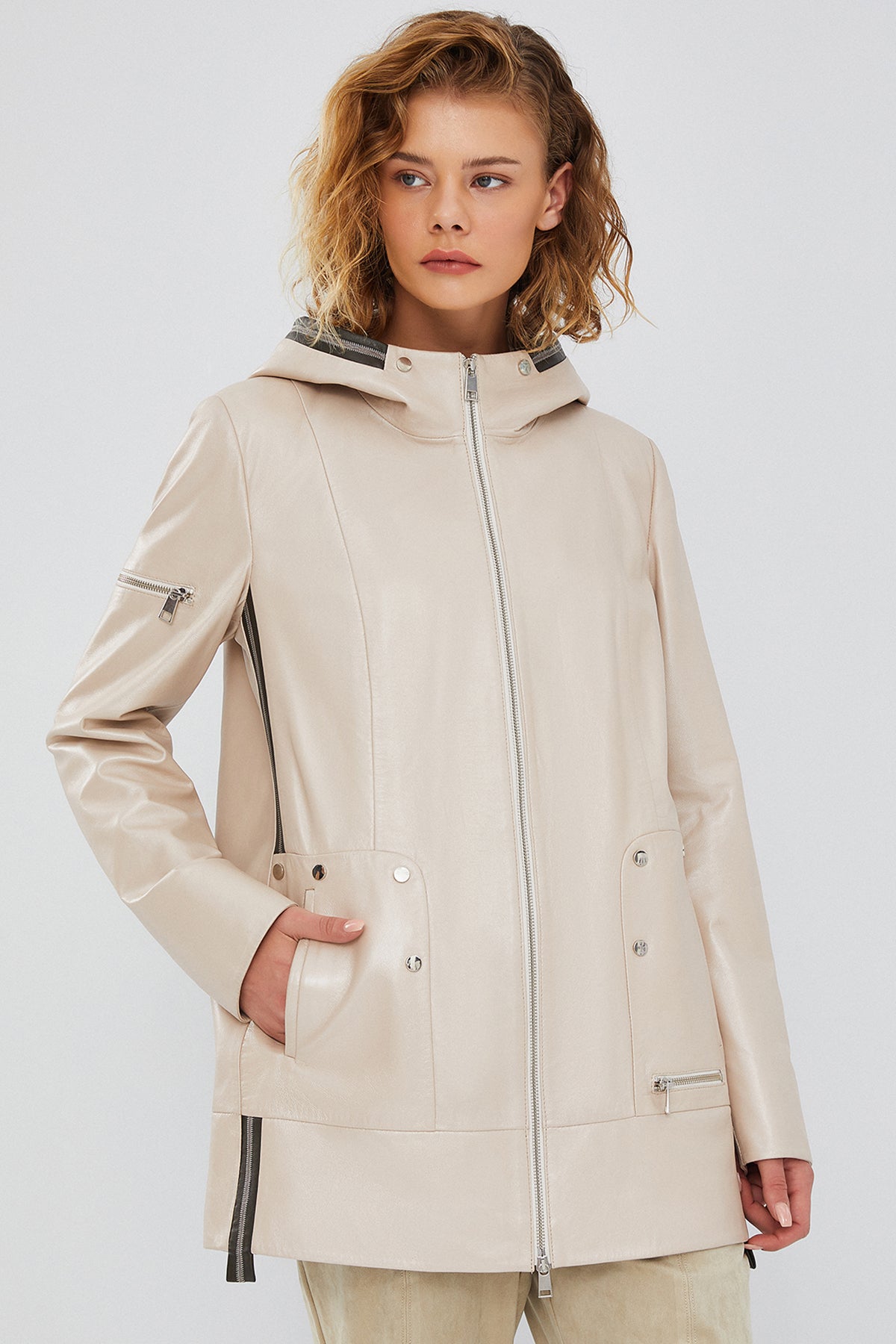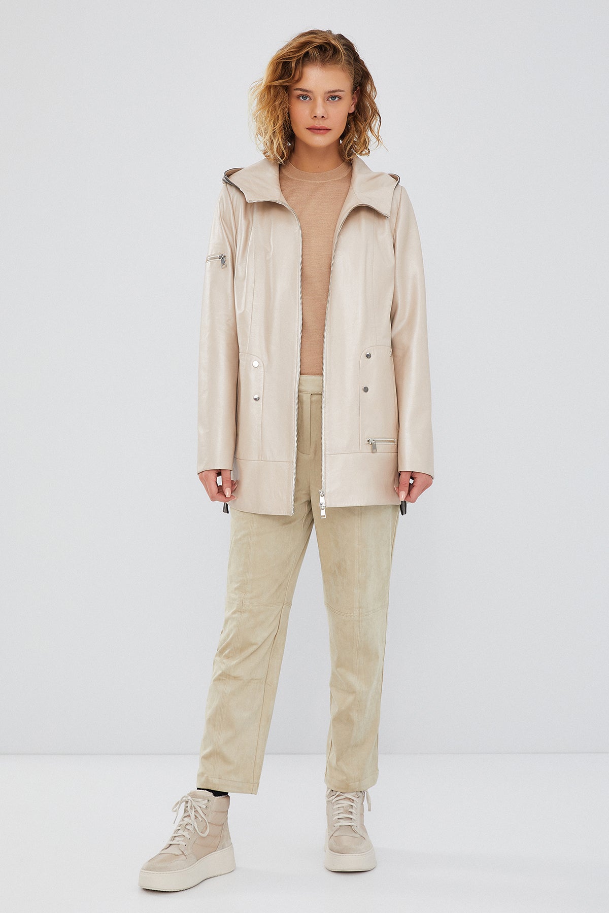 Chantal Kadın Bej Kapüşonlu Deri Kaban, zarif ve modern tasarımı ile dikkat çekiyor. Kaliteli deri materyal kullanılarak üretilen bu kaban, dayanıklılığı ve şıklığı bir araya getirir. Fermuarlı kapama sistemi pratik bir kullanım sağlarken, kapüşonlu tasarımı soğuk havalarda ekstra koruma sunar. A-form kesimi sayesinde rahat ve konforlu bir giyim deneyimi sunan bu kaban, her bedene uyum sağlar. Bej rengi ile her türlü kıyafetle mükemmel uyum sağlayan Chantal Kadın Kapüşonlu Deri Kaban, hem günlük kullanım hem de özel günler için ideal bir seçimdir. Bu kabanla her zaman şık ve tarz sahibi görüneceksiniz. Ürünün kodu: 23WGD5110U4 P8
