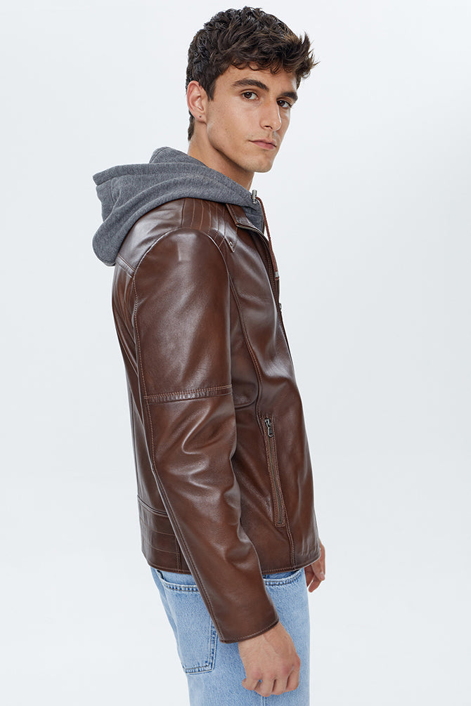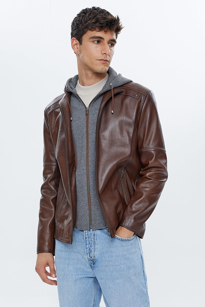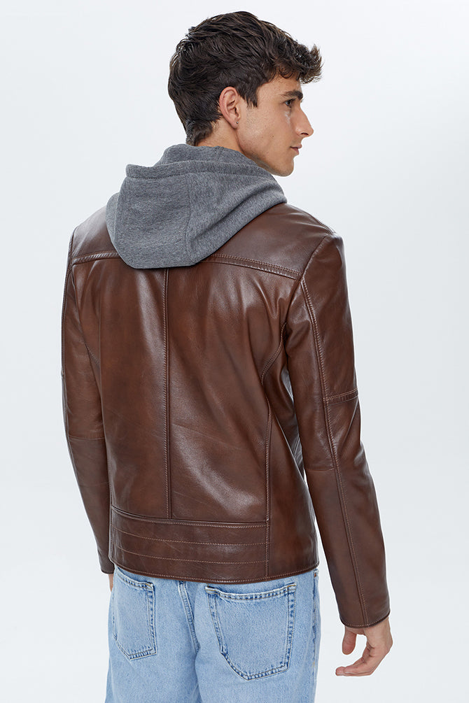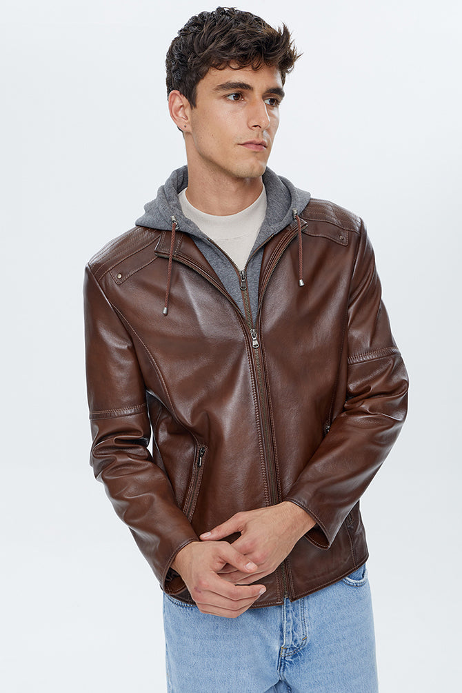 Danny Erkek Konyak Kapüşonlu Spor Deri Ceket