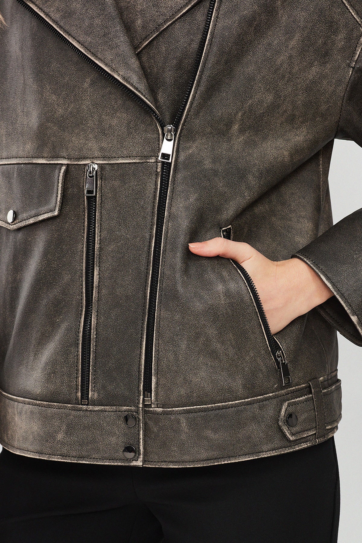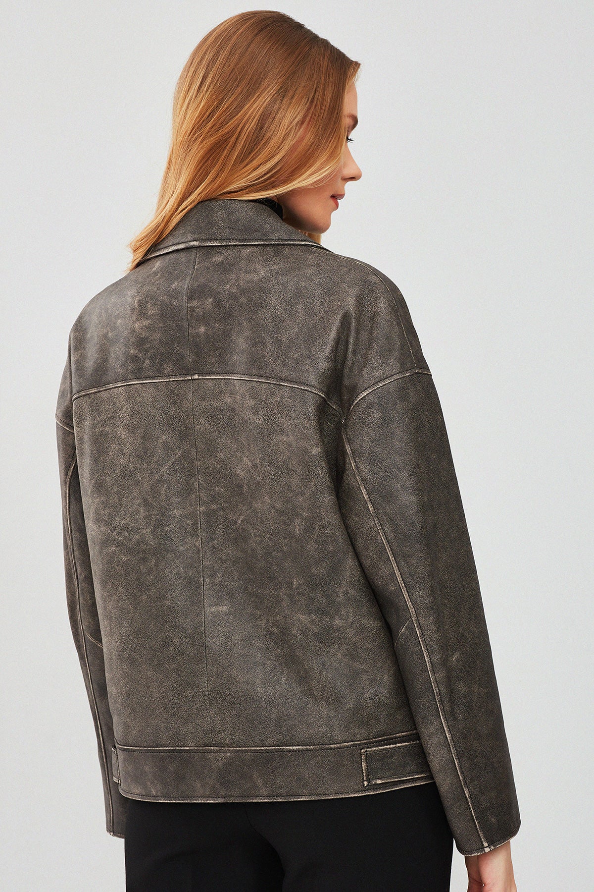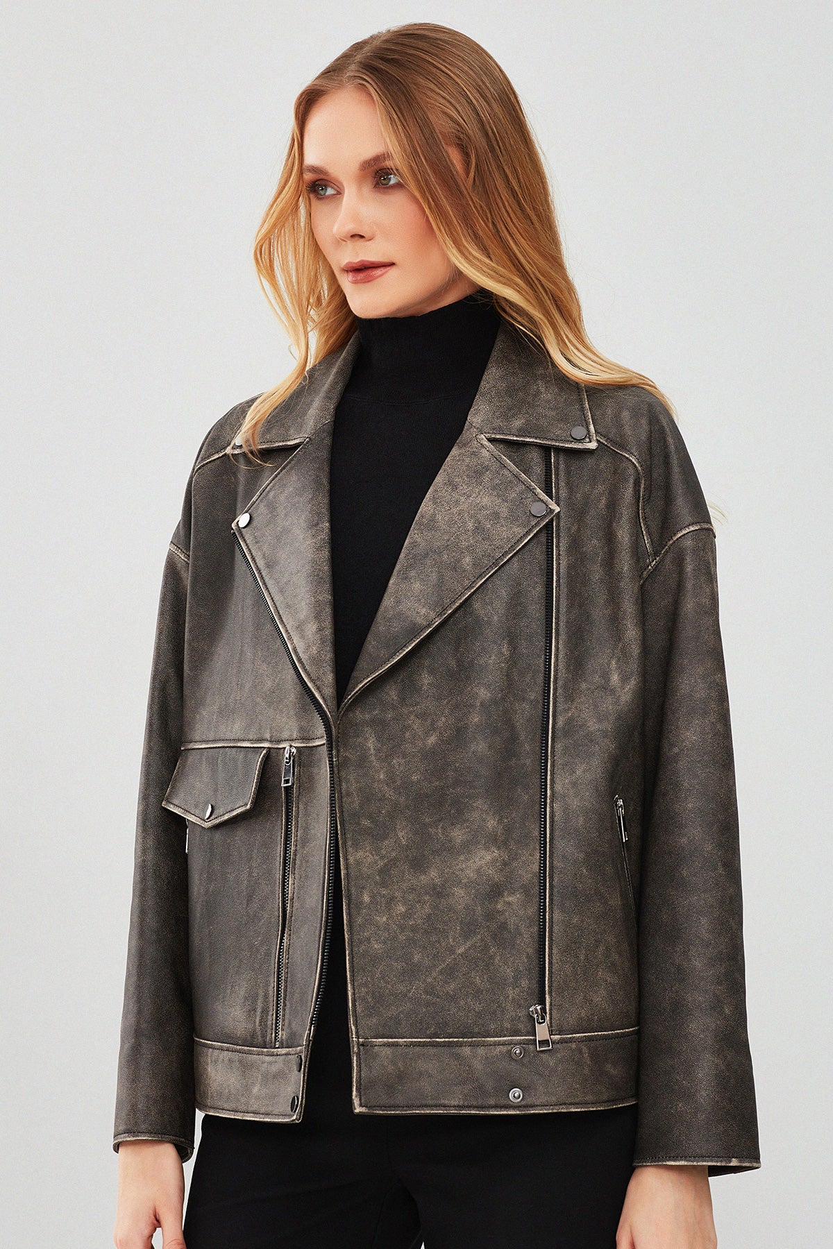 Delano Kadın Gri Vintage Oversize Biker Deri Ceket