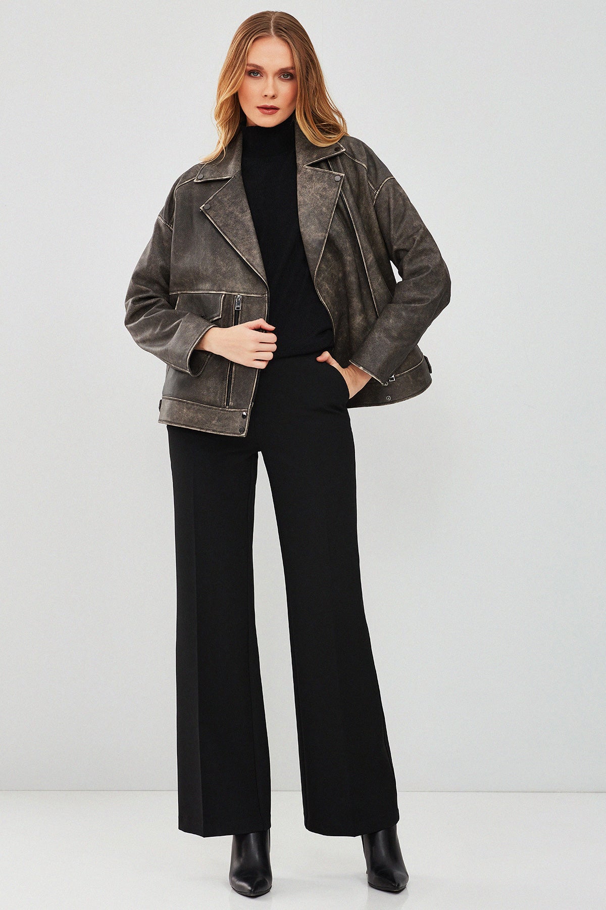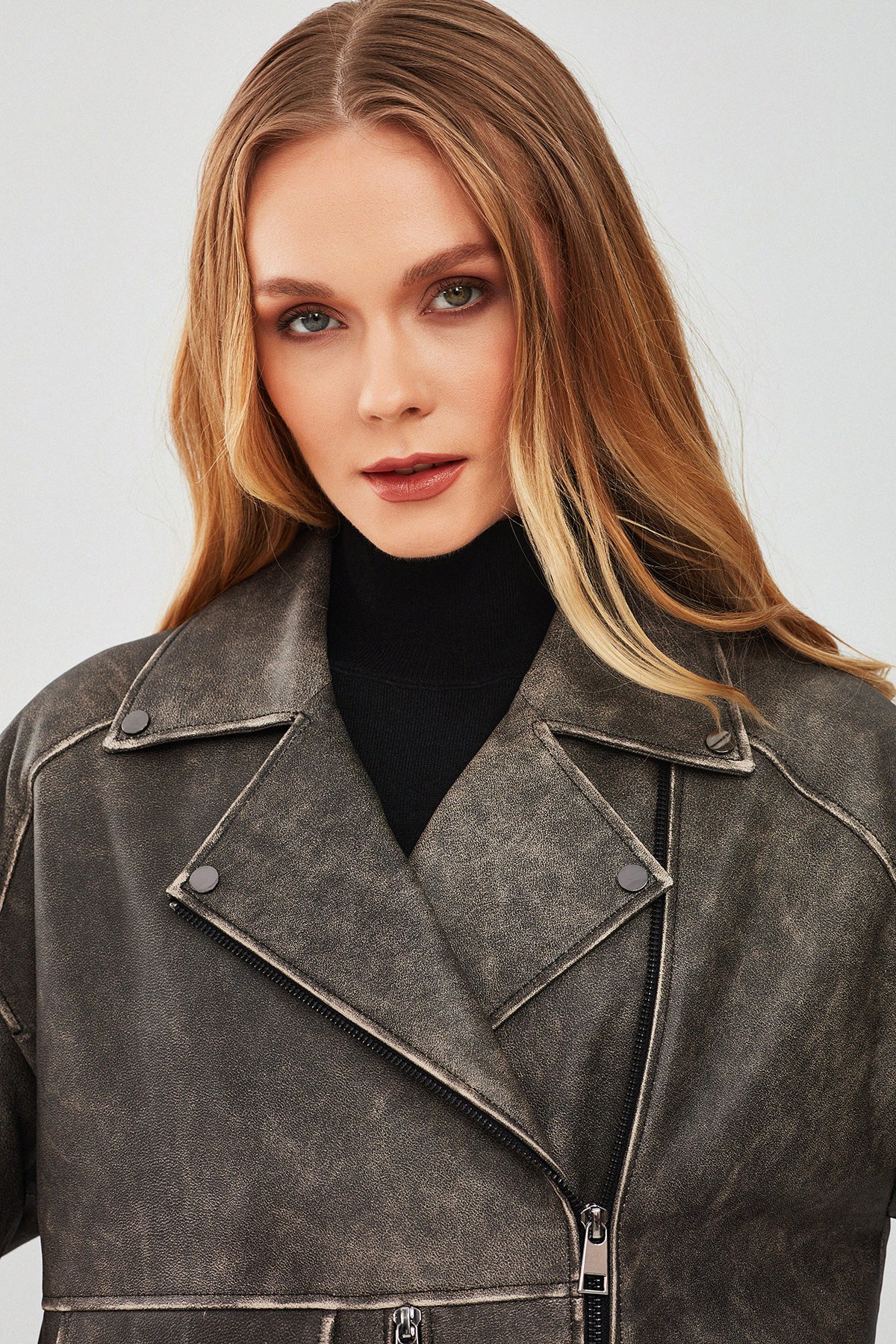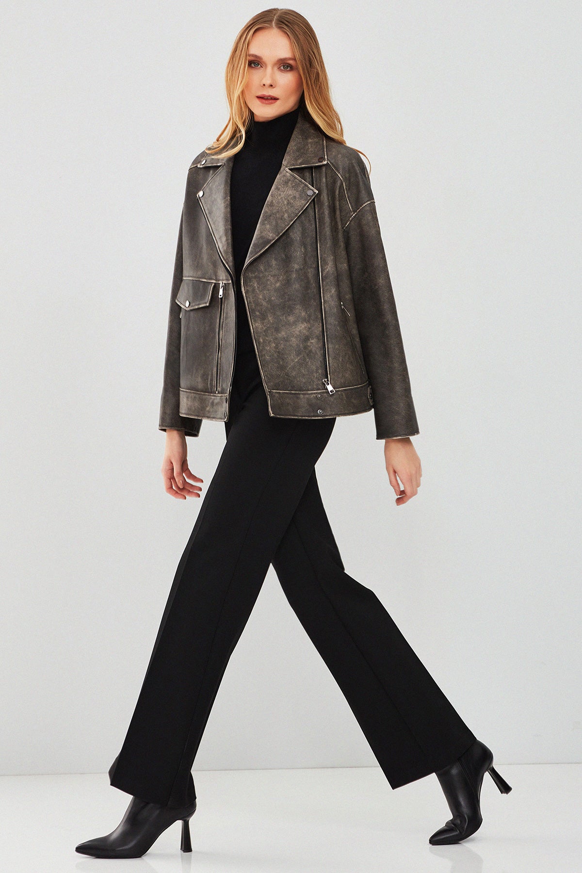 Delano Kadın Gri Vintage Oversize Biker Deri Ceket