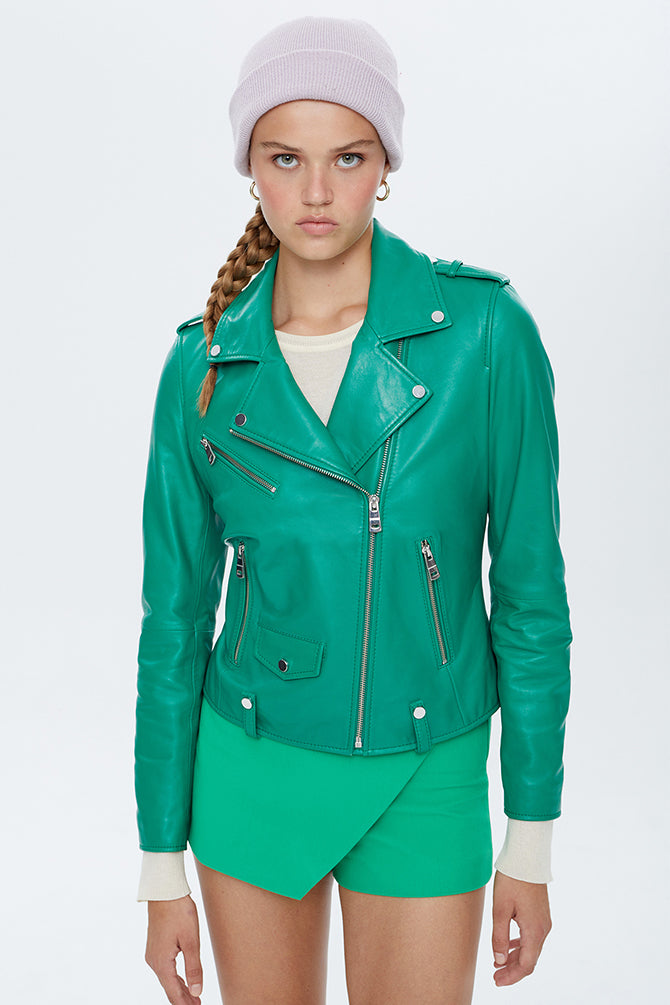 Deri modasının modern yorumu olan kiwi yeşili biker ceket, klasik tasarımı cesur bir renkle buluşturuyor. Asimetrik fermuarlı kapama detayı, fermuar cepleri ve yaka tasarımıyla motosiklet ceketlerinin karakteristik özelliklerini taşıyan model, yumuşak deri dokusuyla hem şık hem de rahat bir kullanım sunuyor. Slim fit kesimi vücut hatlarını nazikçe sararak feminen bir görünüm yaratırken, canlı yeşil rengi ile her kombinde fark yaratan bir statement parça olarak öne çıkıyor. Bahar ve yaz aylarında günlük kombinlerin vazgeçilmez parçası olacak bu ceket, basic tişört ve jean kombinlerinden elbise ve eteklere kadar geniş bir stil yelpazesine uyum sağlıyor. Product code: 22SGM5794U4