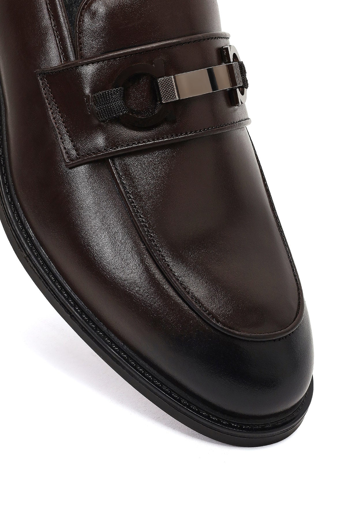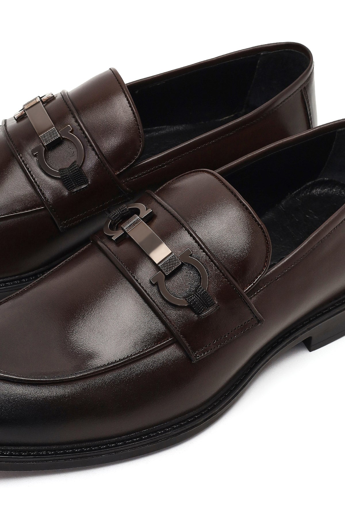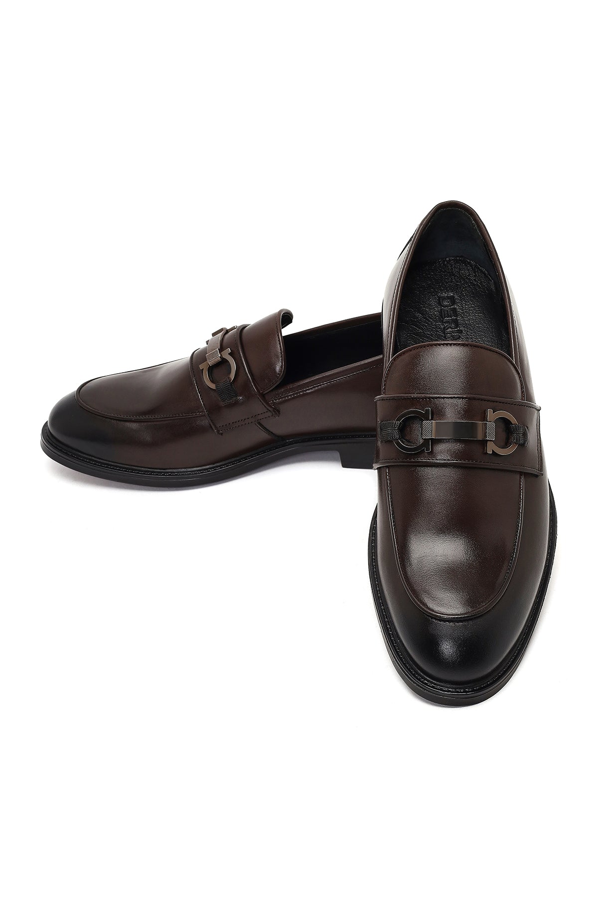 Kahverengi vidala deri yüzeyi parlak dokusuyla klasik şıklık sunarken, vamp bölgesindeki altın tonlu metal toka detayı ayakkabıya maskülen karakter kazandırmaktadır. 2,5 cm yüksekliğindeki düşük topuk yapısı günlük kullanımda dengeli duruş sağlarken, slip-on tasarımı kolay giyim imkanı sunmaktadır. Deri iç astar nefes alabilir yapı oluştururken ayak sağlığını destekler ve uzun süreli kullanımda konfor sağlar. Oval burun formu ayağa doğal görünüm kazandırırken, geniş ayak yapısına uyum göstermektedir. Yan panel dikişleri sağlam yapıyı desteklerken, topuk arkası yüksek destek sunarak ayak stabilitesini artırmaktadır. Taban yapısı düz profil oluştururken kaymaz özellik gösterir ve zemin tutuşunu güçlendirir. Ağız çevresi düz kesim ile tasarlanmış olup ayağa kolay girişi mümkün kılmaktadır. Mevsim geçişlerine uygun yapısıyla farklı hava koşullarında kullanılabilir özellik taşımaktadır. Ofis ortamından günlük aktivitelere, sosyal etkinliklerden iş toplantılarına kadar geniş kullanım alanına sahiptir. Klasik loafer siluetini modern detaylarla harmanlayan tasarım anlayışı, zamansız şıklığı günümüz trendleriyle buluşturmaktadır. Ürün kodu: 25WFD664018