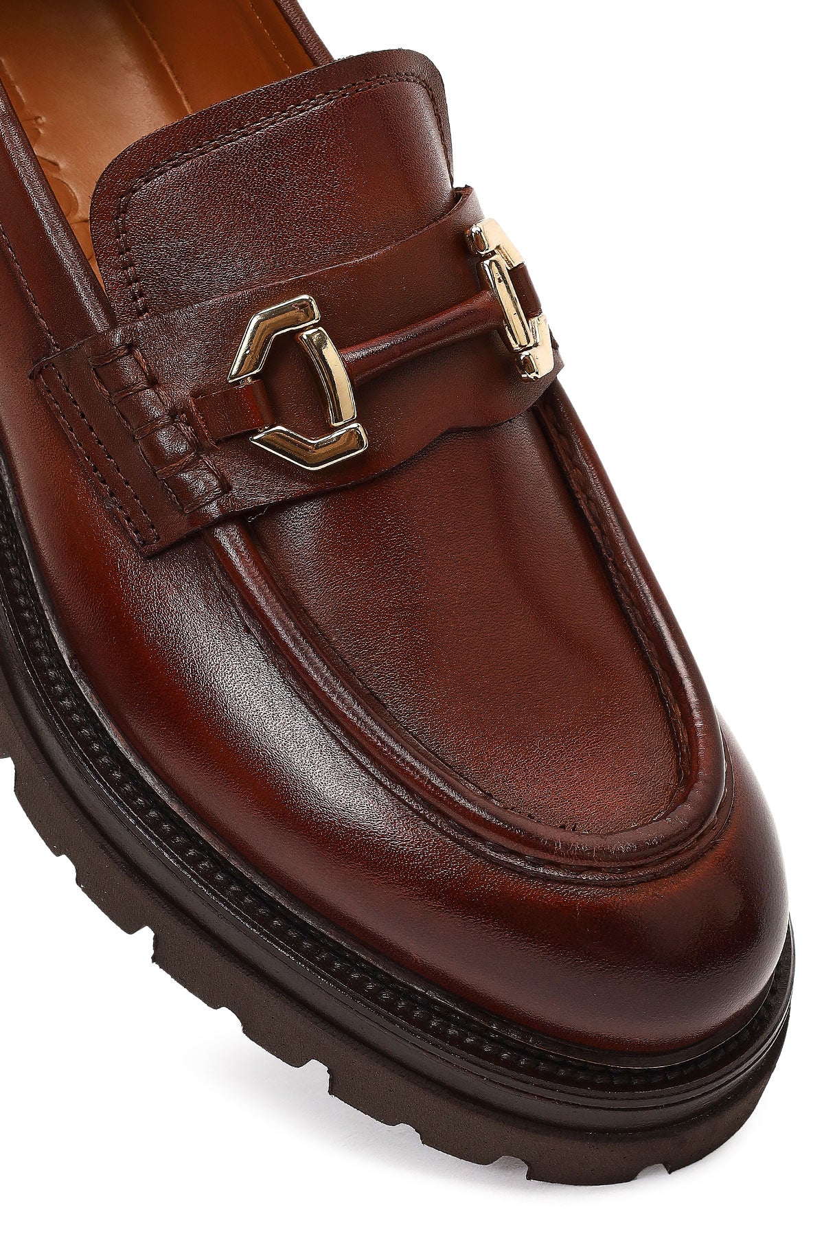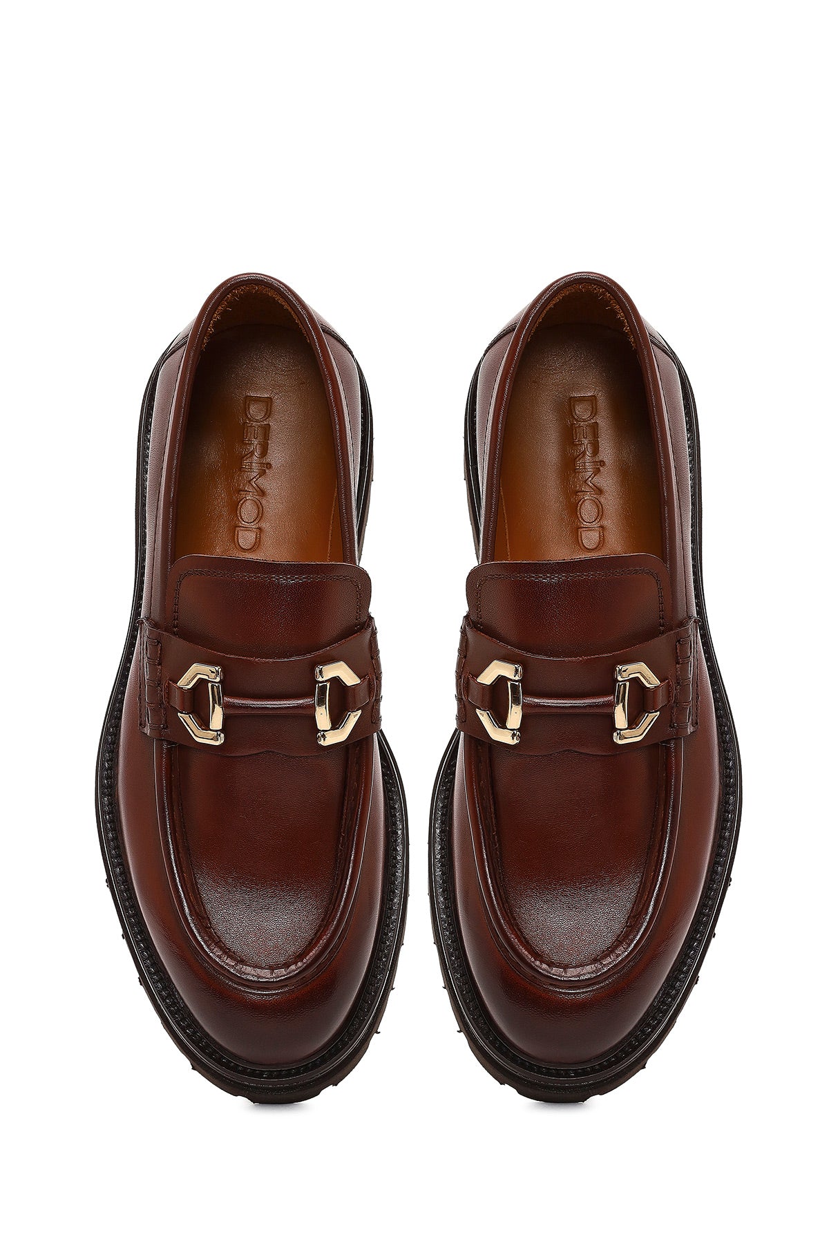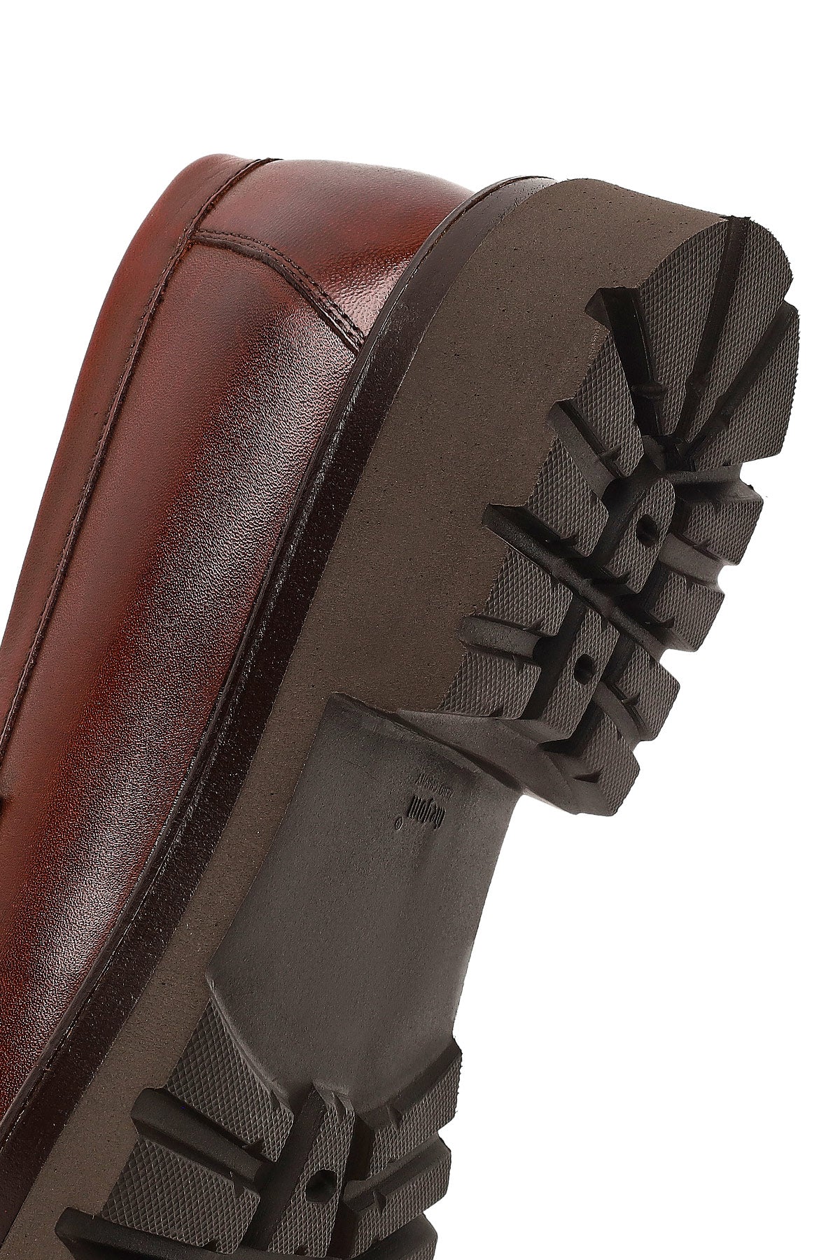Kalın tabanlı yapısı ve metal toka detayıyla dikkat çeken erkek loafer modeli, vidala deri malzemeden üretilmiştir. Parlak kahverengi deri yüzeyi pürüzsüz dokusuyla şık görünüm sunarken, vamp bölgesindeki altın tonlu metal toka ayakkabıya maskülen karakter katmaktadır. 2 cm yüksekliğindeki kalın kauçuk taban, oluklu desen yapısıyla kayma önleyici özellik gösterirken platform etkisi yaratmaktadır. Deri iç astar nefes alabilir yapı sağlarken, ayak tabanına yumuşak temas hissi vermektedir. Klasik loafer siluetini modern kalın taban trendi ile birleştiren tasarım, günlük kullanımda konfor ve stil dengesini kurmaktadır. Oval burun formu ayağa doğal görünüm kazandırırken, ağız çevresindeki düz kesim kolay giyim imkanı sunmaktadır. Mevsim geçişlerine uygun yapısıyla farklı hava koşullarında kullanılabilir özellik taşımaktadır. Ofis ortamından günlük aktivitelere kadar geniş kullanım alanına sahip olan model, casual şıklığı modern detaylarla harmanlayan tasarım anlayışını yansıtmaktadır. Ürün kodu: 25WFD740018