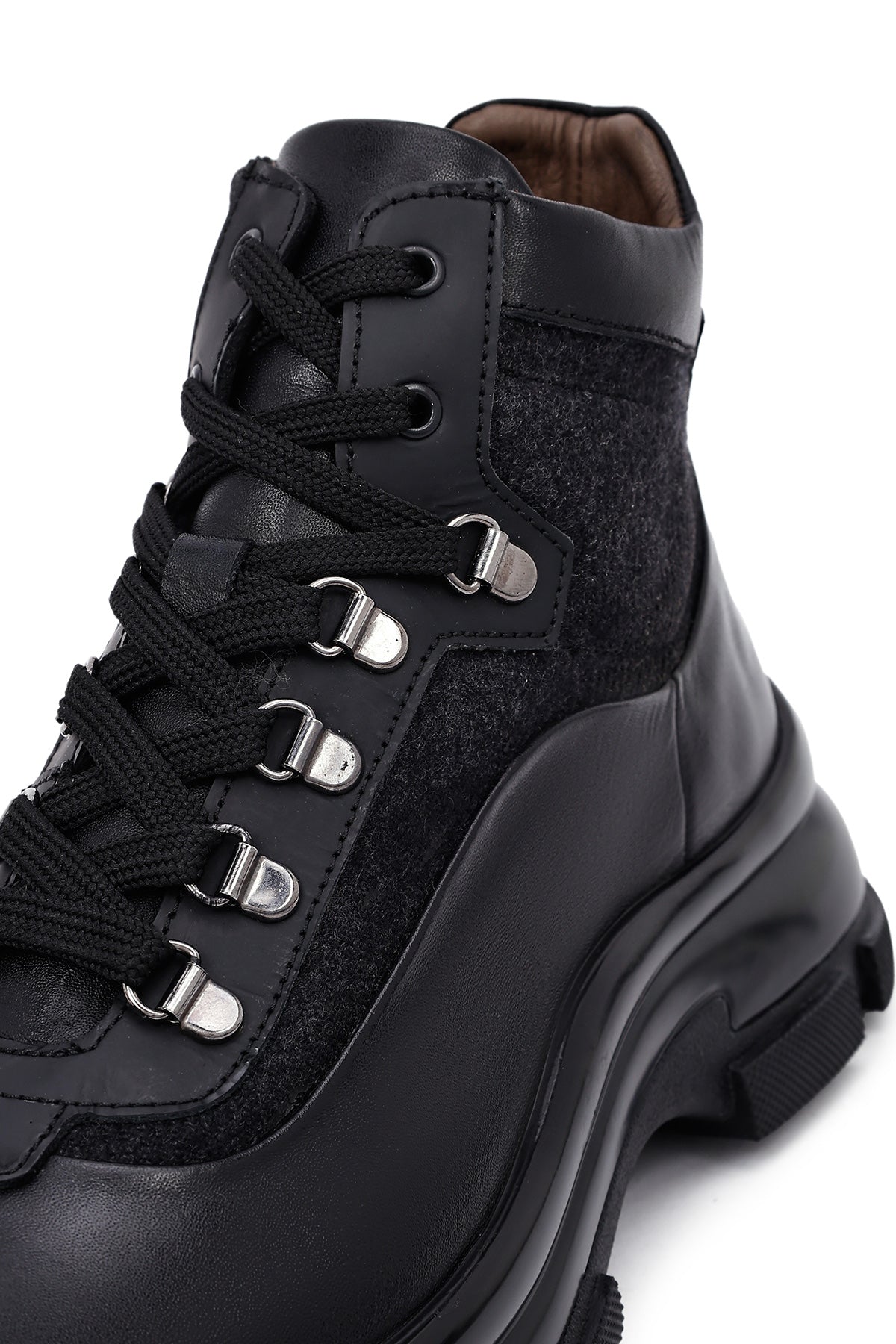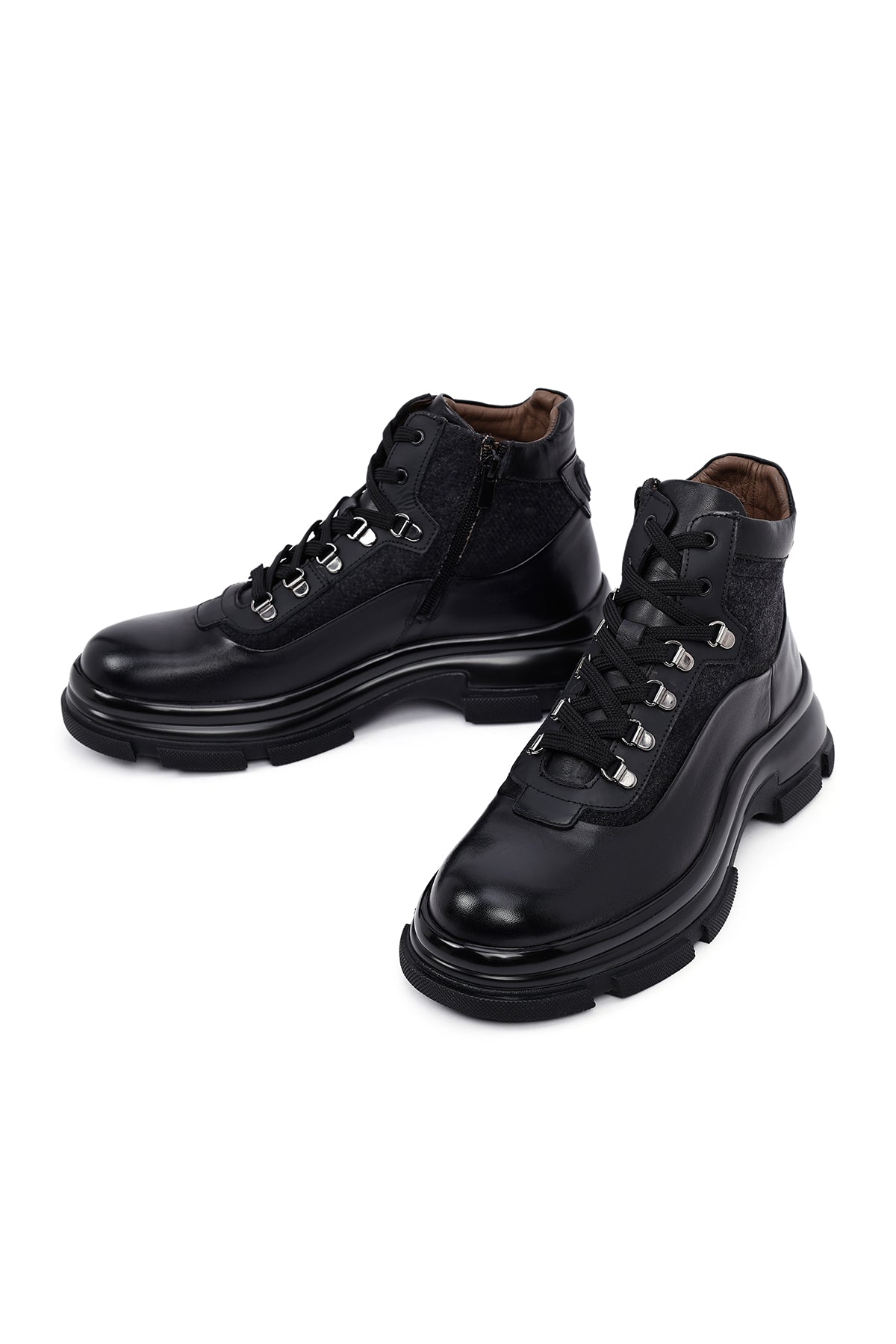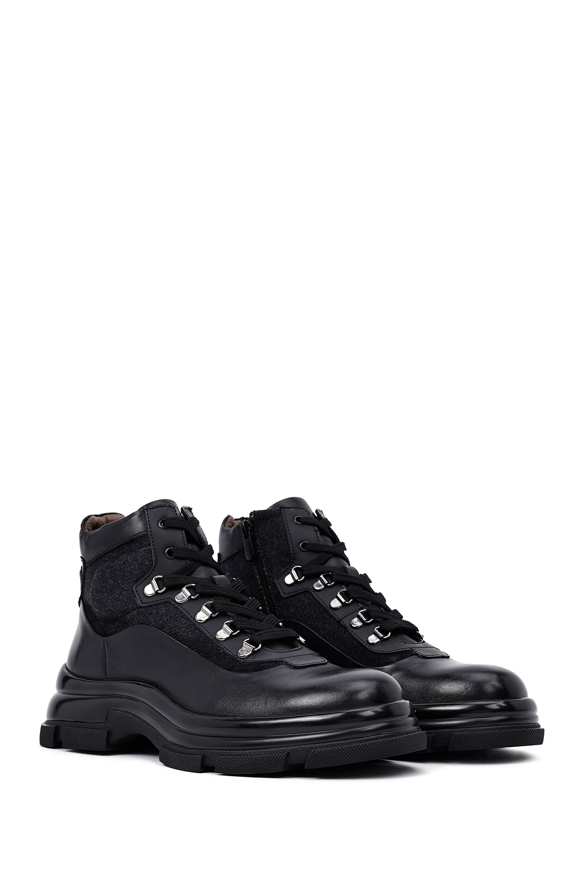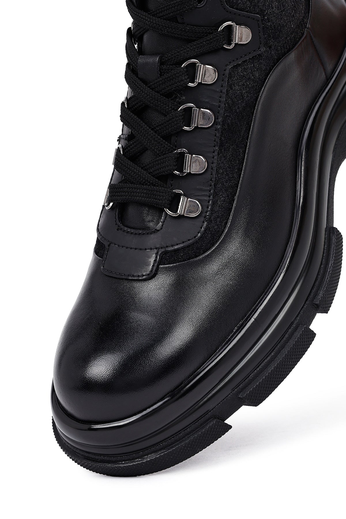 Klasik erkek ayakkabıcılığının çağdaş yorumunu sunan erkek siyah deri bot modeli, geleneksel bot estetiğini modern detaylarla harmanlıyor. Siyah deri malzemeden üretilen bot, karışık deri özelliği sayesinde farklı doku ve parlaklık tonlarında yüzey zenginliği sunuyor. Bilek yüksekliğinde tasarlanan modelin en dikkat çekici özelliği yan tarafında yer alan fermuar detayı olup, bu yapı hem estetik bir unsur hem de pratik giyim kolaylığı sağlıyor. Bağcıklı tasarımı sayesinde ayağı destekleyen yapı oluşturuluyor ve kişisel ayak yapısına uygun oturum imkanı sunuluyor. Metal gözlü bağcık sistemi dayanıklılık katarken görsel olarak da ürüne karakter kazandırıyor. 1,5 cm topuk yüksekliği günlük kullanımda dengeli duruş sağlarken, deri iç astar nefes alan yapısı ile ayak sağlığını destekliyor. Kalın taban profili zemin tutuşunu artırırken, oluklu taban deseni farklı yüzeylerde güvenli yürüyüş imkanı veriyor. Siyah renk tonunun zamansız estetiği, farklı giyim tarzlarıyla uyum sağlayabilen çok yönlü bir yapı ortaya koyuyor. Deri malzemenin doğal dokusu ve mat yüzey görünümü, botun genel karakterini güçlendiren unsurlar arasında yer alıyor. Erkek bot kategorisinde öne çıkan model, ofis kullanımından günlük aktivitelere kadar geniş bir yelpazede tercih edilebiliyor. Ürün kodu: 25WFD605214