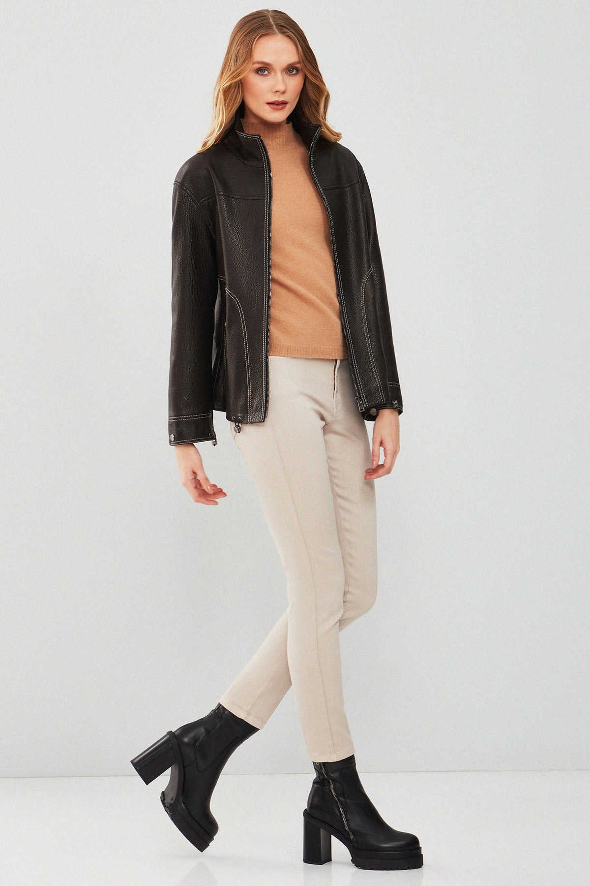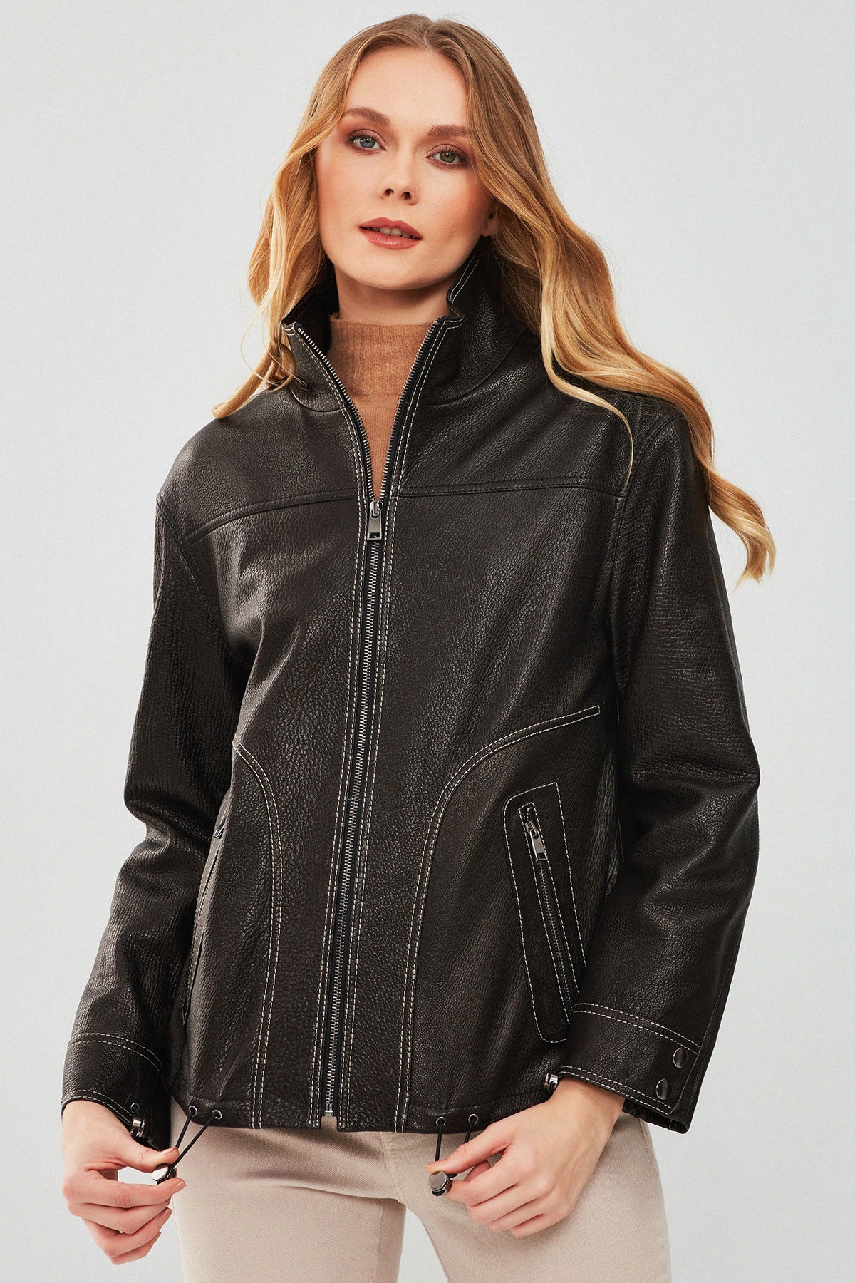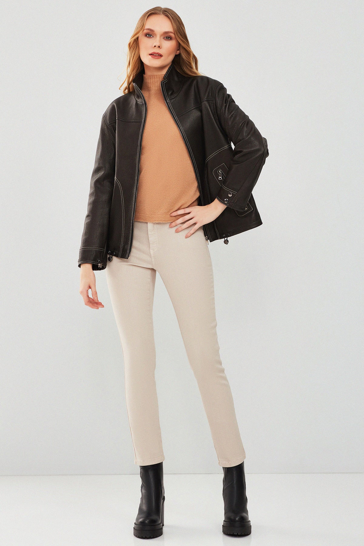 Evita Kadın Siyah Oversize Deri Ceket, geniş ve rahat kalıbı ile dikkat çekerken şıklığı da elden bırakmıyor. Kaliteli deri materyalden üretilmiş bu ceket, uzun ömürlü kullanım sunar. Fermuarlı kapama sistemi, kolay ve hızlı giyip çıkarma imkanı sağlar. Hakim yaka detayı, cekete modern bir dokunuş katarken A-form kalıbı rahat bir giyim deneyimi sunar. Geniş kesimi sayesinde her bedene uyum sağlayan Evita Kadın Siyah Oversize Deri Ceket, günlük kombinlerinizin vazgeçilmez bir parçası olacak. Hem rahat hem de şık görünmek isteyenler için ideal bir seçim. Ürünün kodu: 23WGD5152JB 11