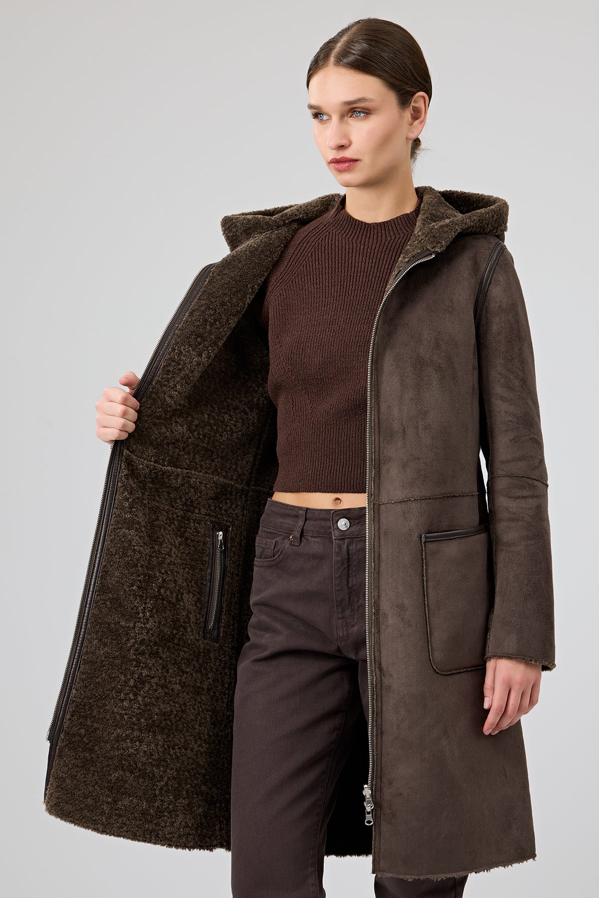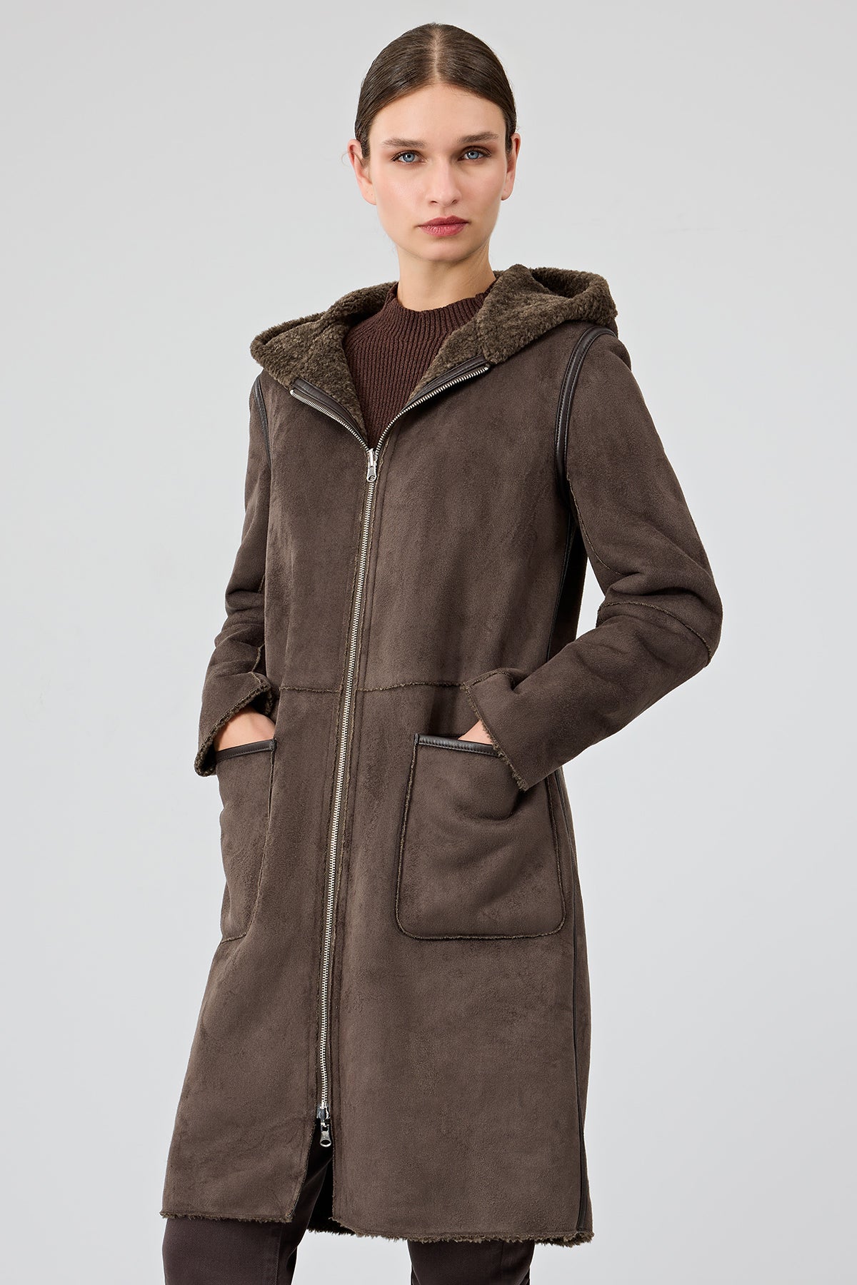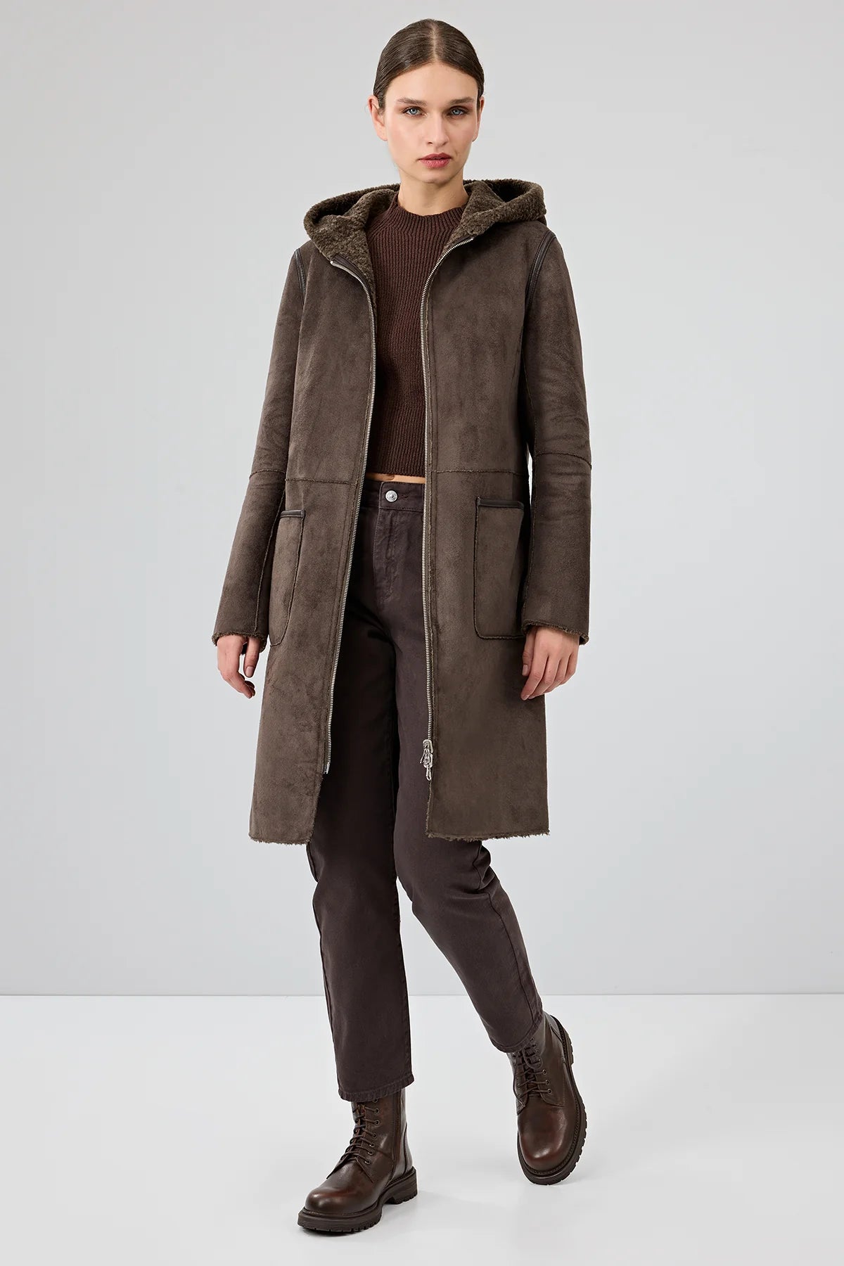 Derimod’un Zarifliği ve Şıklığı bir arada sunan Fiorentini Kadın Kahverengi Çift Taraflı Kapüşonlu Teddy Kaban ile tarzınızı konuşturun. Ürünün kodu: 25WGP53149F 2D