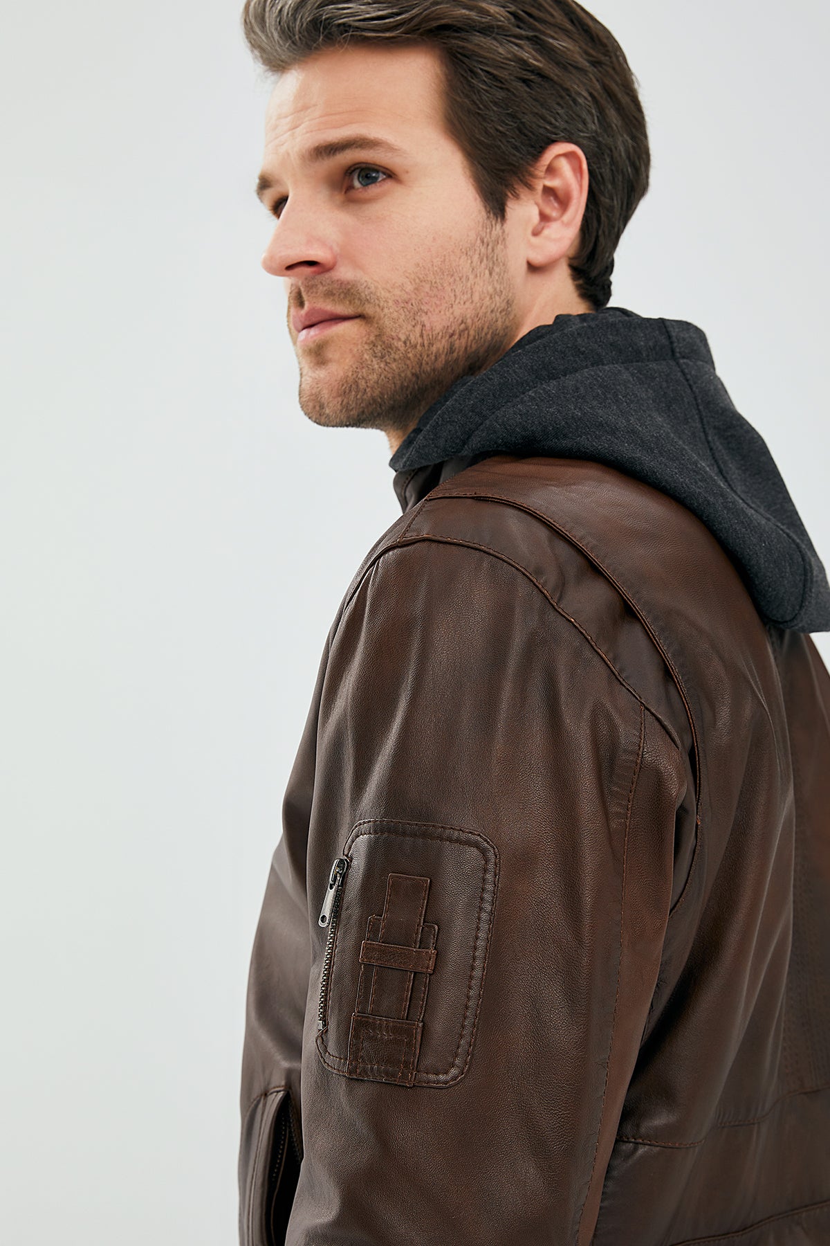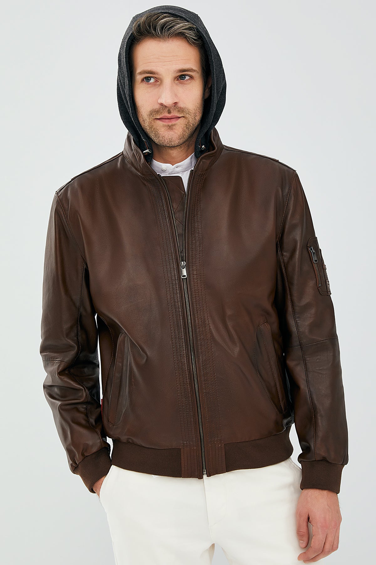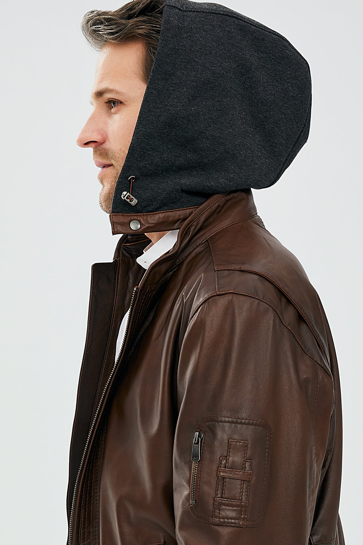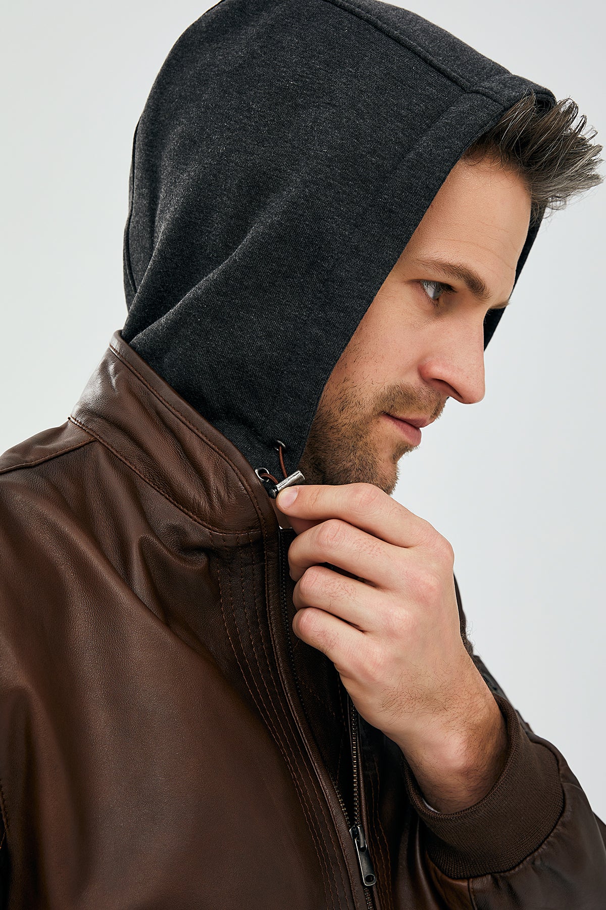 Garry Erkek Konyak Kapüşonlu Deri Mont