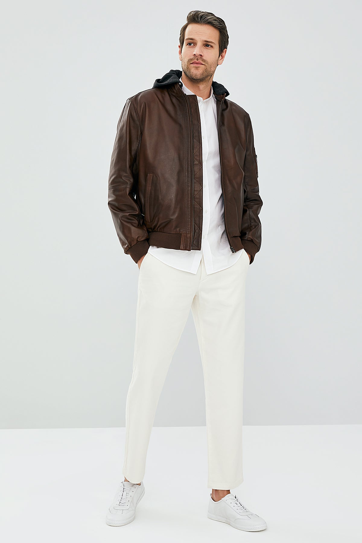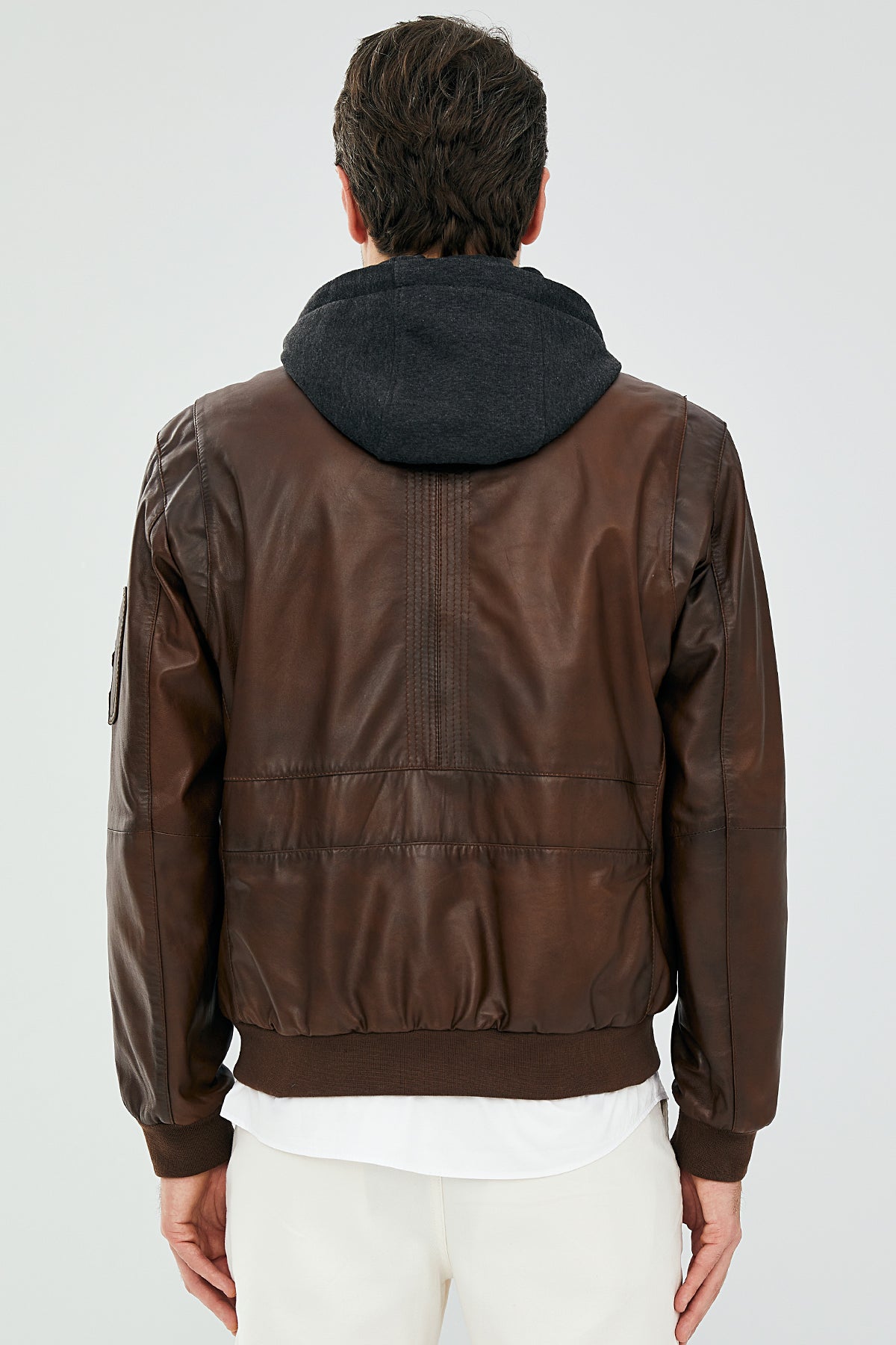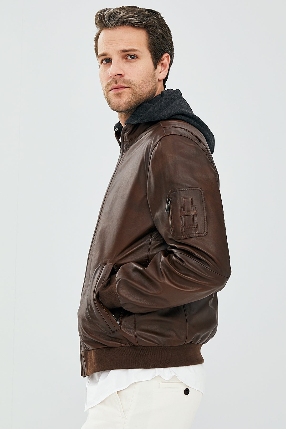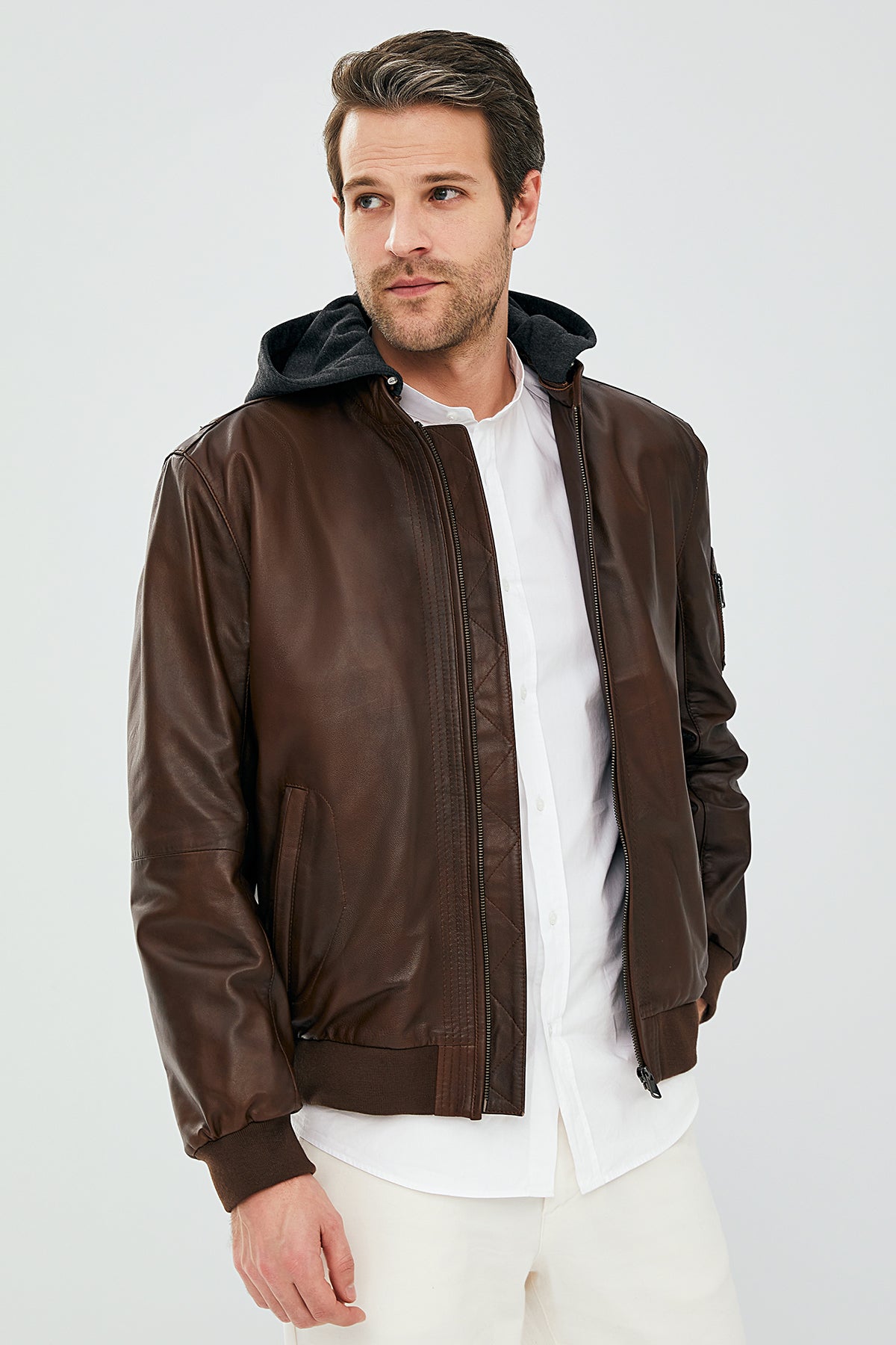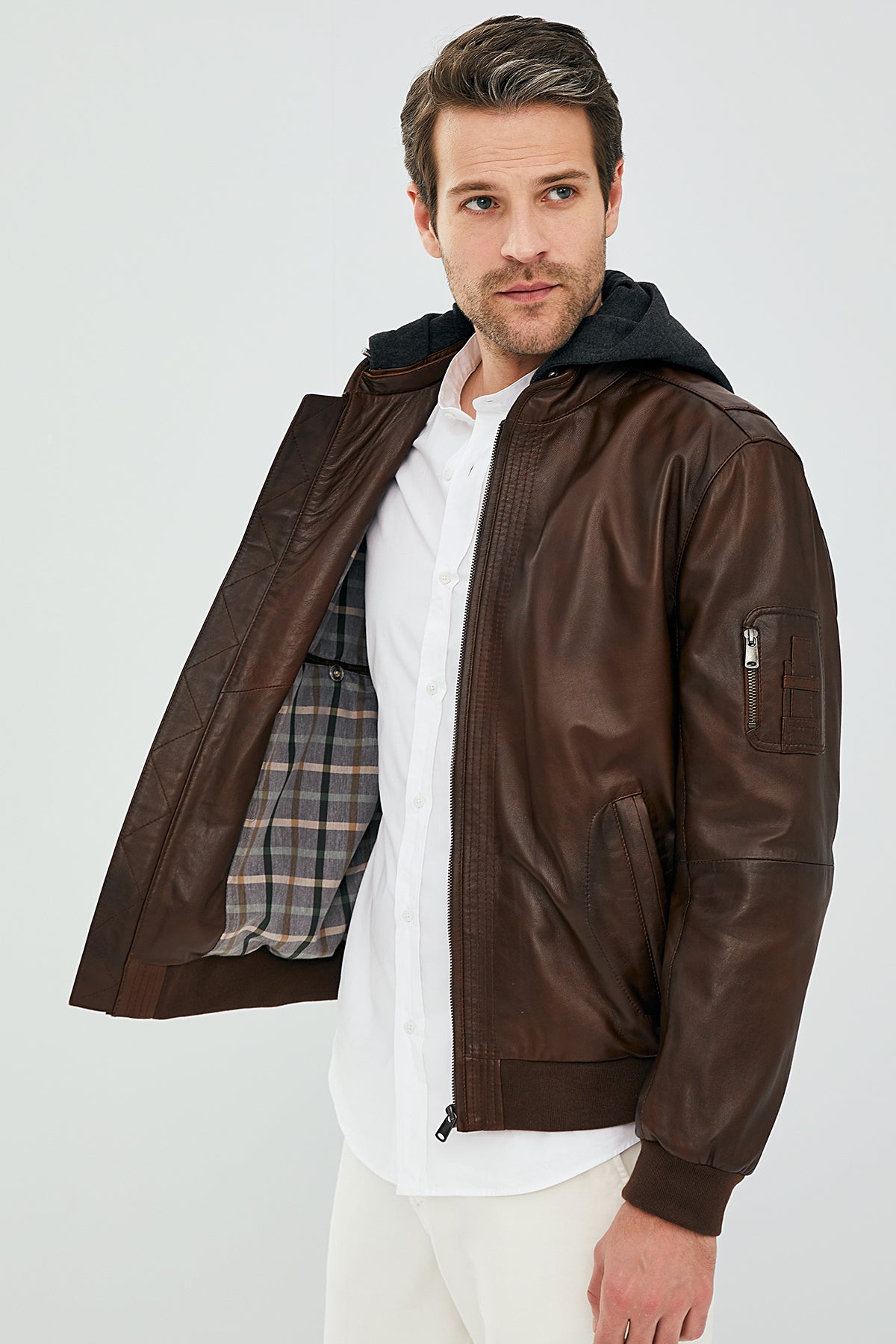 Garry Erkek Konyak Kapüşonlu Deri Mont