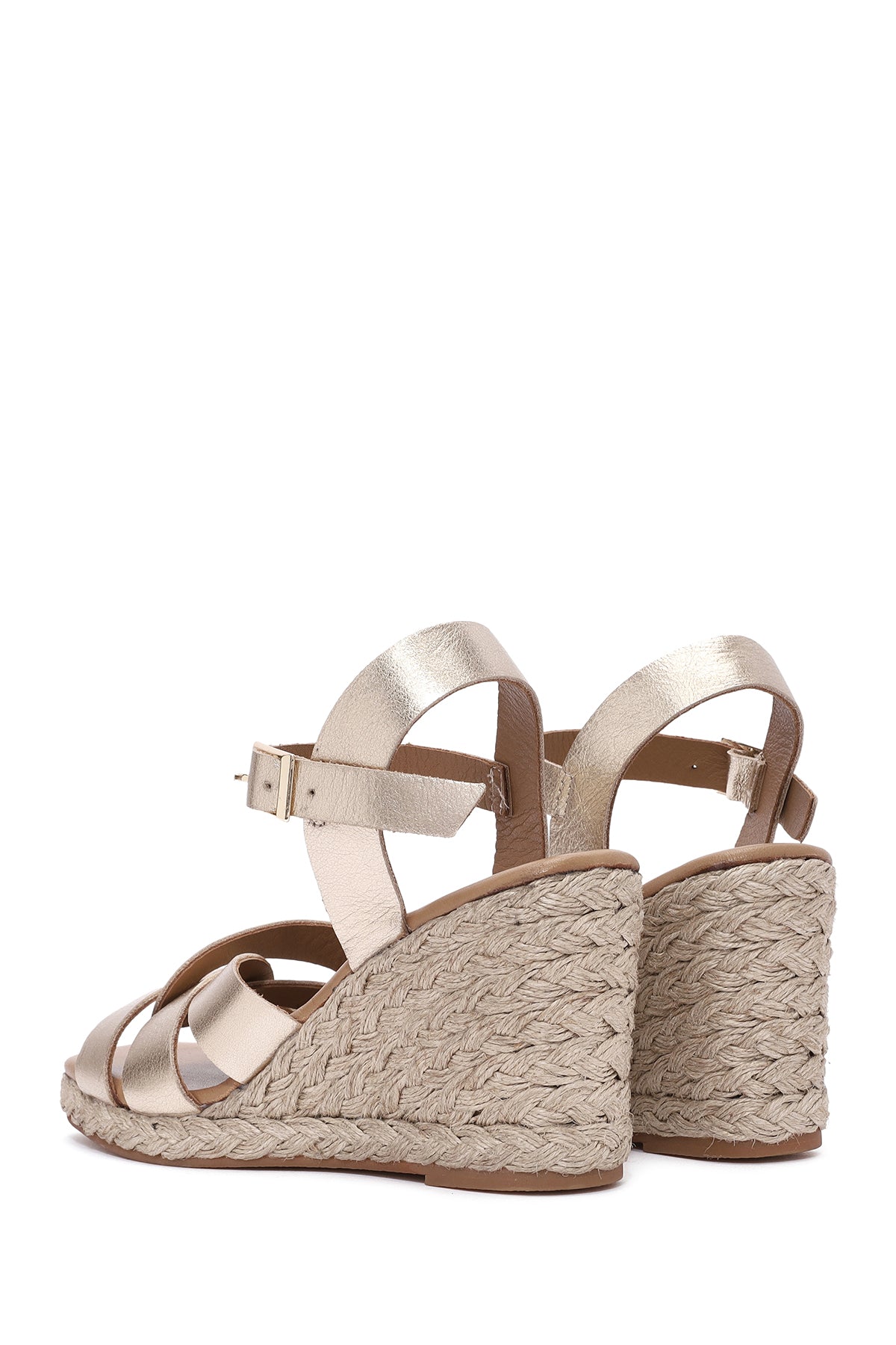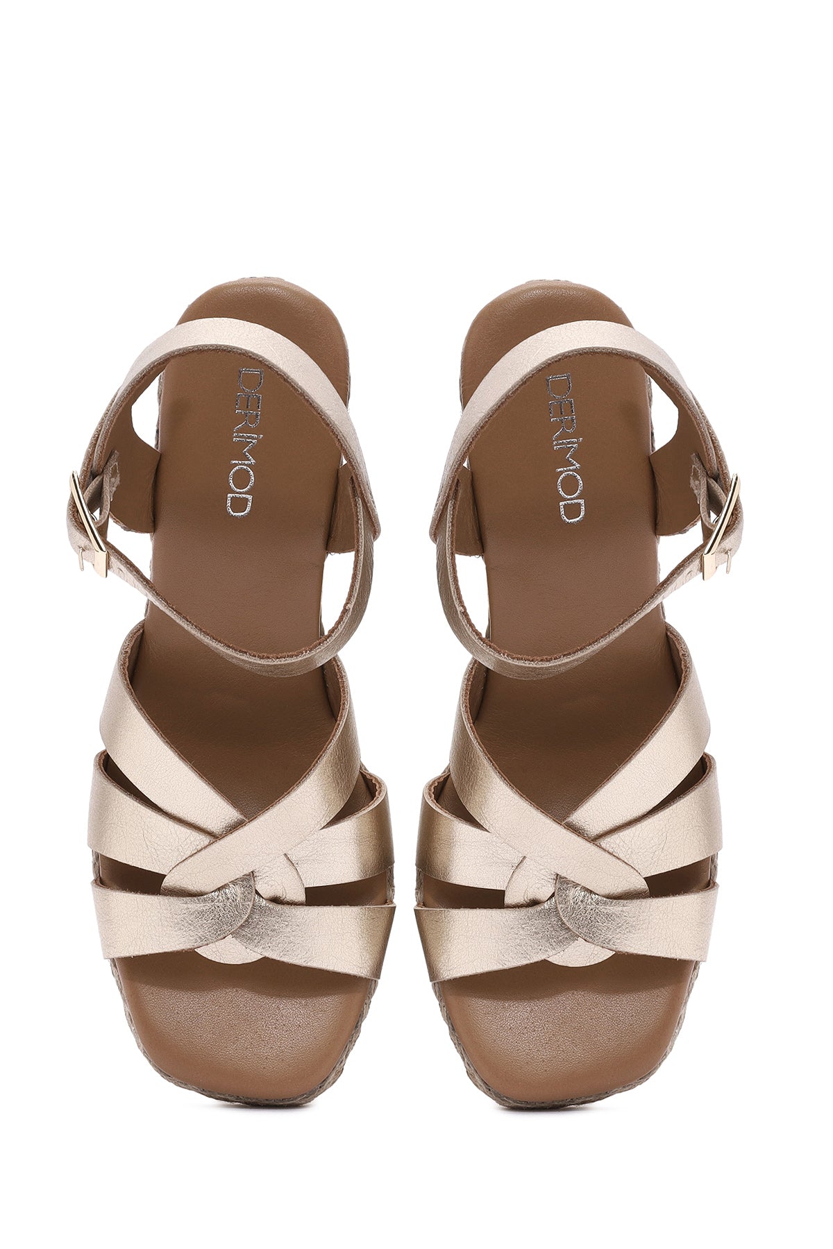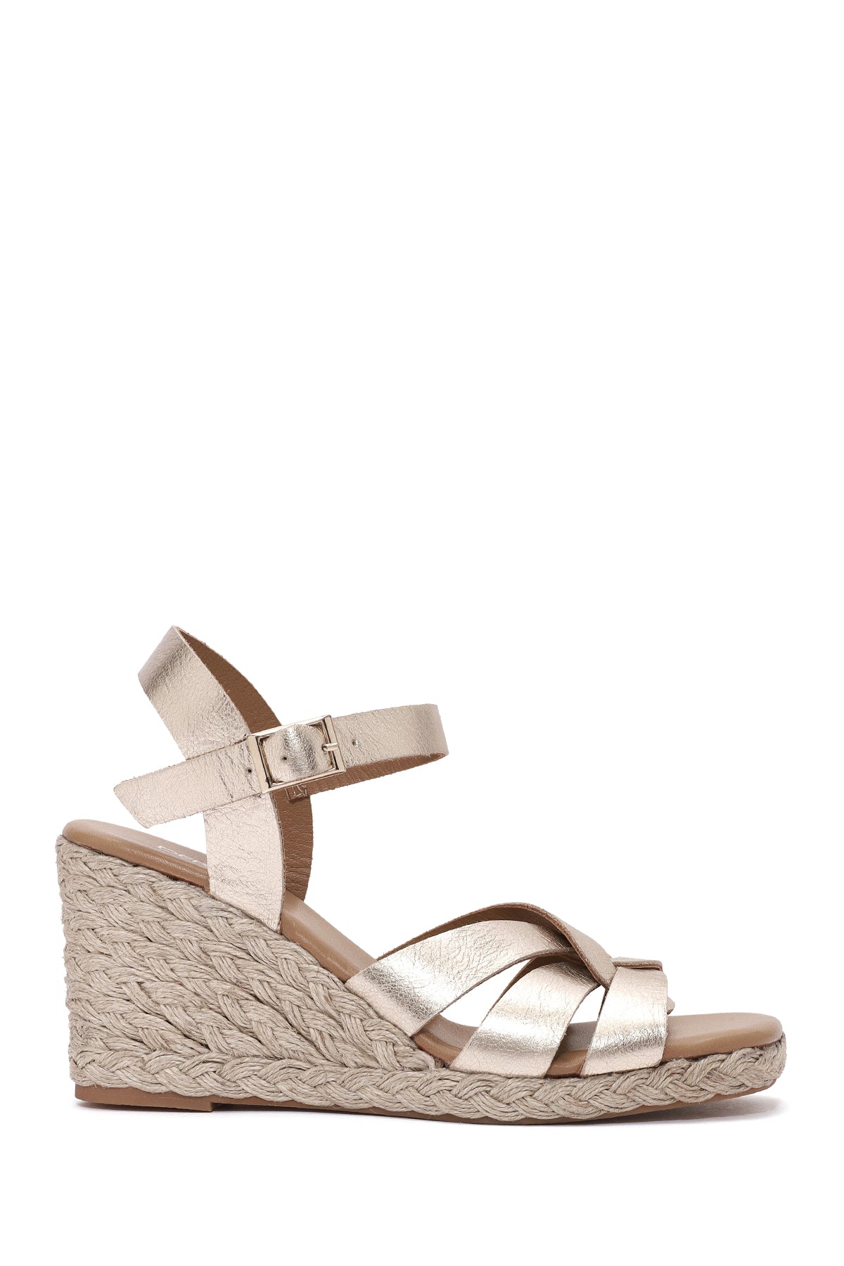 Derimod’un Zarifliği ve Şıklığı bir arada sunan Kadın Altın Bilekten Tokalı Dolgu Topuklu Metalik Deri Espadril Sandalet ile tarzınızı konuşturun. Ürünün kodu: 25SFD153332 LA