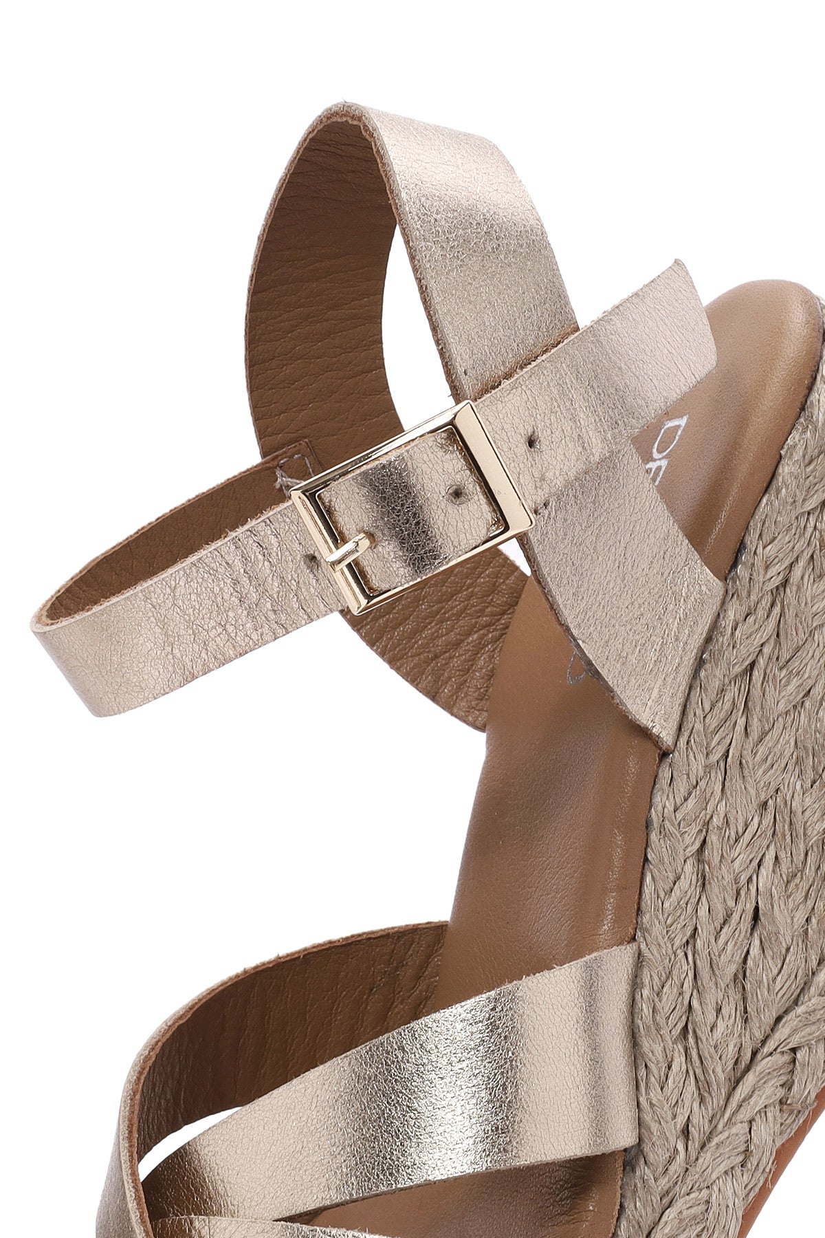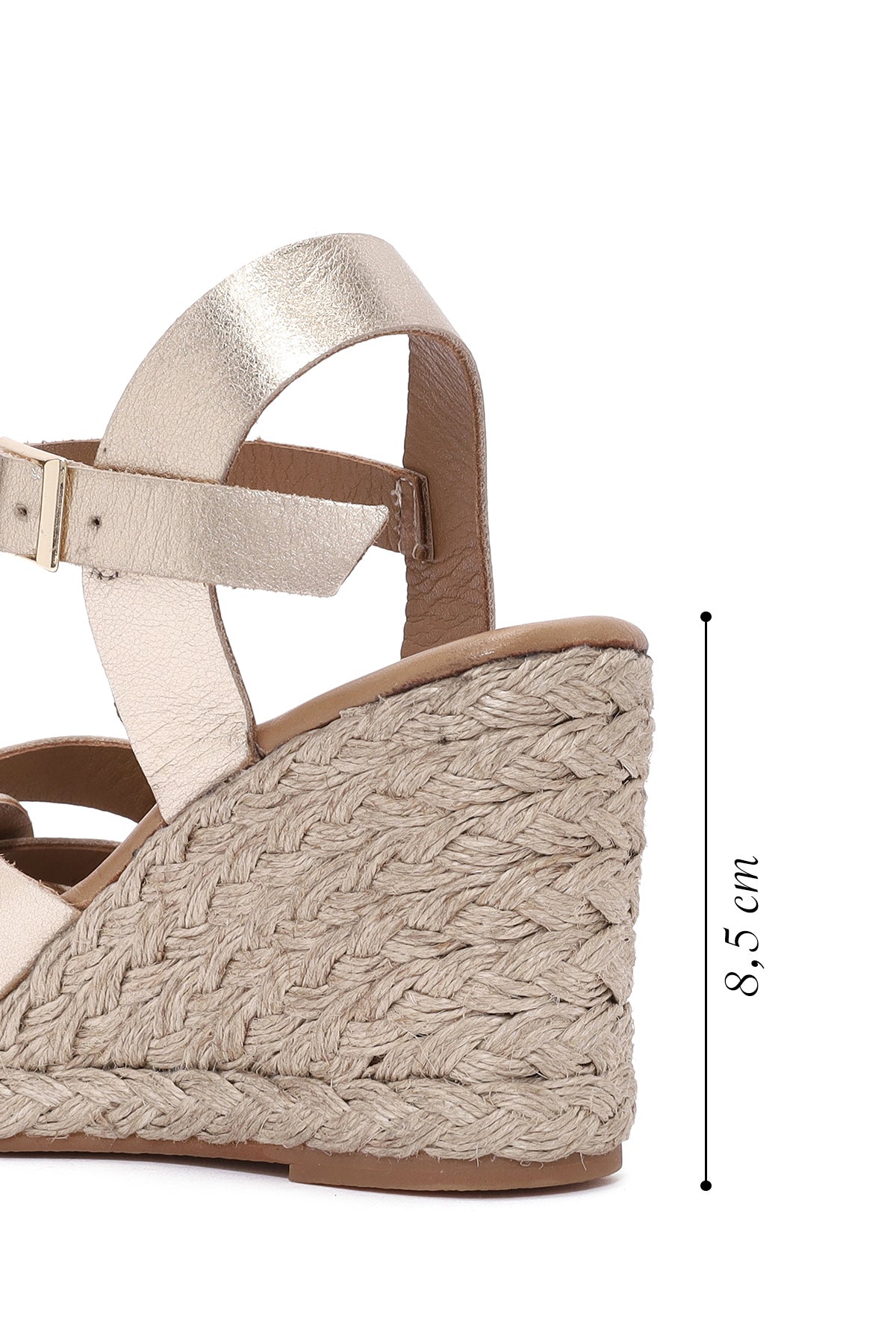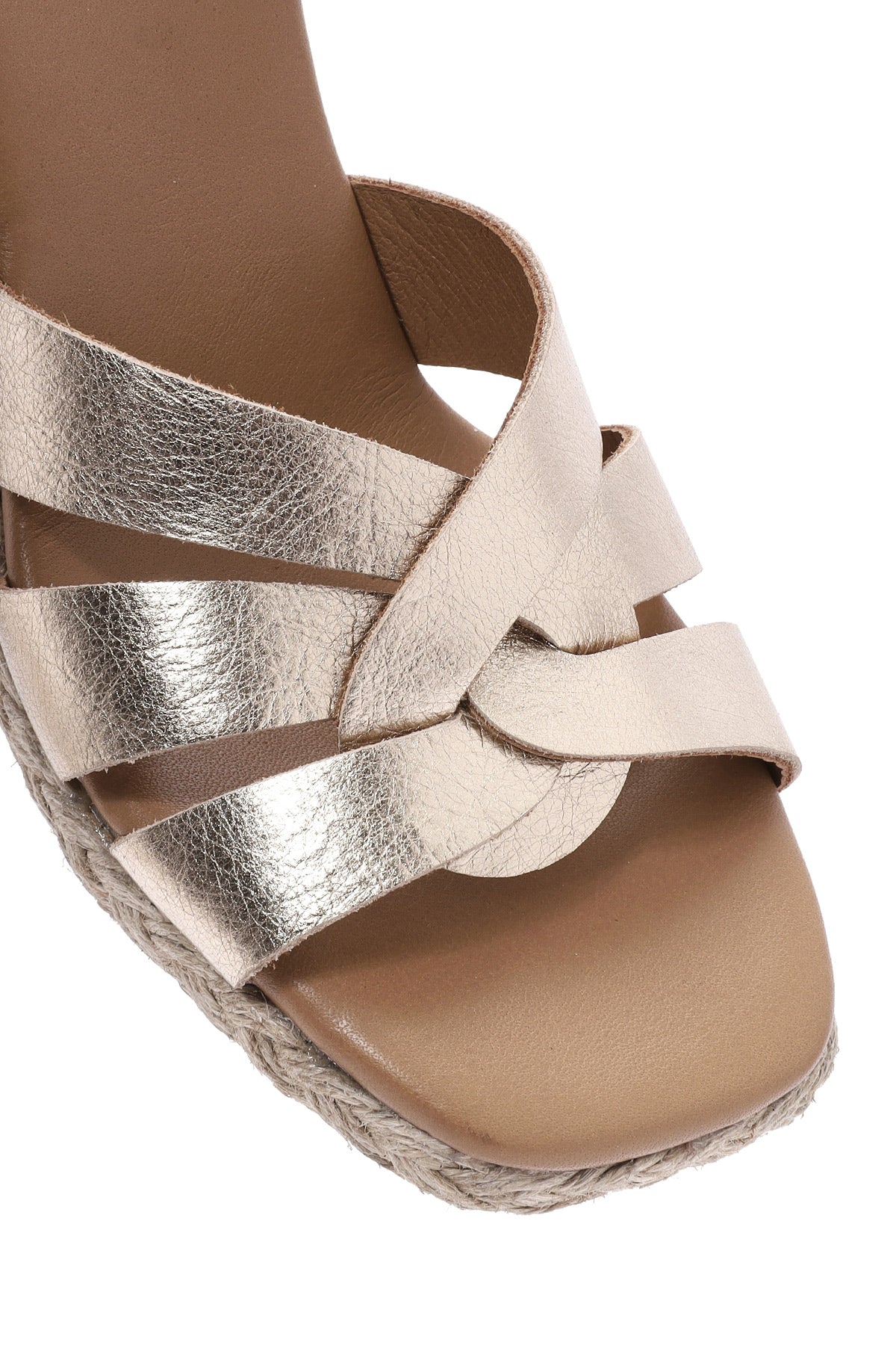 Derimod’un Zarifliği ve Şıklığı bir arada sunan Kadın Altın Bilekten Tokalı Dolgu Topuklu Metalik Deri Espadril Sandalet ile tarzınızı konuşturun. Ürünün kodu: 25SFD153332 LA