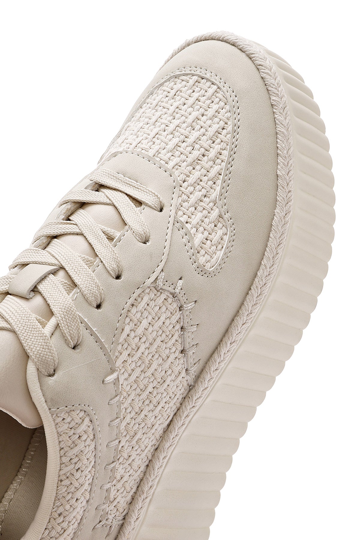 Derimod’un Zarif ve Şıklığı bir arada sunan Kadın Bej Bağcıklı Kalın Tabanlı Örgülü Sneaker ile tarzınızı konuşturun. Ürünün kodu: 26PFD430414 05