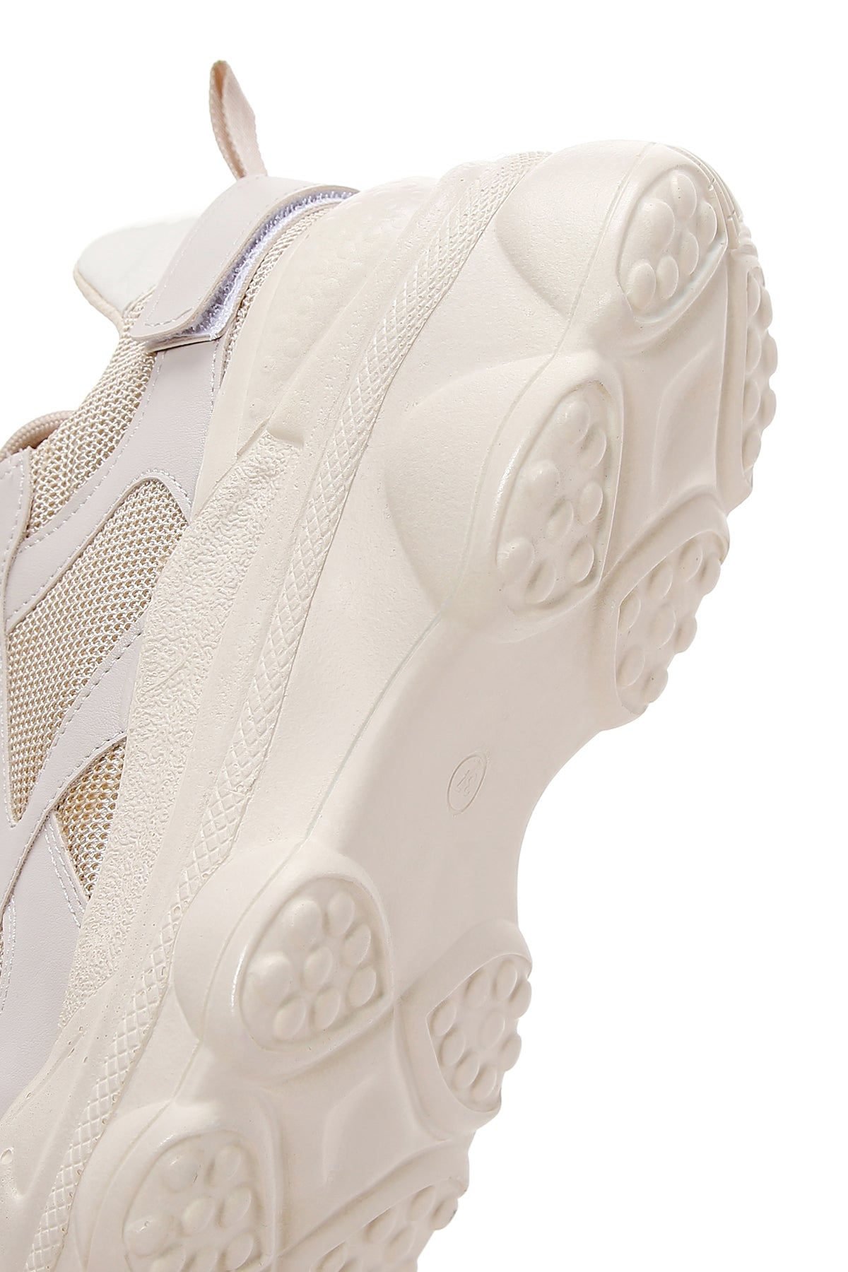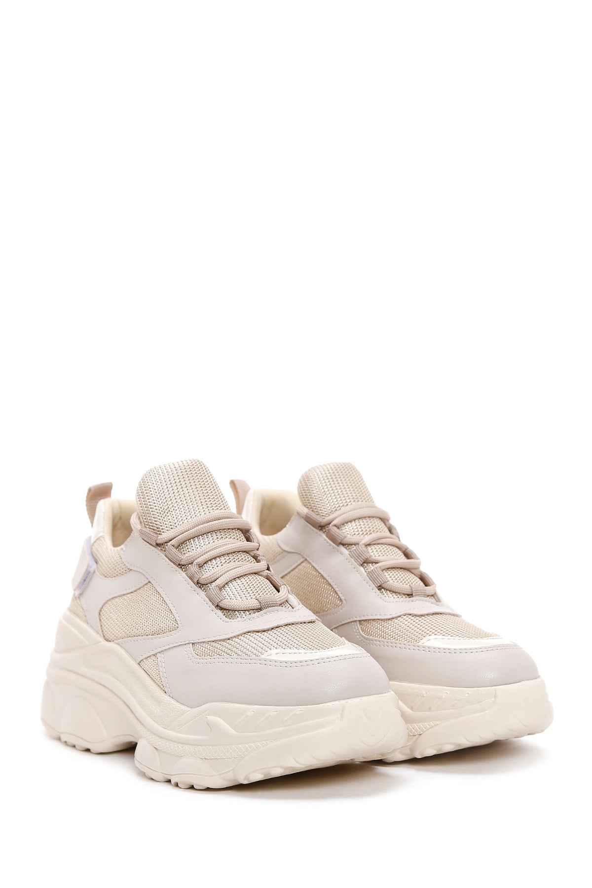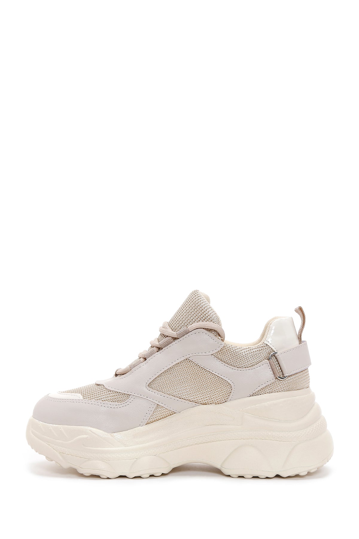 Derimod'un bej kadın sneaker'ı, günlük kullanımda hem stil hem de konfor arayan kadınlar için tasarlanmış özel bir ayakkabı modelidir. Sentetik malzemeden üretilen bu kalın tabanlı kadın sneaker'ı, bağcık detayı ile ayağa uygun bir destek sağlar. Üzerindeki delikli desen yapısı, ayakkabıya modern bir görünüm kazandırırken nefes alabilirlik özelliği de sunar. 5 cm yüksekliğindeki kalın taban yapısı, günlük yürüyüşlerde ekstra rahatlık ve yükseklik sağlar. Tekstil iç astarı ile ayak sağlığını destekleyen bu bej sneaker, şehir hayatının dinamik temposuna uyum sağlayan yapısıyla öne çıkar. Bağcıklı tasarımı sayesinde ayağa tam uyum gösteren model, farklı giyim tarzlarıyla kolayca kombinlenebilir. Beyaz renkli taban kenarındaki dikişli detaylar, ayakkabının estetik görünümünü tamamlarken dayanıklılığını da artırır. Sentetik kadın sneaker kategorisinde özel bir yere sahip olan bu model, günlük aktivitelerde güvenilir bir seçenek sunar. Ürün kodu: 26PFE220114