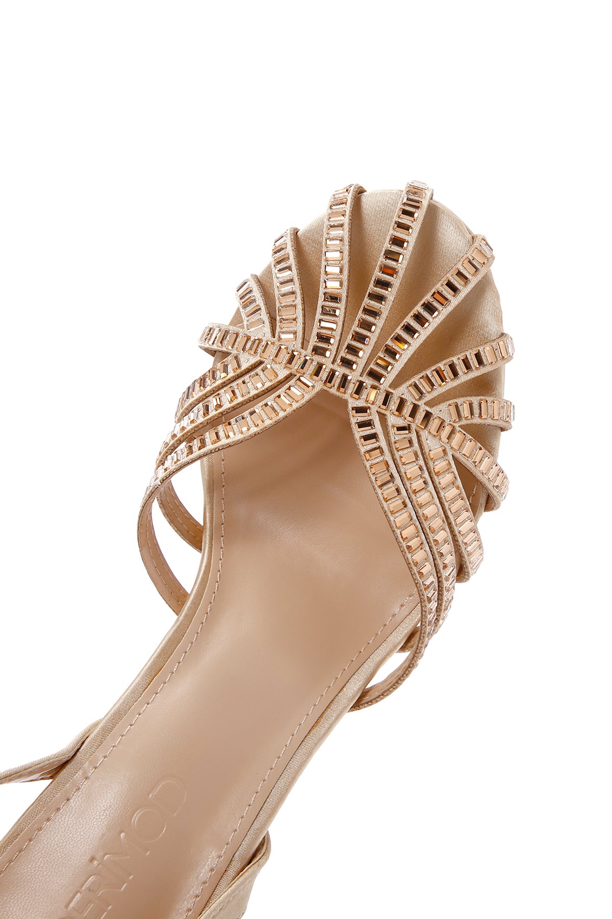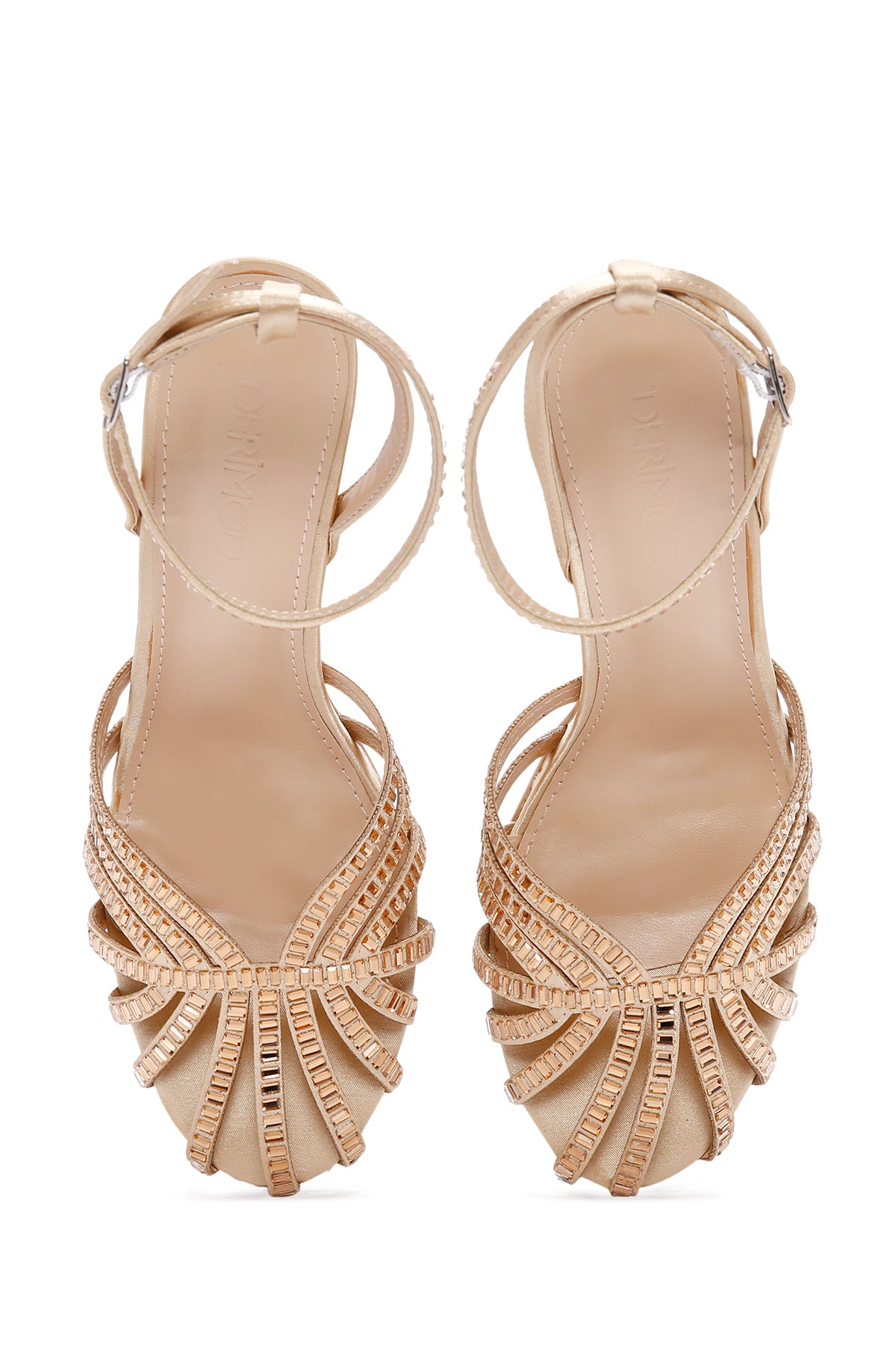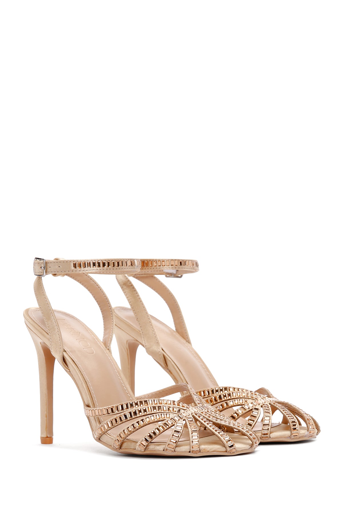 Kadın Bej Bilekten Bantlı Taşlı İnce Topuklu Sandalet