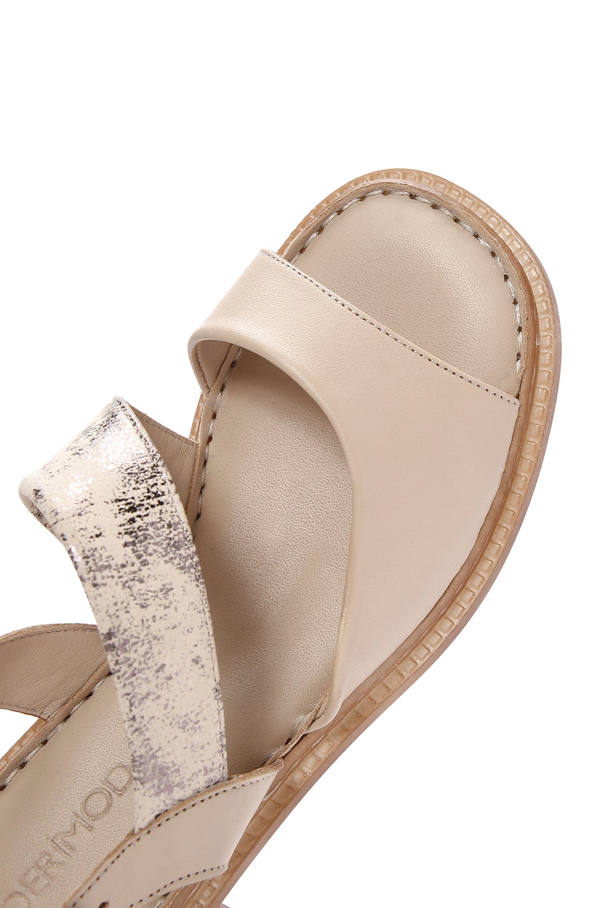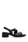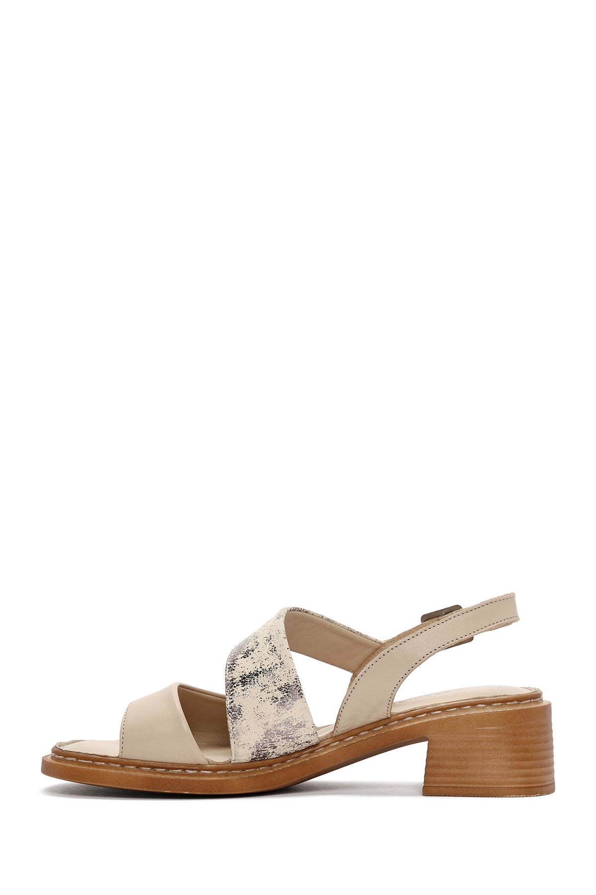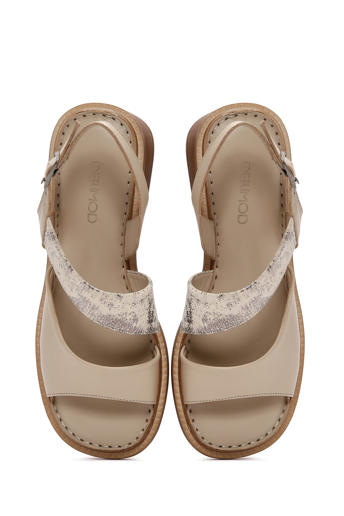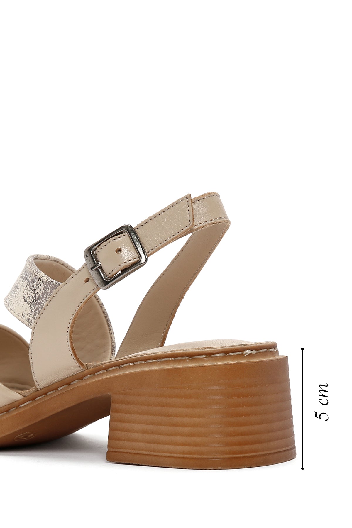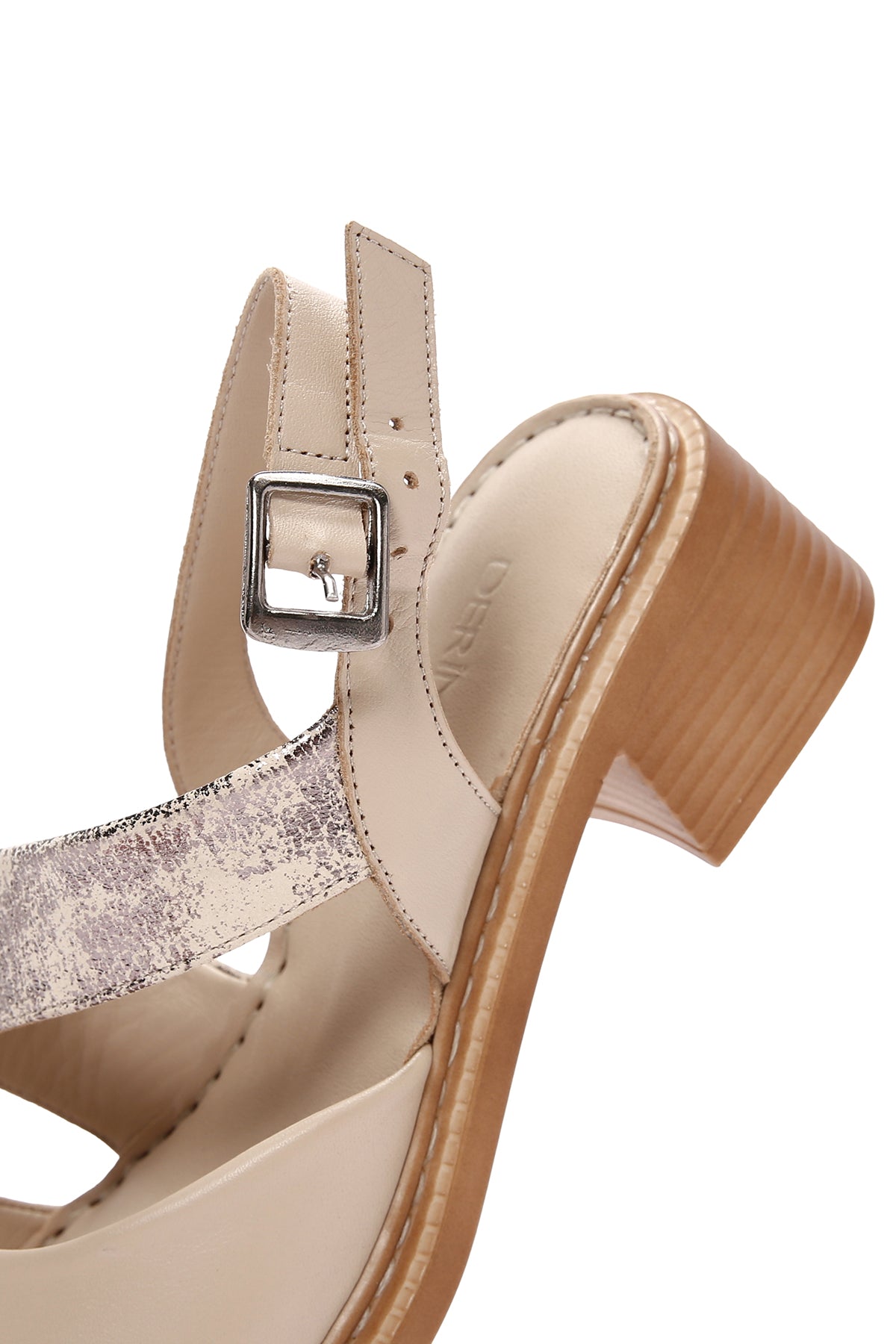 Kadın Bej Kalın Kısa Topuklu Bilekten Bantlı Deri Sandalet