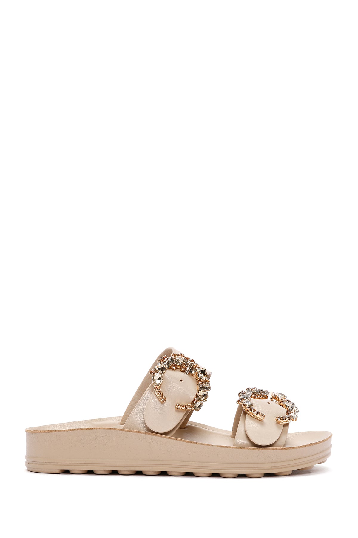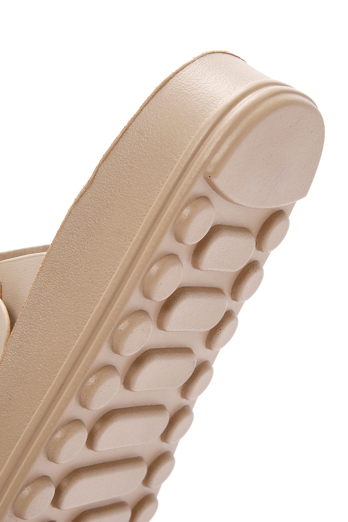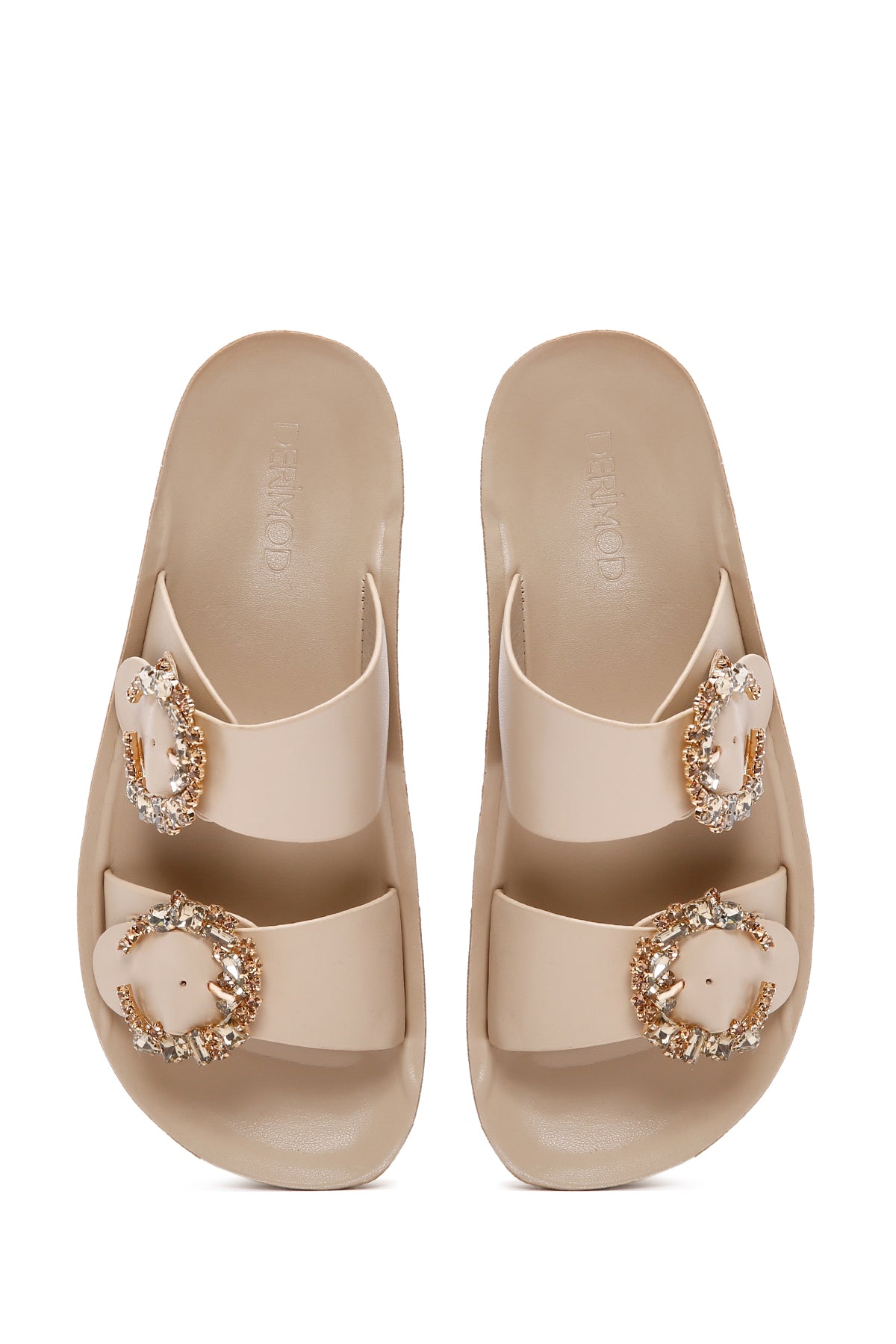 Kadın Bej Taşlı Çift Tokalı Kalın Tabanlı Comfort Terlik