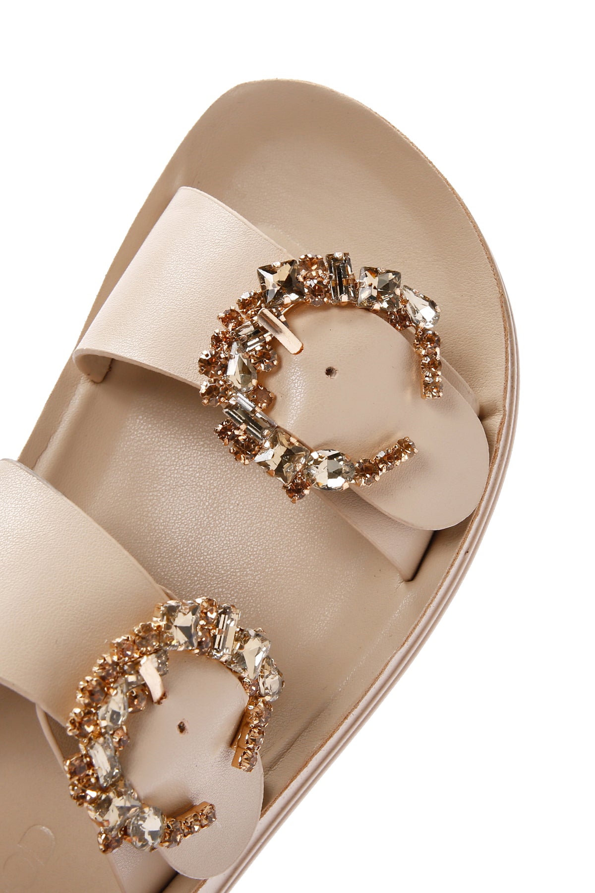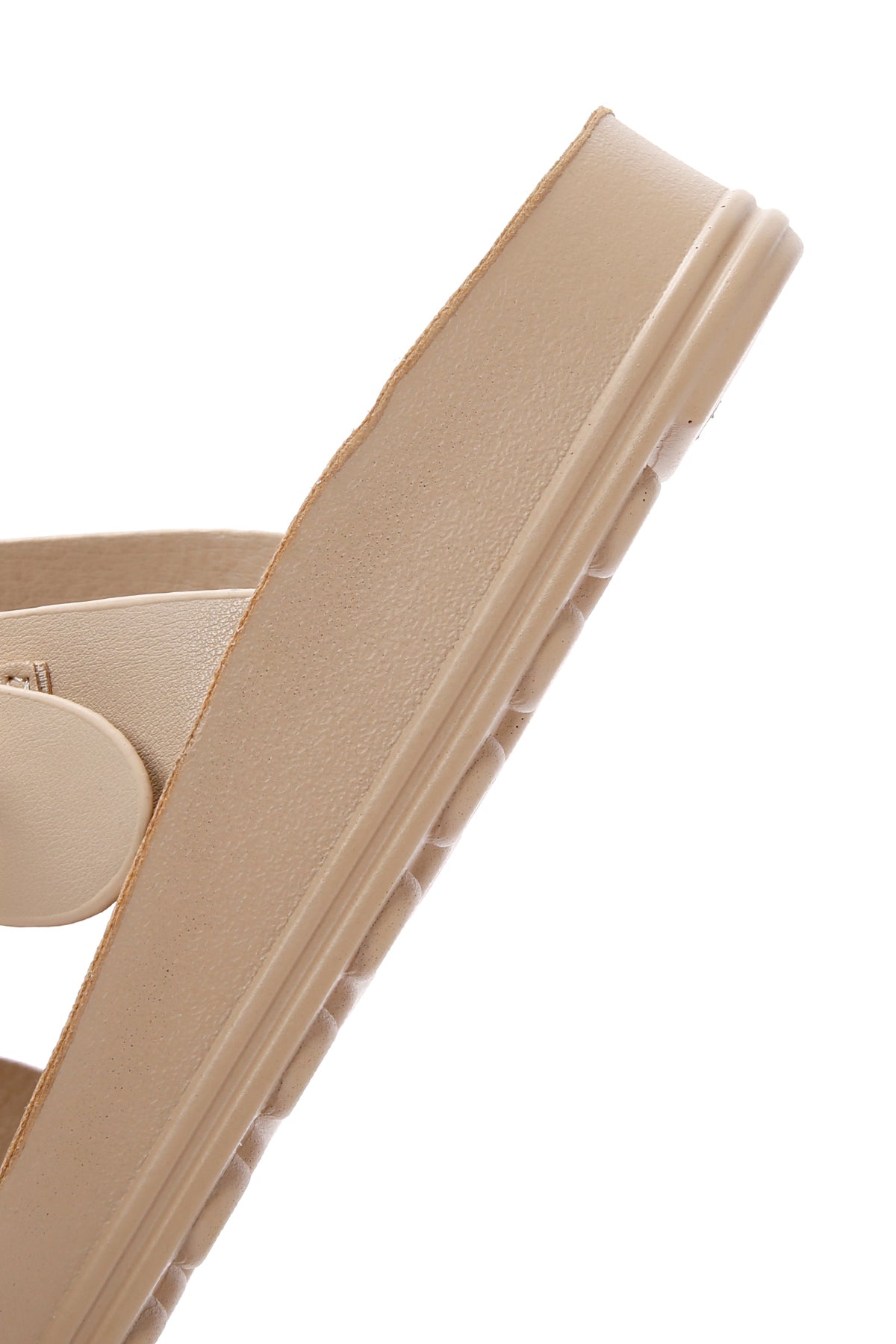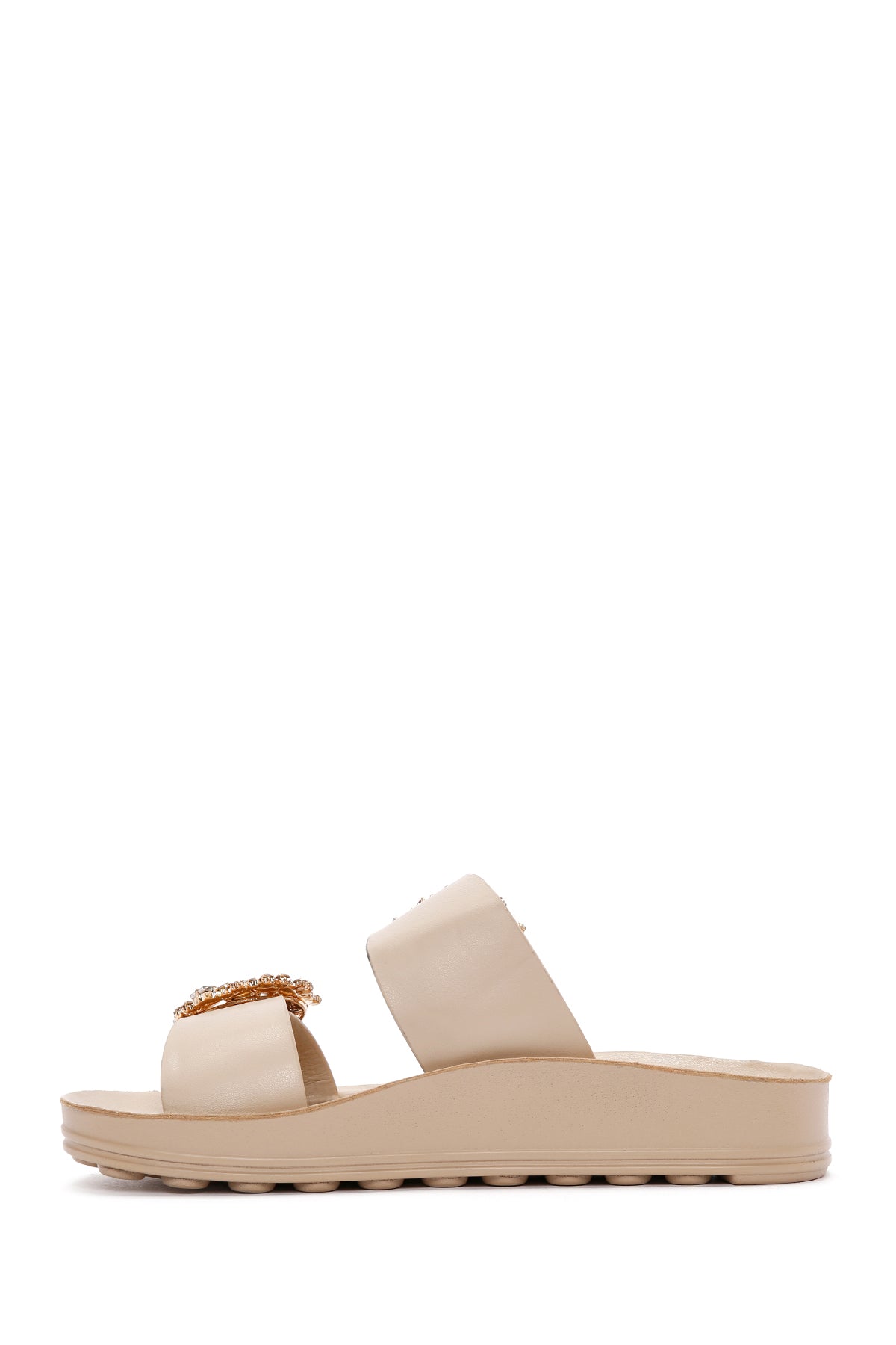Kadın Bej Taşlı Çift Tokalı Kalın Tabanlı Comfort Terlik