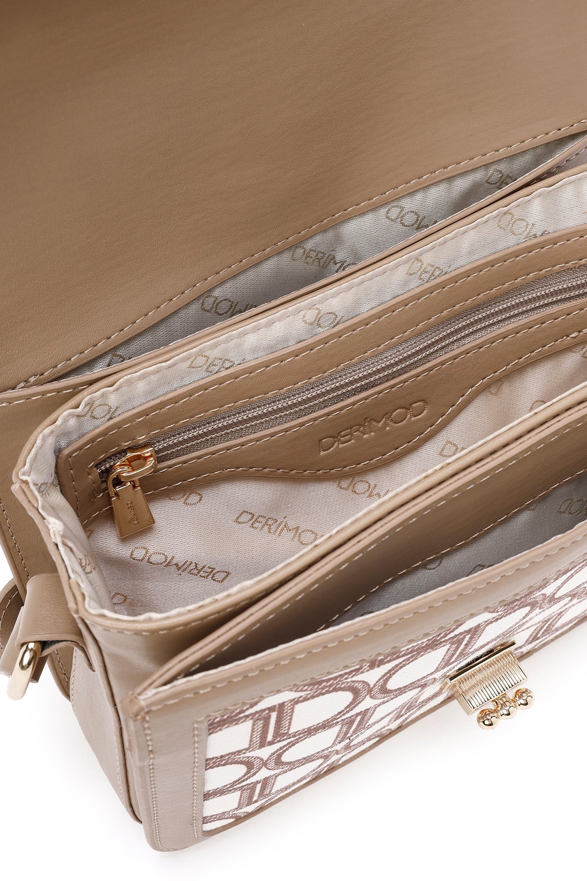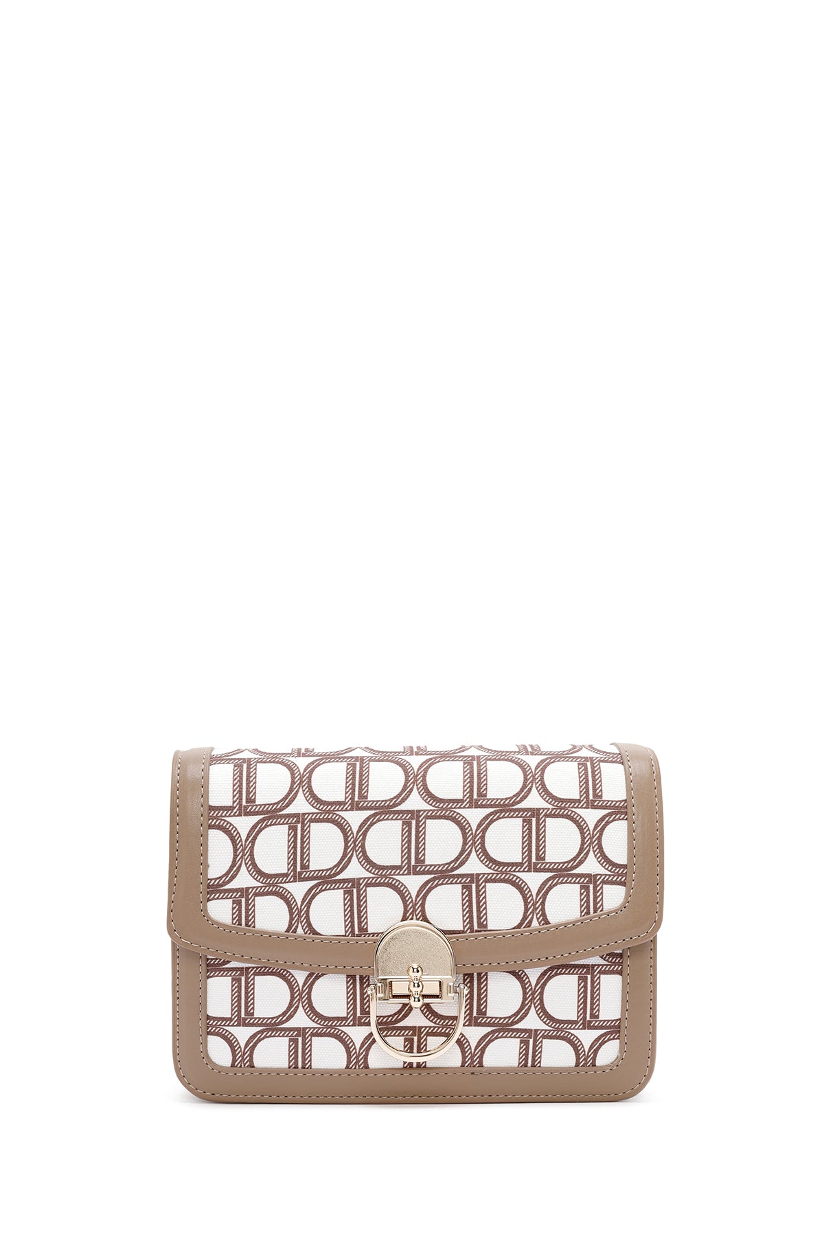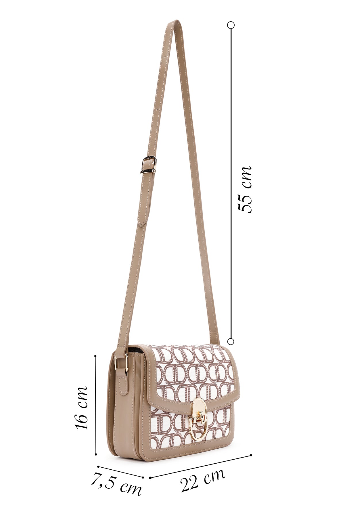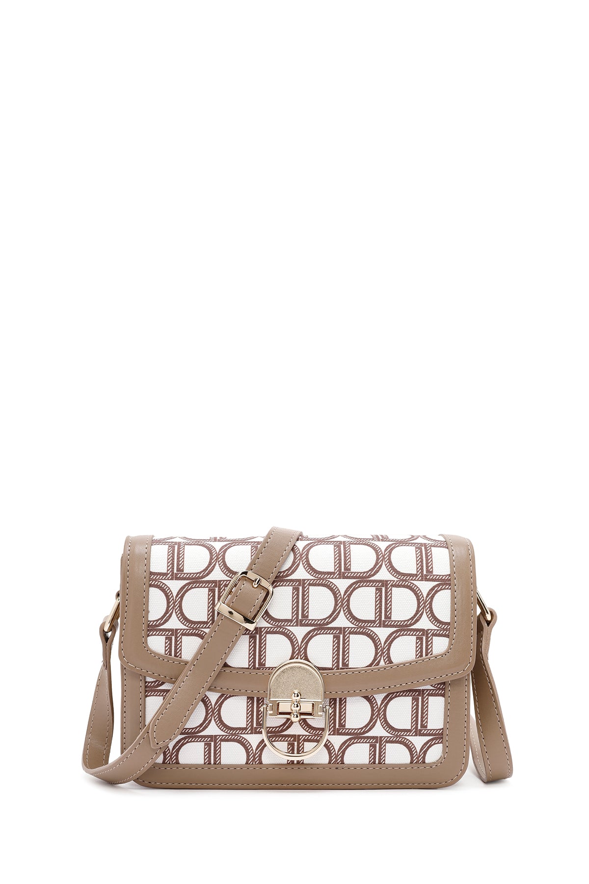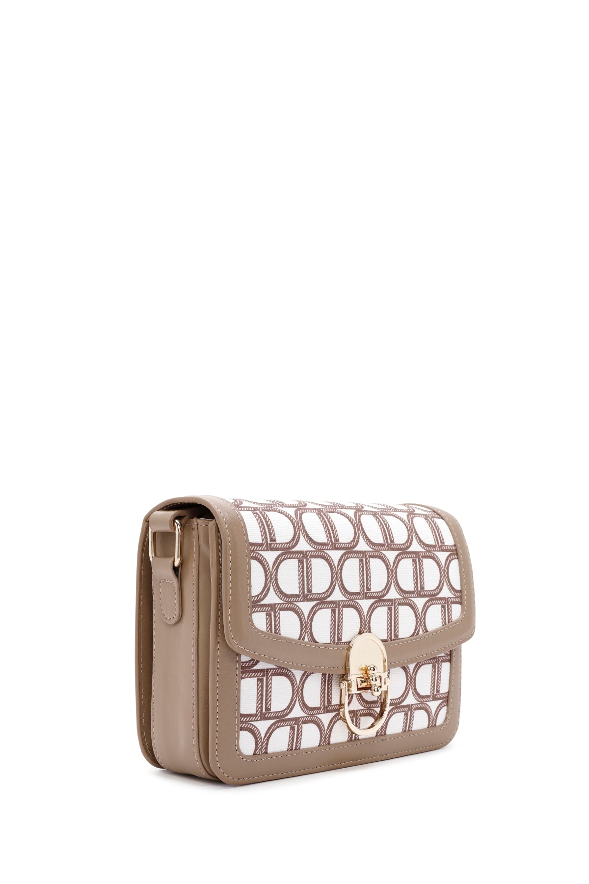 Kadın Bej Uzun Askılı Kumaş Monogram Desenli Çapraz Çanta