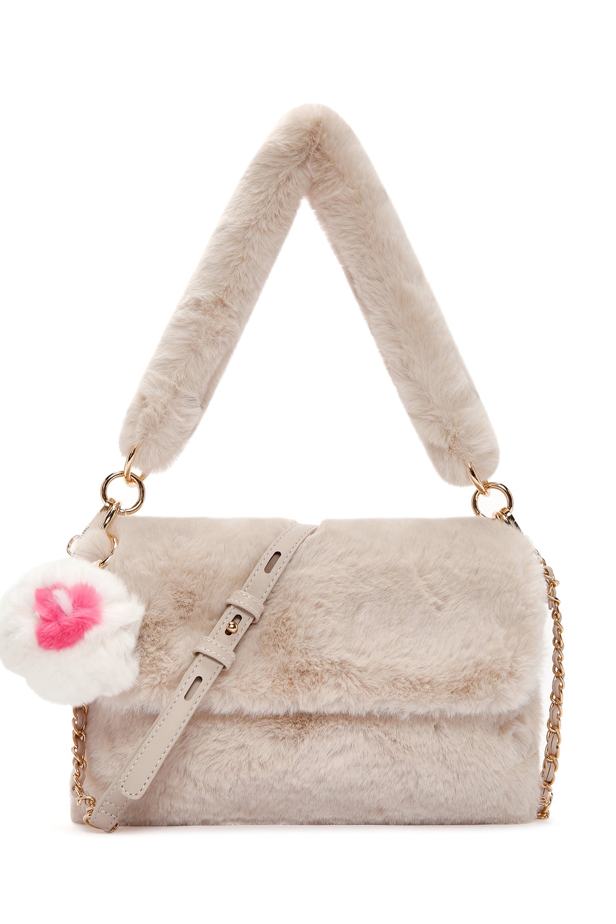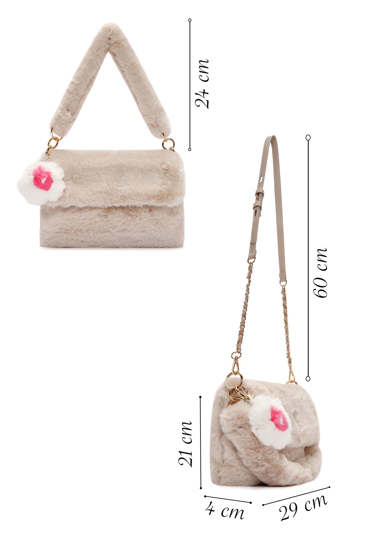 Kadın Bej Uzun Askılı Peluş Omuz Çantası, kış aylarında stilinizi tamamlamak için mükemmel bir seçimdir. Peluş yapısı ile soğuk havalarda sıcaklık ve şıklık sunarken, dikkat çekici aksesuar detayı ile stilinize renk katar. İki boy askı seçeneği sunarak, çantayı hem omuzda hem de çapraz şekilde taşımanıza olanak tanır. Şık ve zarif tasarımıyla her türlü kıyafetle uyum sağlar. Yumuşak ve konforlu malzemesi, gün boyu rahatlık sağlar. Kadın Bej Uzun Askılı Peluş Omuz Çantası, kış mevsiminde stilinize hem şıklık hem de fonksiyonellik katmak için ideal bir aksesuardır. Ürünün ebatları 30x4x20 cm olup, uzun askı uzunluğu 60 cm ve kısa askı uzunluğu 24 cm'dir. Ürünün kodu: 23WBD2509PH 2K