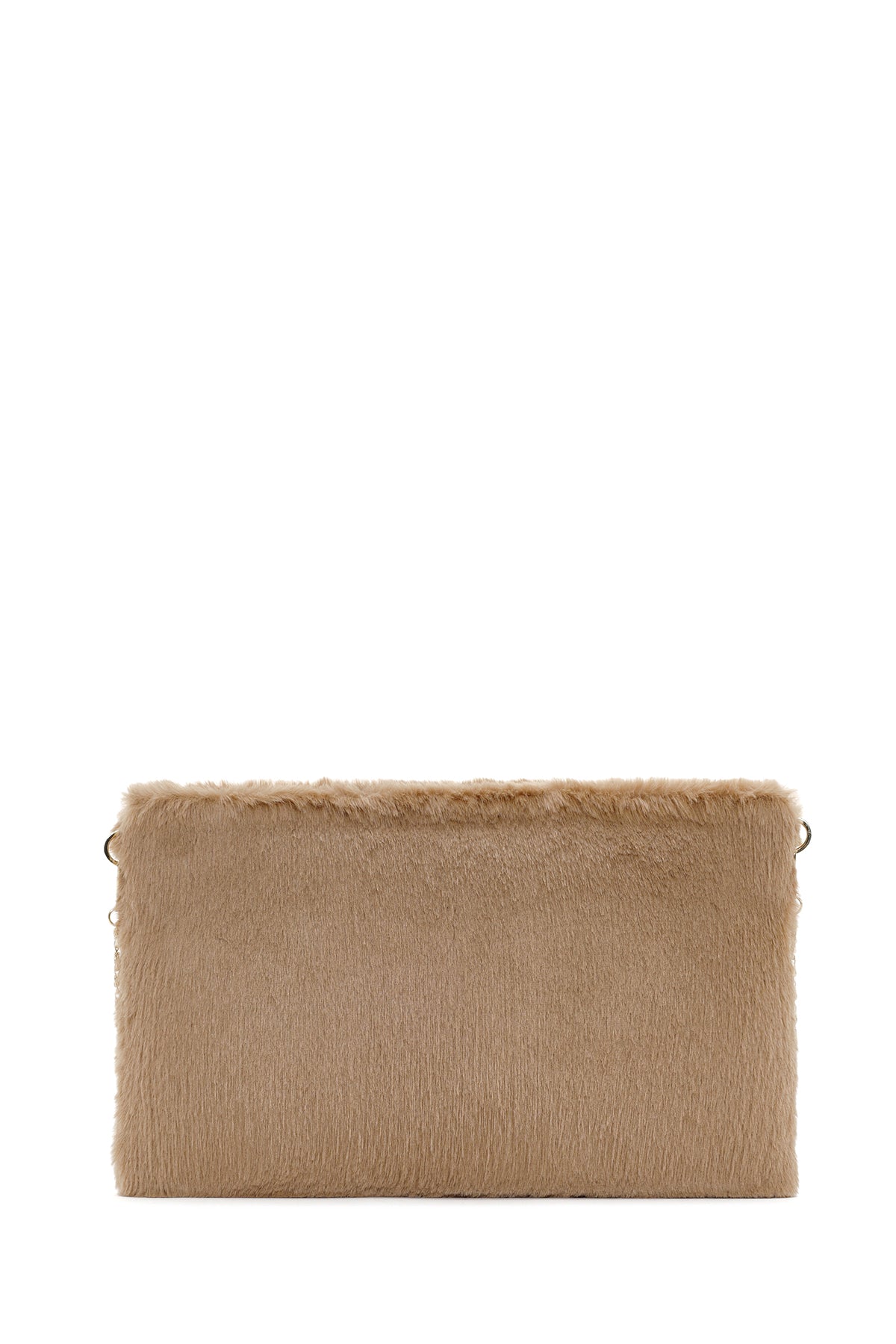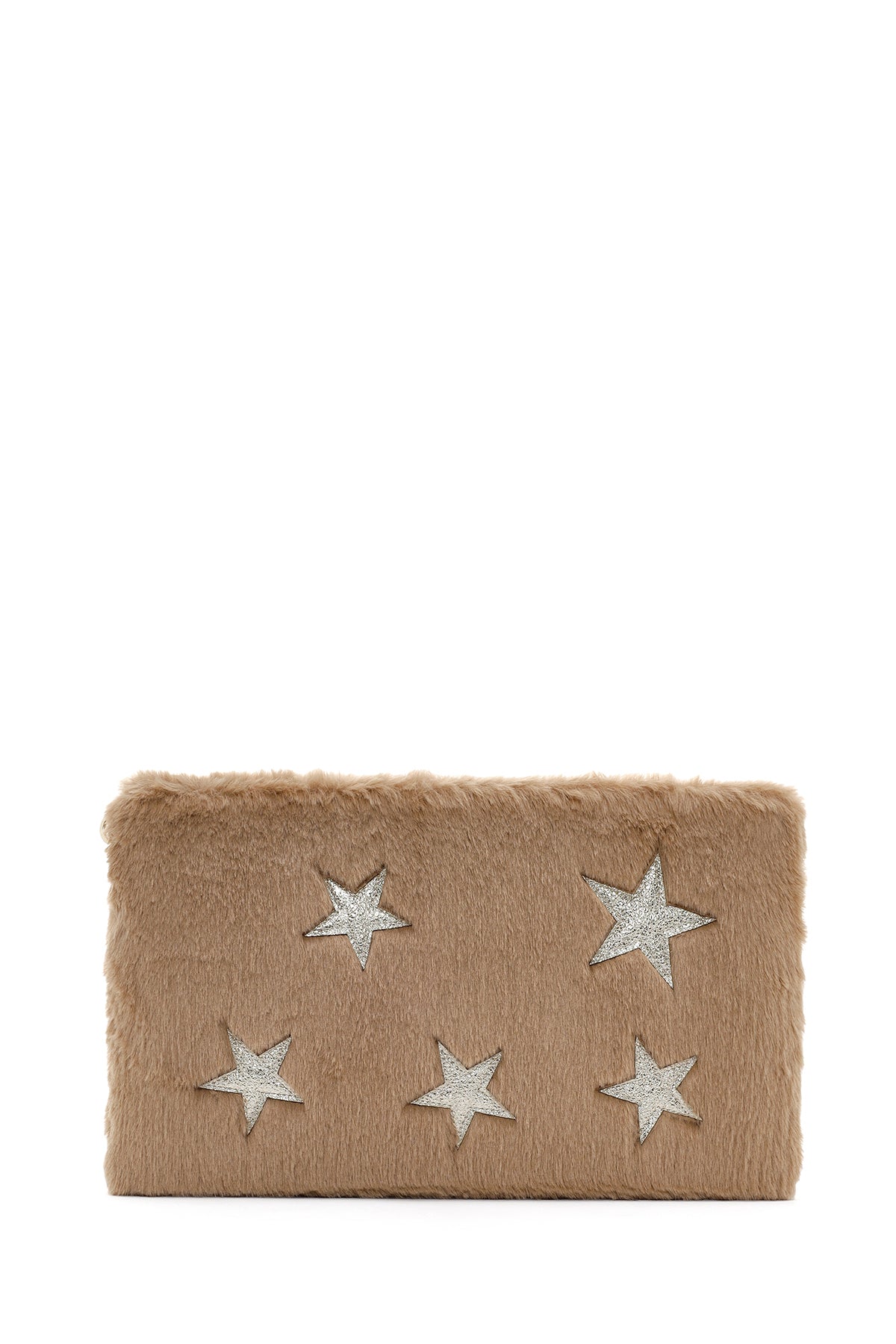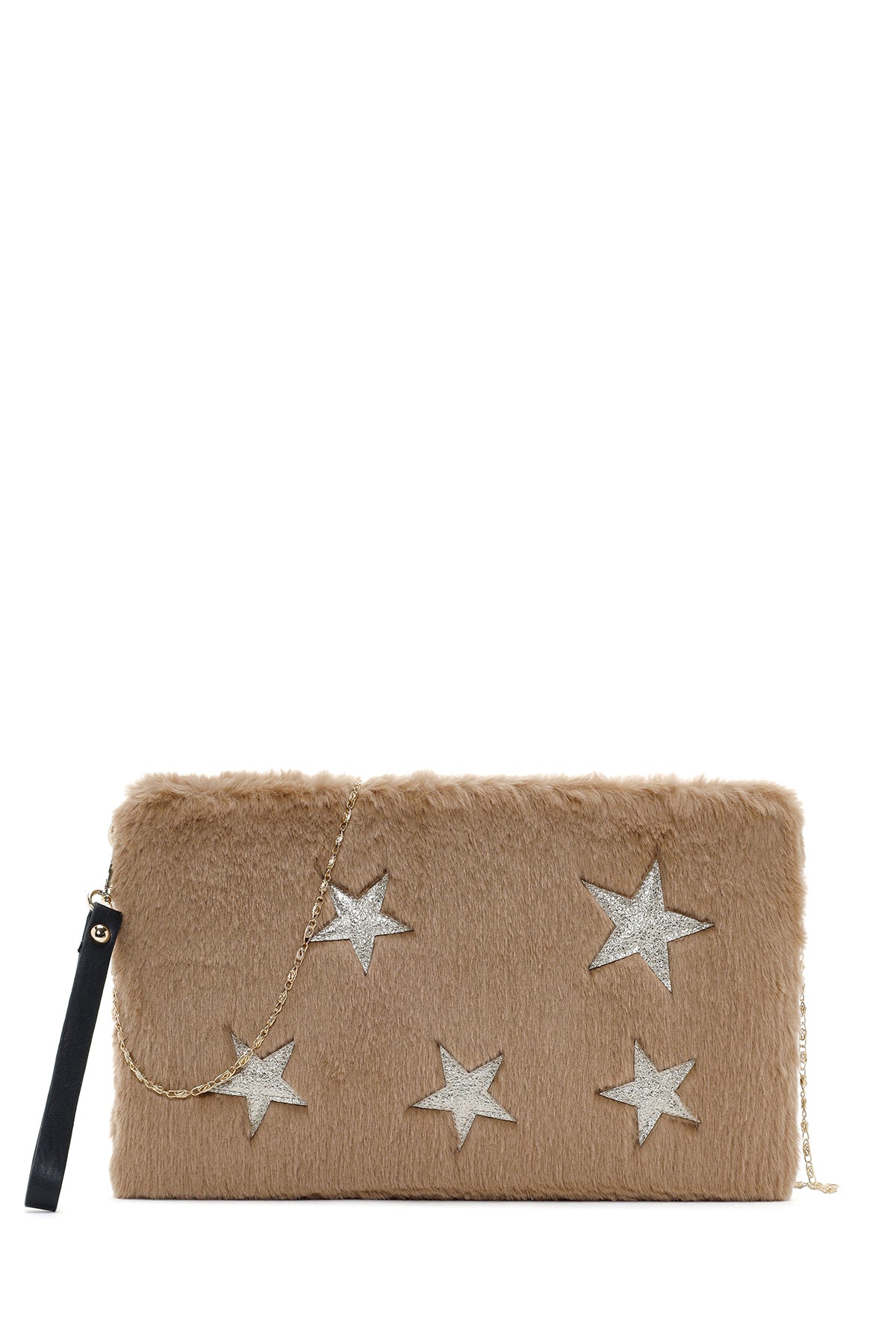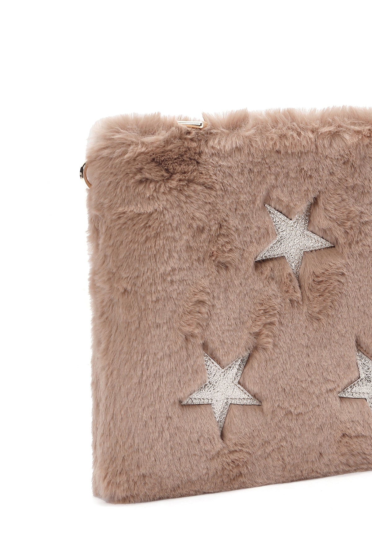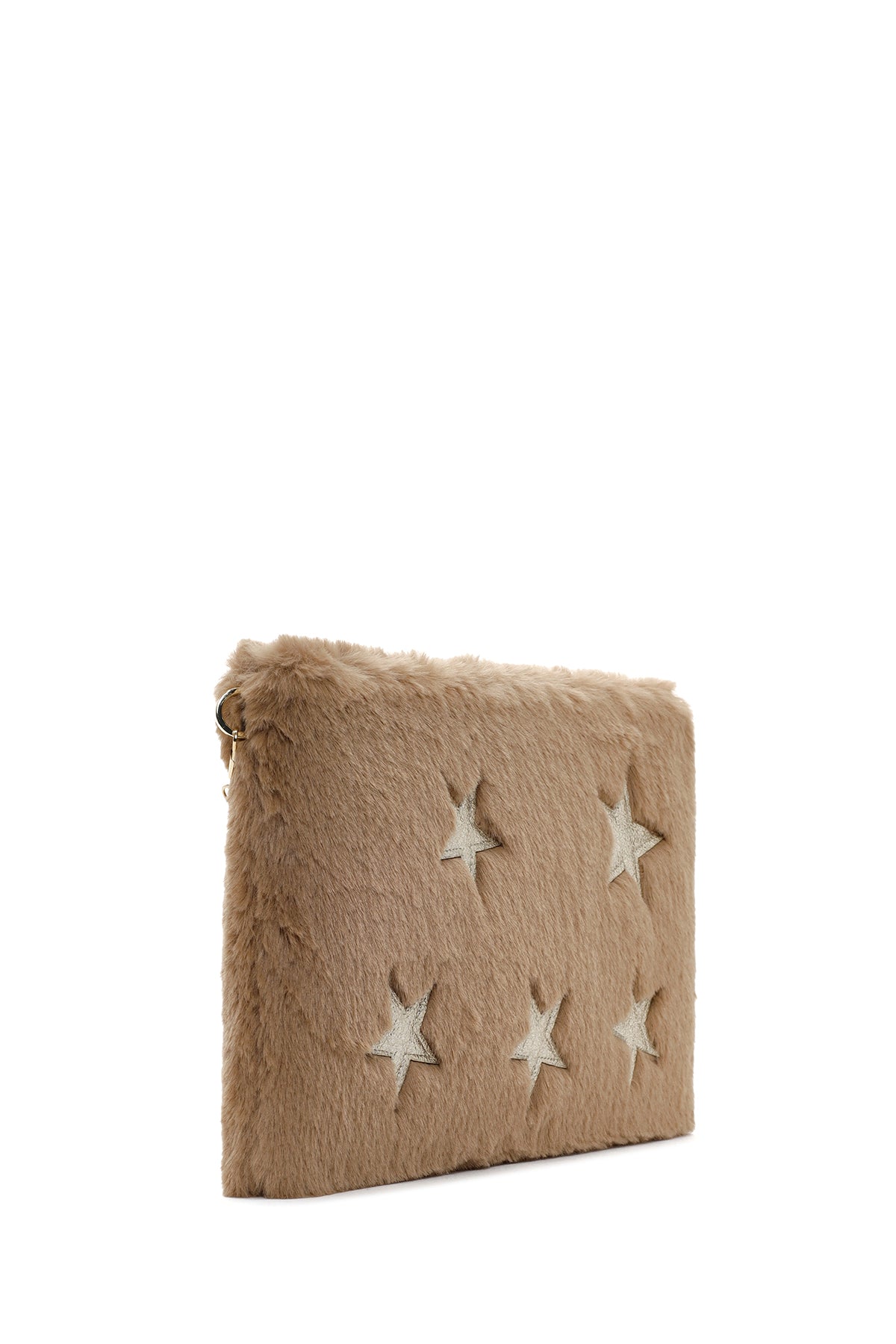 Kadın Bej Uzun Zincir Askılı Yıldız Desenli Peluş Portföy Çanta