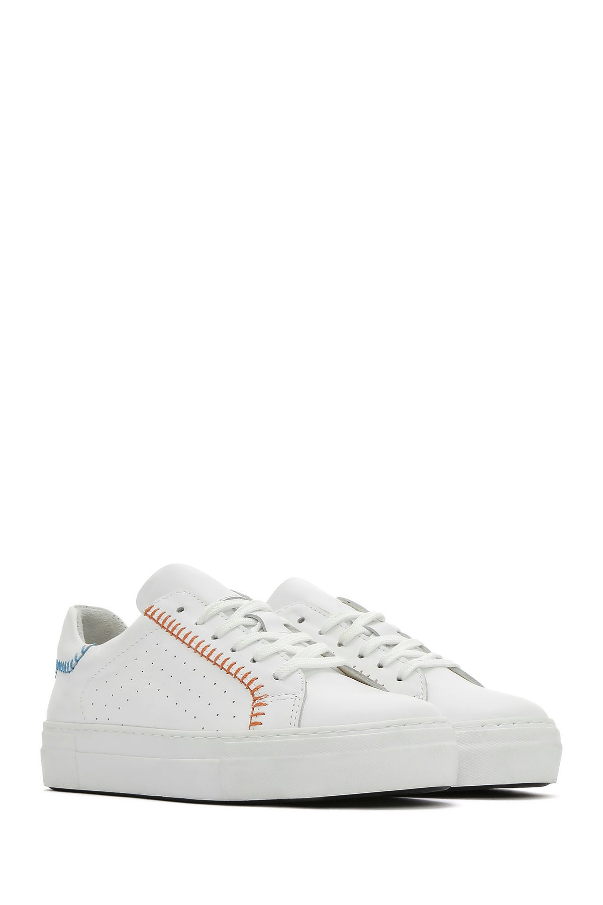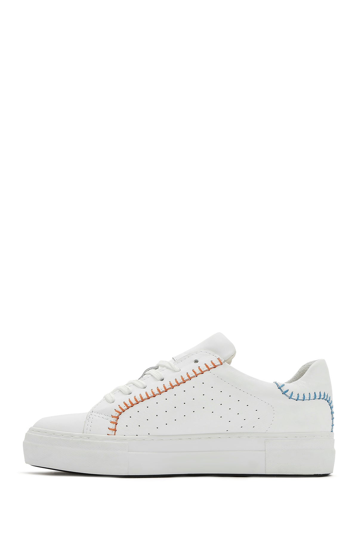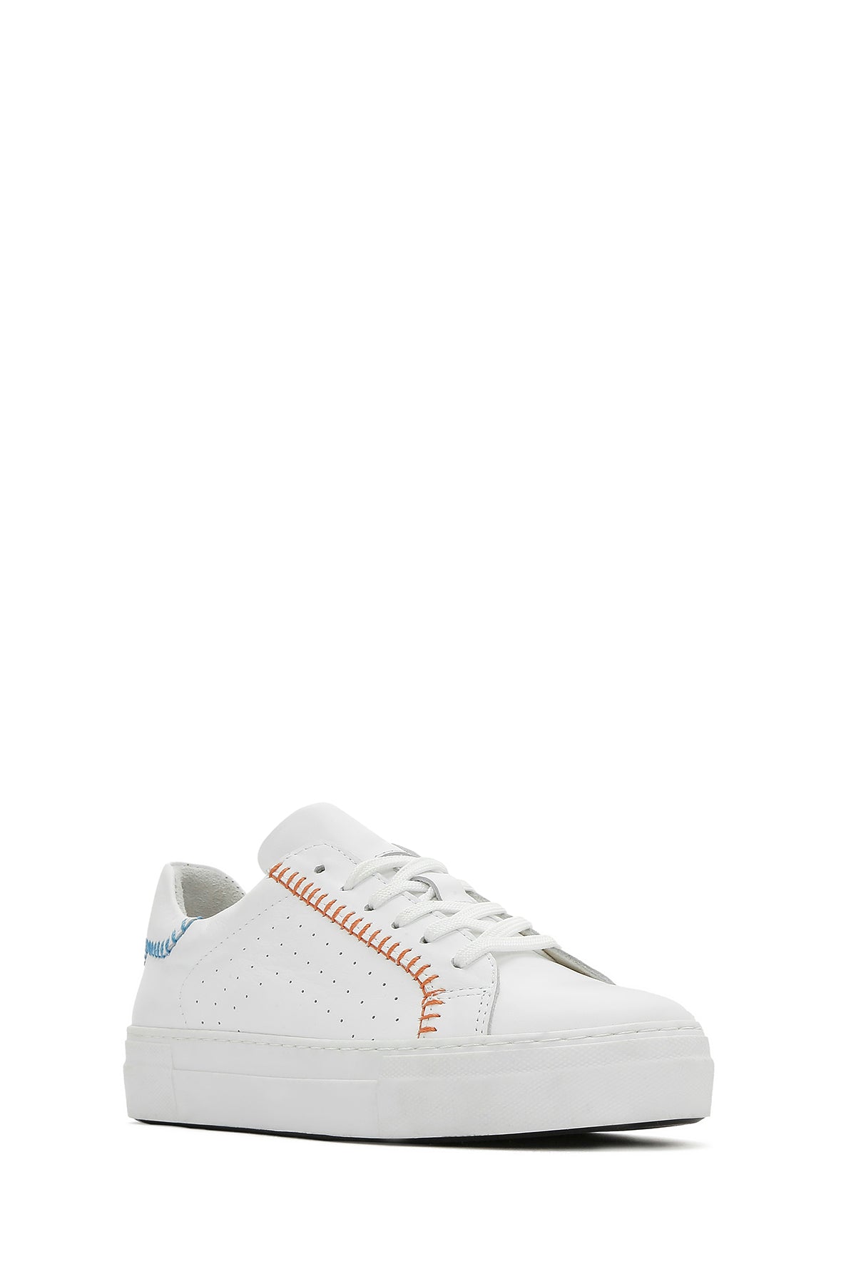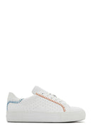 Derimod'un yaz koleksiyonundan, vidala deri ile üretilen beyaz sneaker modeli, 2,5 cm yüksekliğindeki tabanı ile günlük kullanıma uygun bir tasarım sunuyor. Turuncu dikiş detayları ve yanlardaki delikli desenleriyle beyzbol temalı bir görünüm sergileyen model, %80 kumaş ve %20 deri karışımlı iç astarı sayesinde ayağınızı rahat ettiriyor. Bağcıklı yapısı ile ayağa tam oturan sneaker, jean'lerden spor takımlara, günlük elbiselerden casual kombinlere kadar geniş bir kullanım alanı sunuyor. İlkbahar ve yaz mevsimlerinde günün her saatinde kullanılabilir. Ürün kodu: 25SFD371218