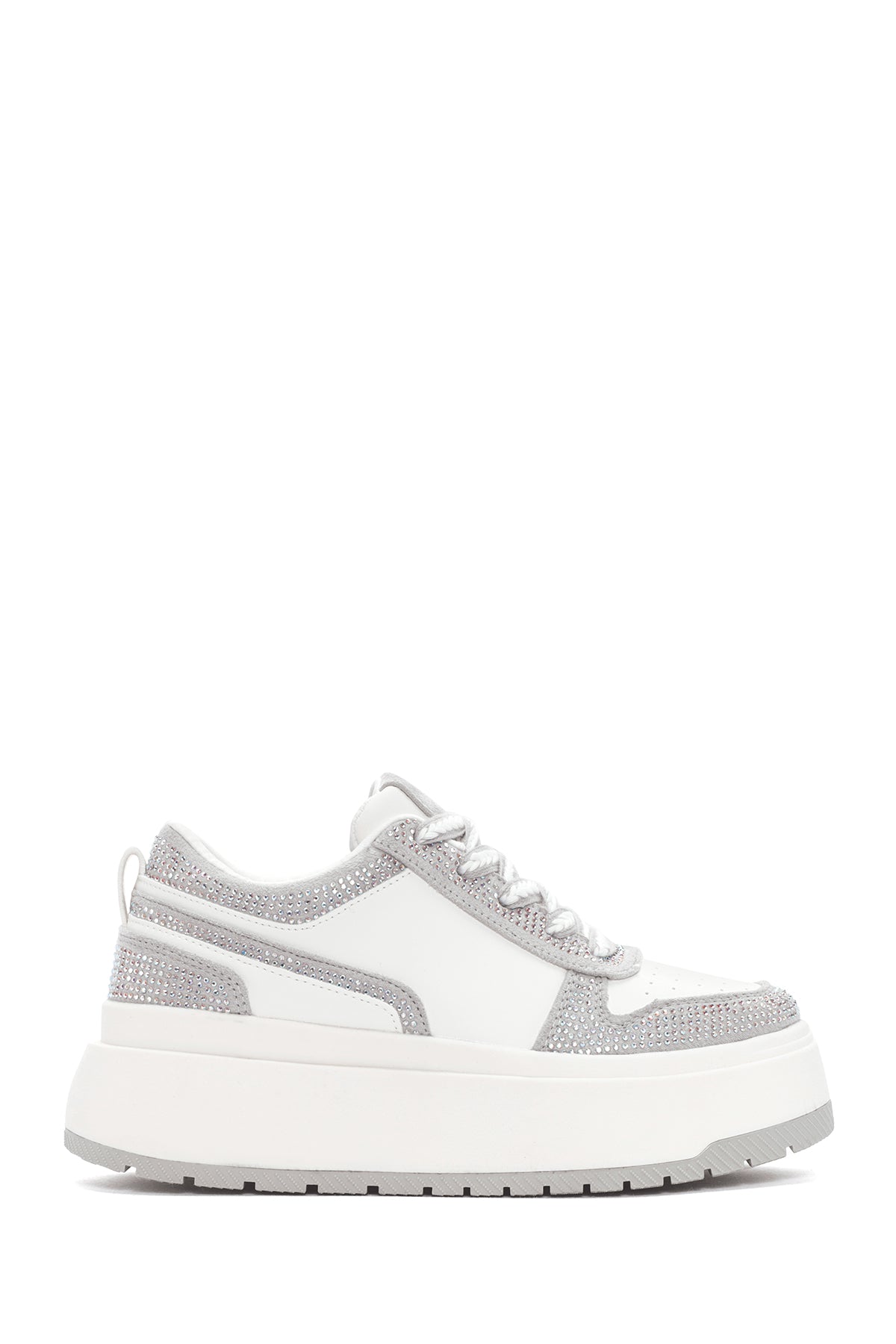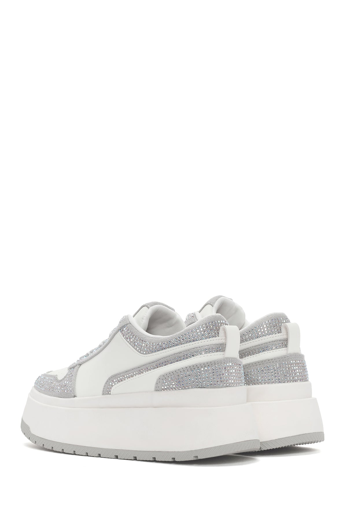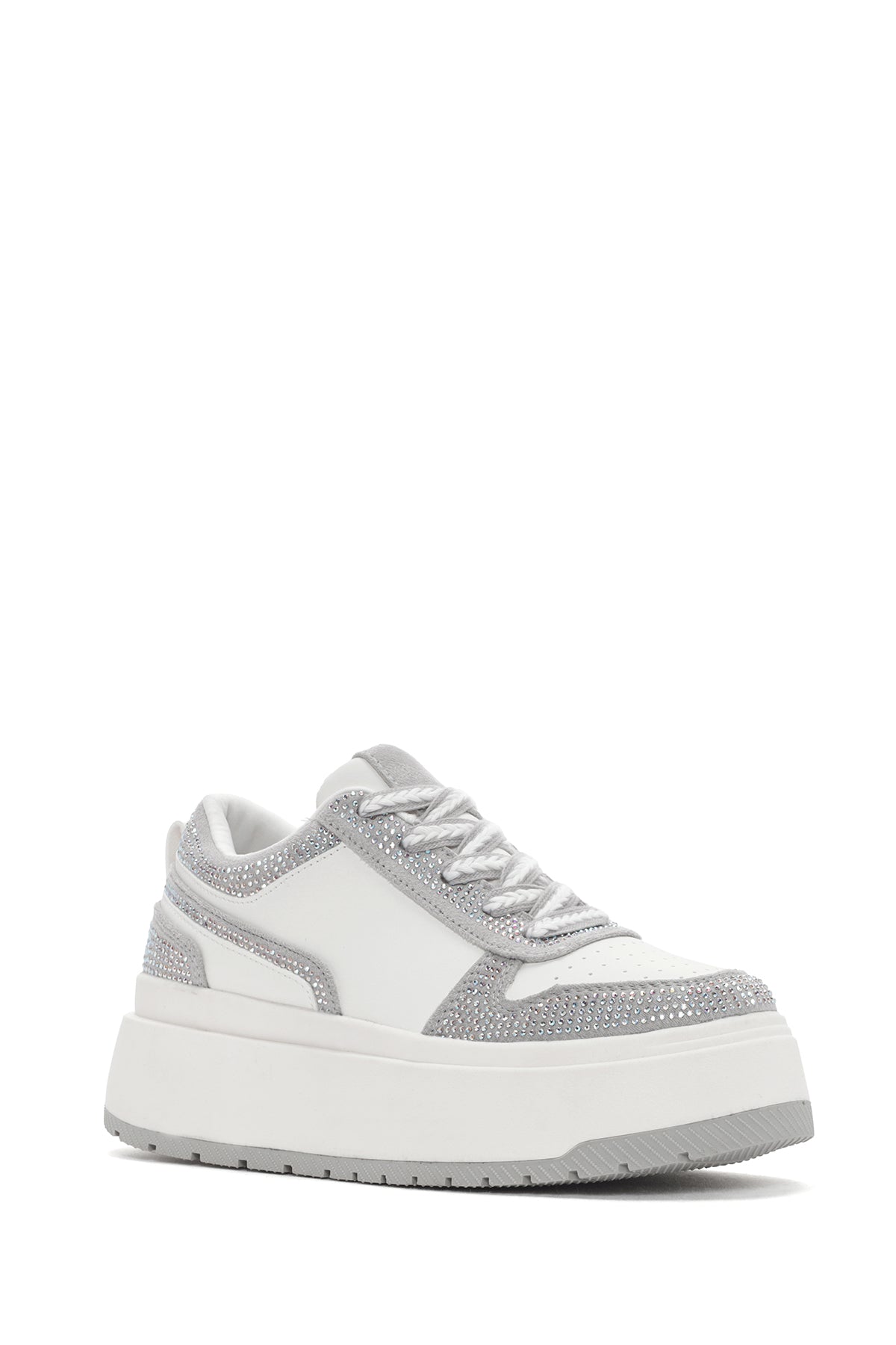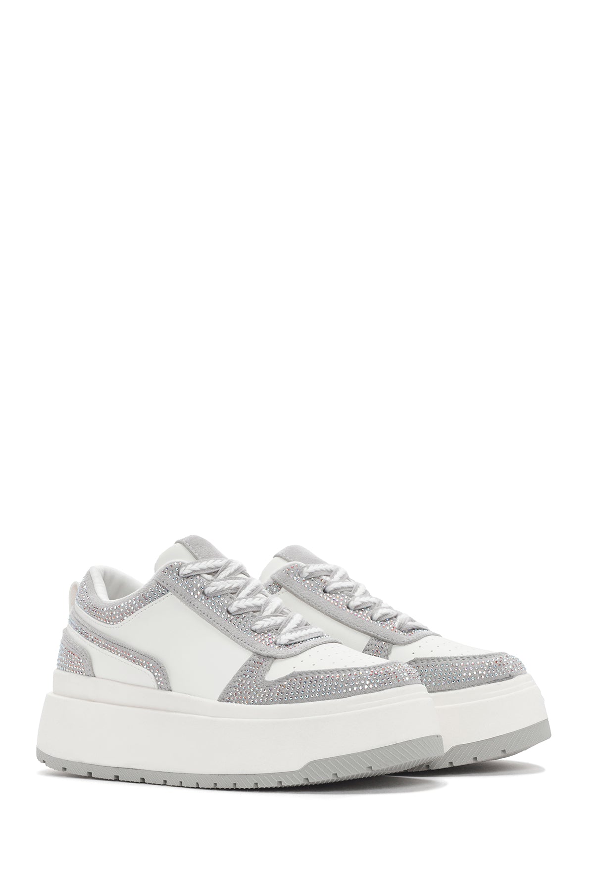 Kadın Beyaz Kalın Tabanlı Taşlı Bağcıklı Sneaker
